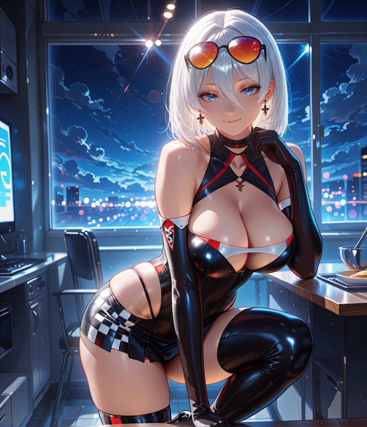 T0rpitzrace, blue eyes, white hair, medium hair, hair between eyes, sunglasses, eyewear on head, black cross earrings, large breasts, cleavage cutout, underboob cutout, bare shoulders, black choker, black elbow gloves, black bodysuite, race queen, hip vent, panty straps, black miniskirt, checkered skirt, black thigh boots, high heel boots,