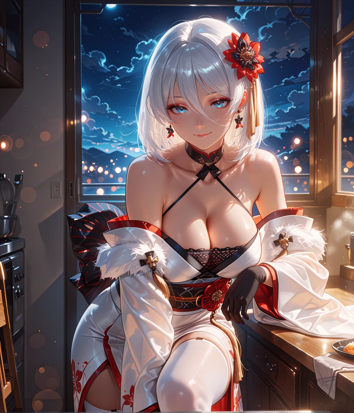 T0rpitzchina, blue eyes, white hair, medium hair, hair between eyes, red earrings, hair flower, tassel, large breasts, white kimono, cleavage, choker, halterneck, long sleeves, wide sleeves, red trim, black gloves, white fur trim, lace trim, black obi, obi bow, white thighhighs, sandals,