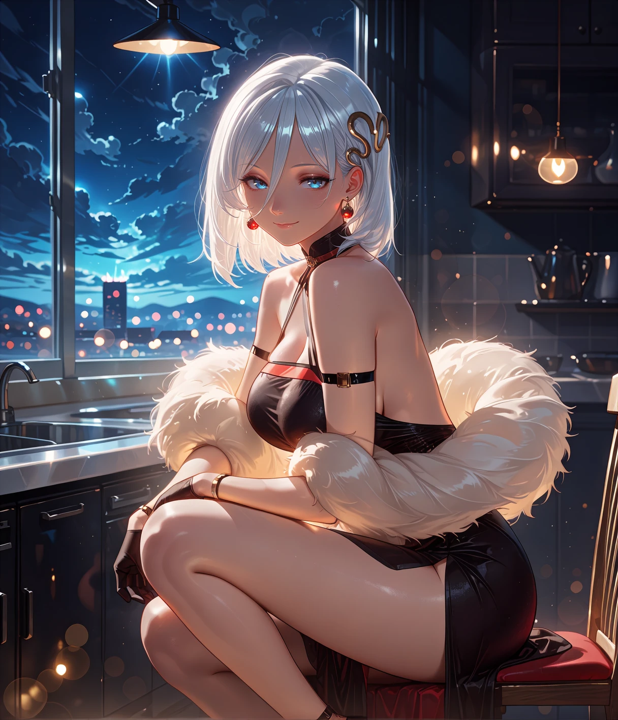 T0rpitzch1in, blue eyes, white hair, medium hair, hair between eyes, red sphere earrings, snake hair ornament, large breasts, sideboob, black choker, armlet, black half gloves, black evening gown, backless dress, halterneck, feather boa, side slit, red trim, black high heels, bare shoulders,