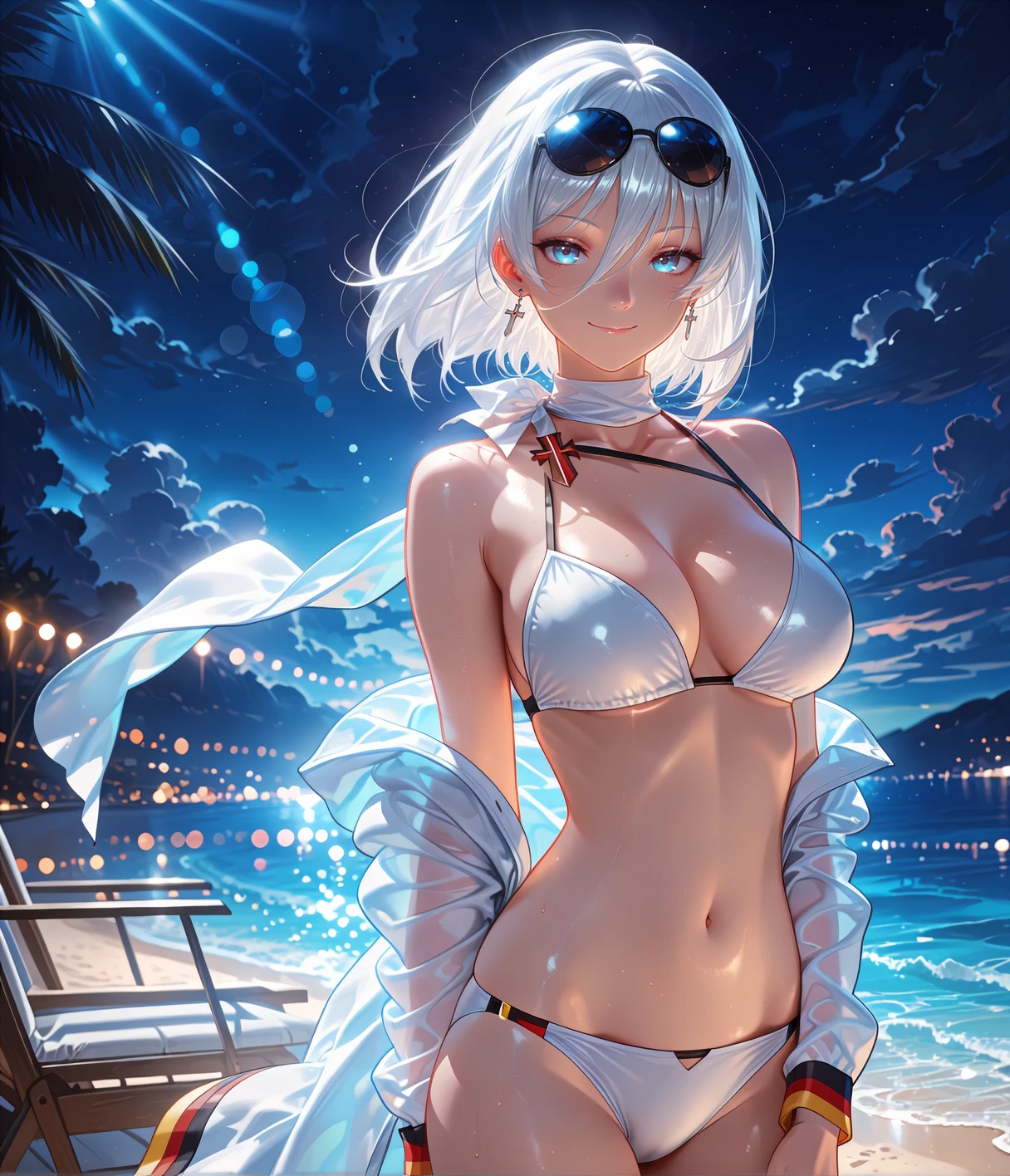 T0rpitzswim, blue eyes, white hair, medium hair, hair between eyes, black sunglasses, eyewear on head, cross earrings, large breasts, white scarf, white bikini, iron cross, anklet, red sandals, german flag print, white coat, off shoulder, multicolored trim,