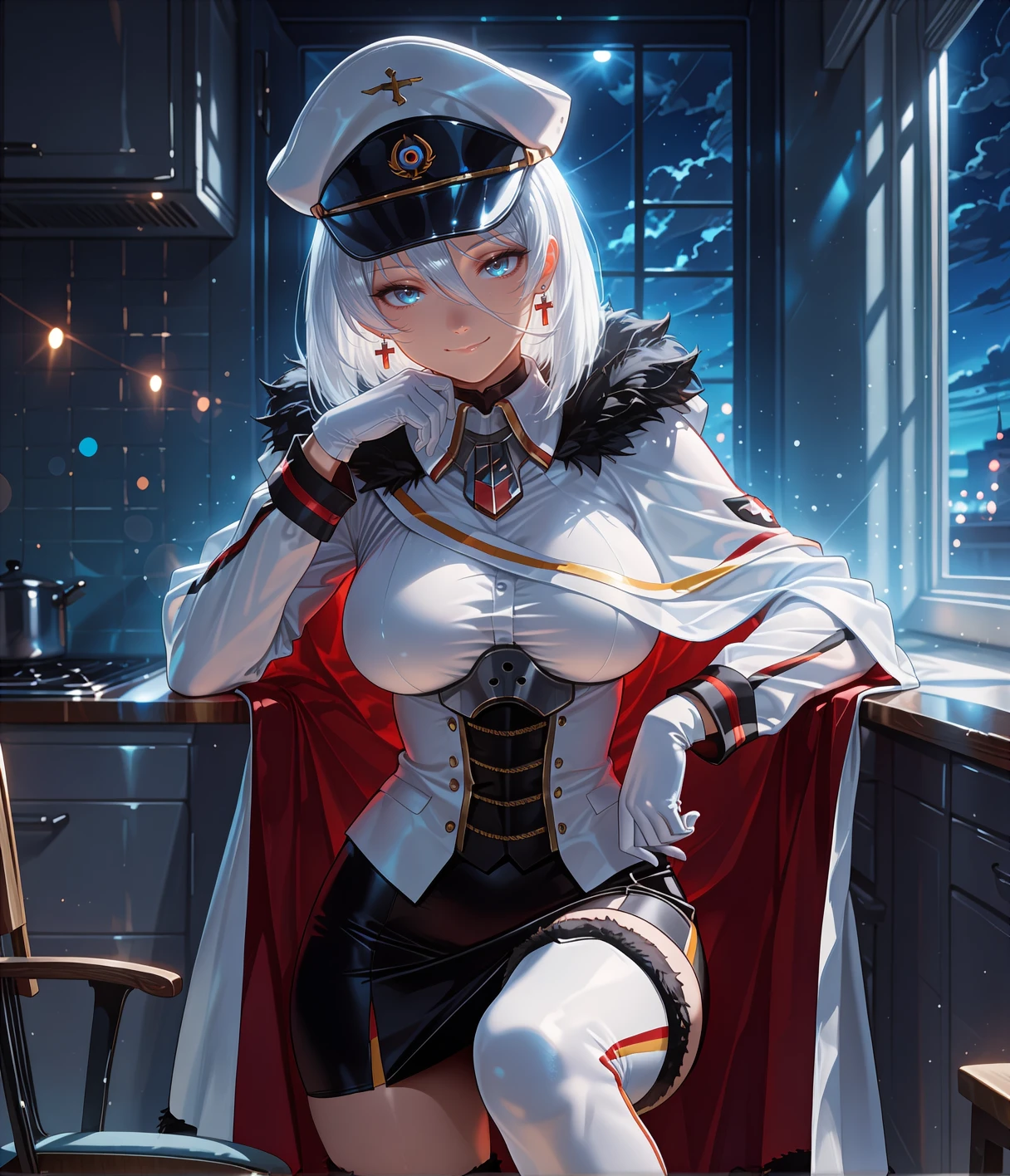 T0rpitzbase, blue eyes, white hair, medium hair, hair between eyes, white peaked cap, cross earrings, large breasts, white cape, white jacket, silver chest belt, underbust, long sleeves, sleeve cuffs, white gloves, fur trim, military uniform, fur-trimmed cape, two-sided cape, black pencil skirt, zettai ryouiki, german flag, flag print, white thigh boots, fur-trimmed legwear,