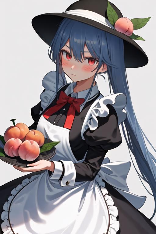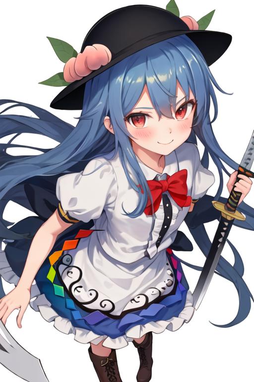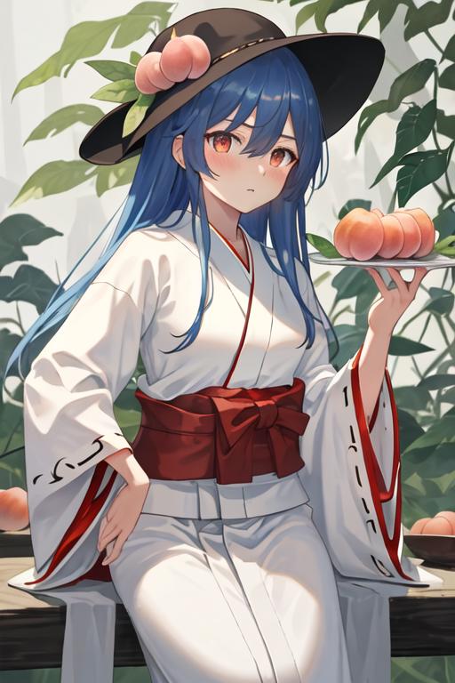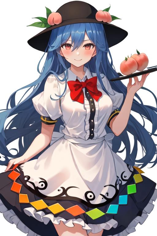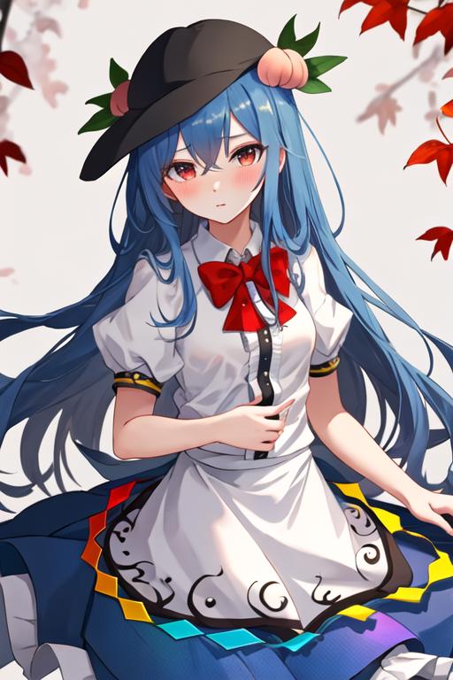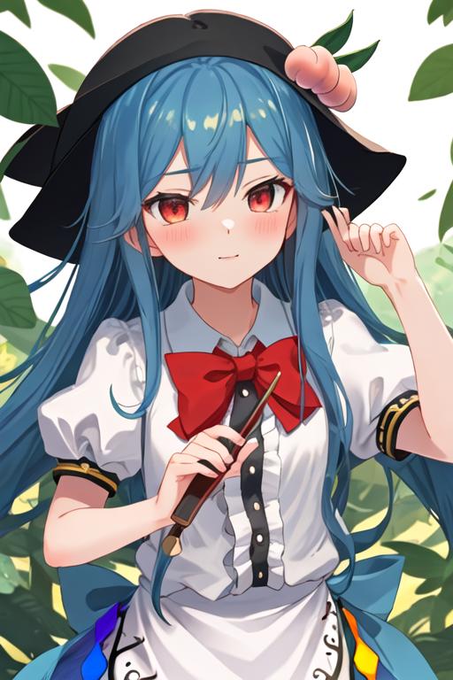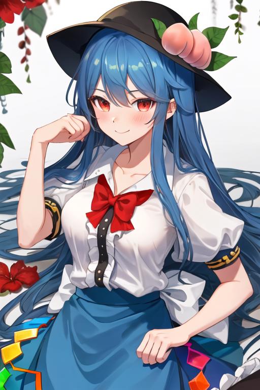 The trigger word is hinanawi_tenshi_touhou, and the recommended tags are best quality, masterpiece, highres, solo, {hinanawi_tenshi_touhou:1.15}, blue_hair, long_hair, red_eyes, peach, food, fruit, hat, blush, black_headwear, bow, leaf, hair_between_eyes.