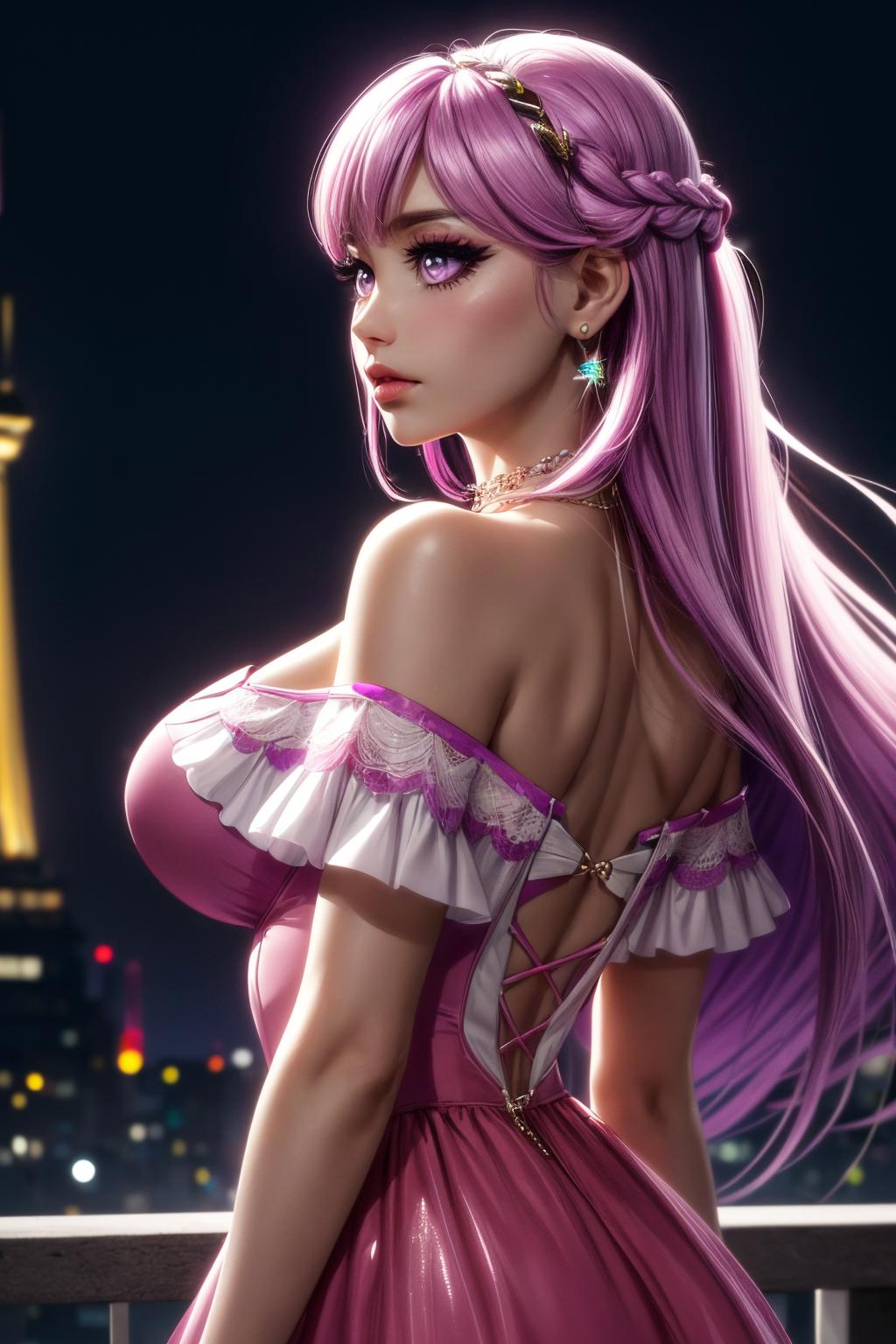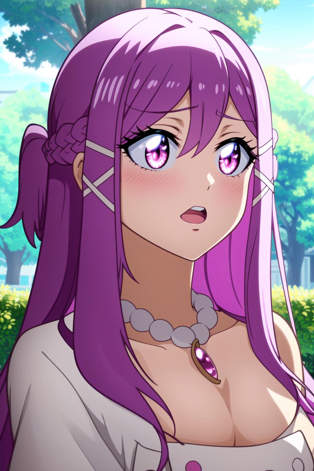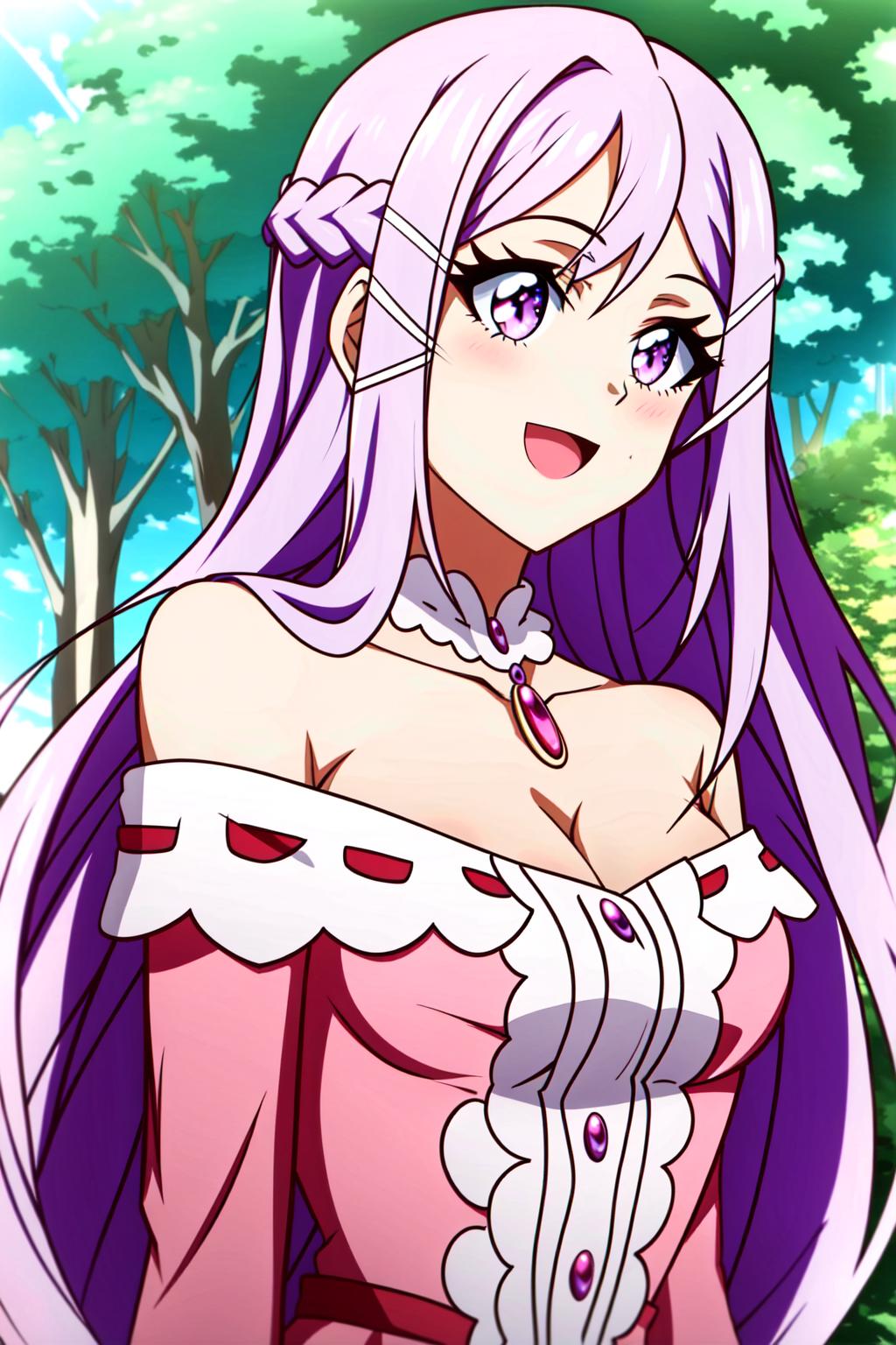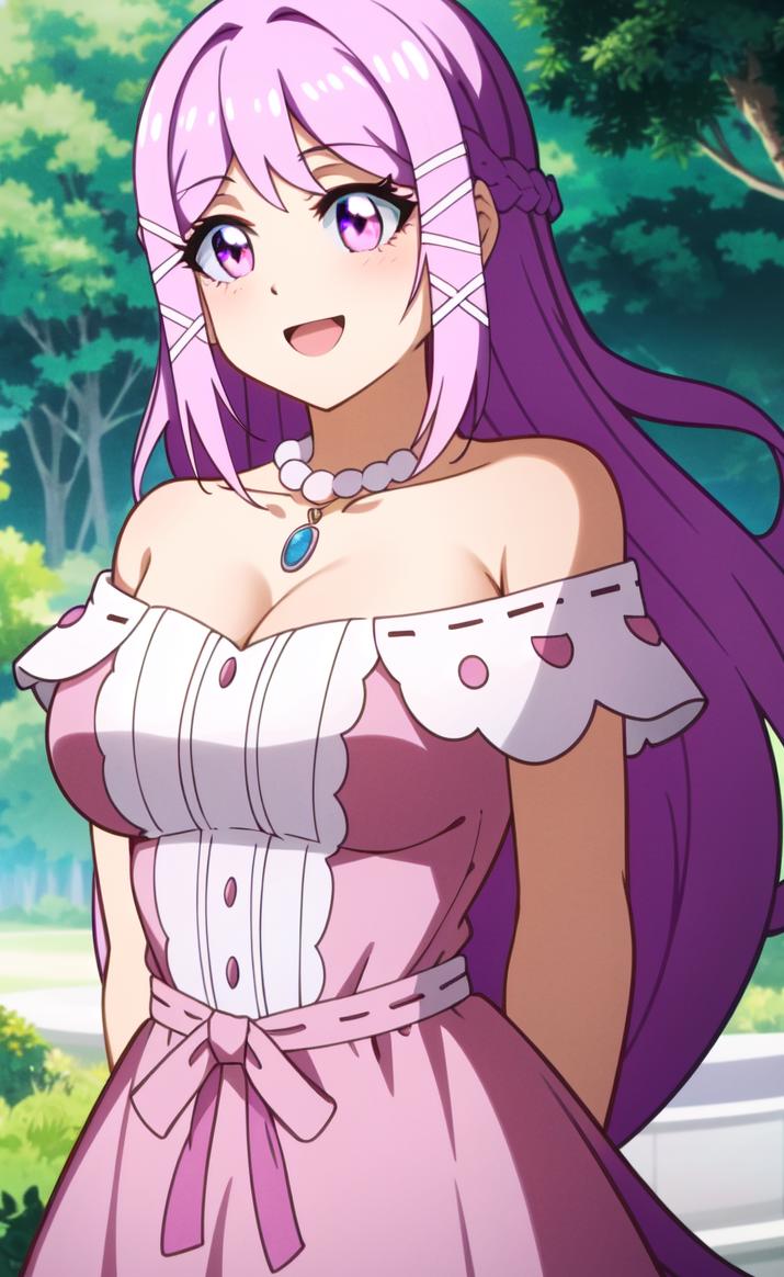 Xia Zitong, long hair, breasts, dress, cleavage, day, 1girl, very long hair, floating hair, open mouth, jewelry, smile, hair ornament, pink dress, necklace, medium breasts, arms behind back, collarbone, braid, purple eyes, off-shoulder dress, upper body, off shoulder, tree, shiny hair, pink hair, bangs, ribbon, purple hair, shiny, french braid