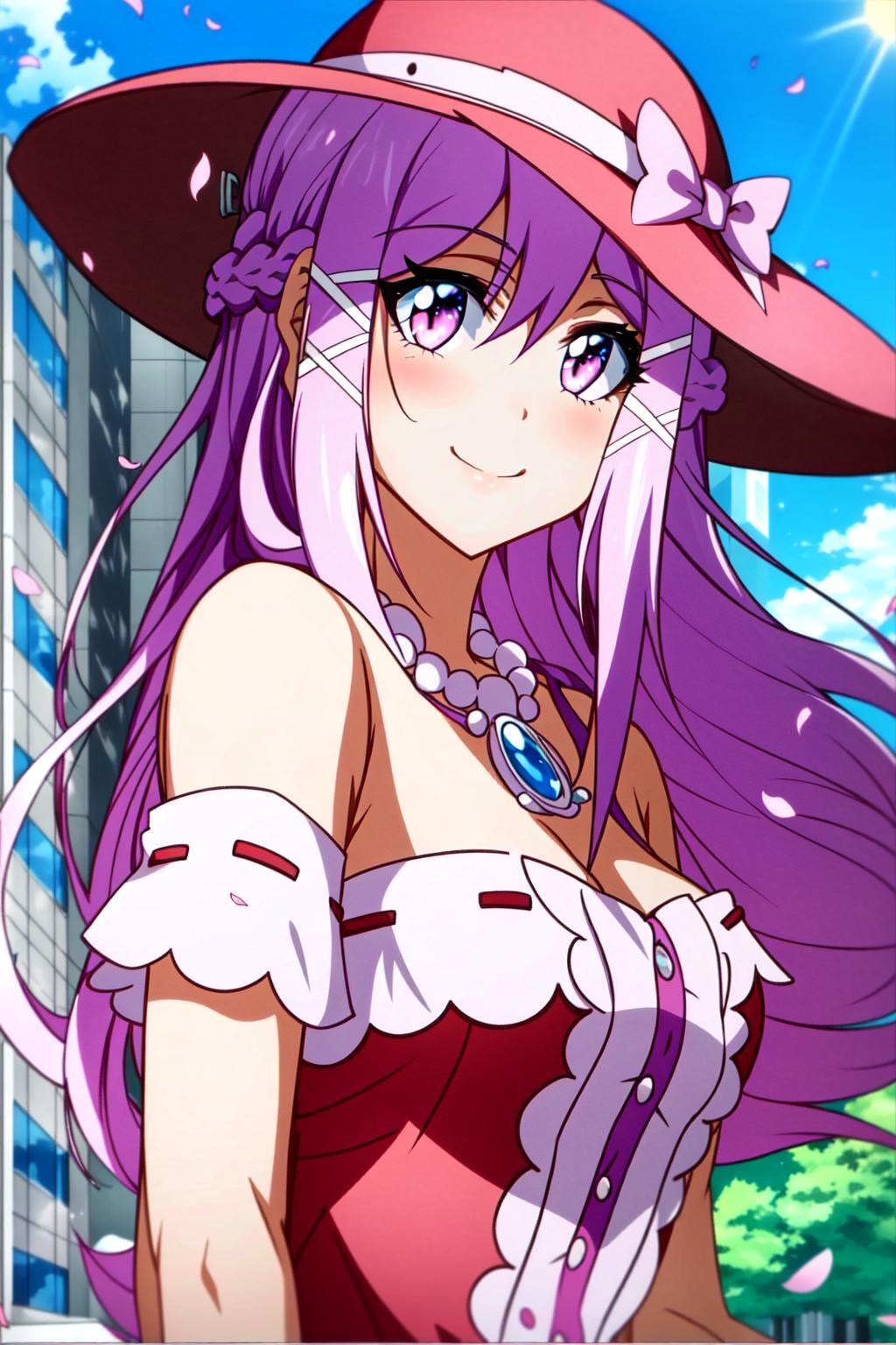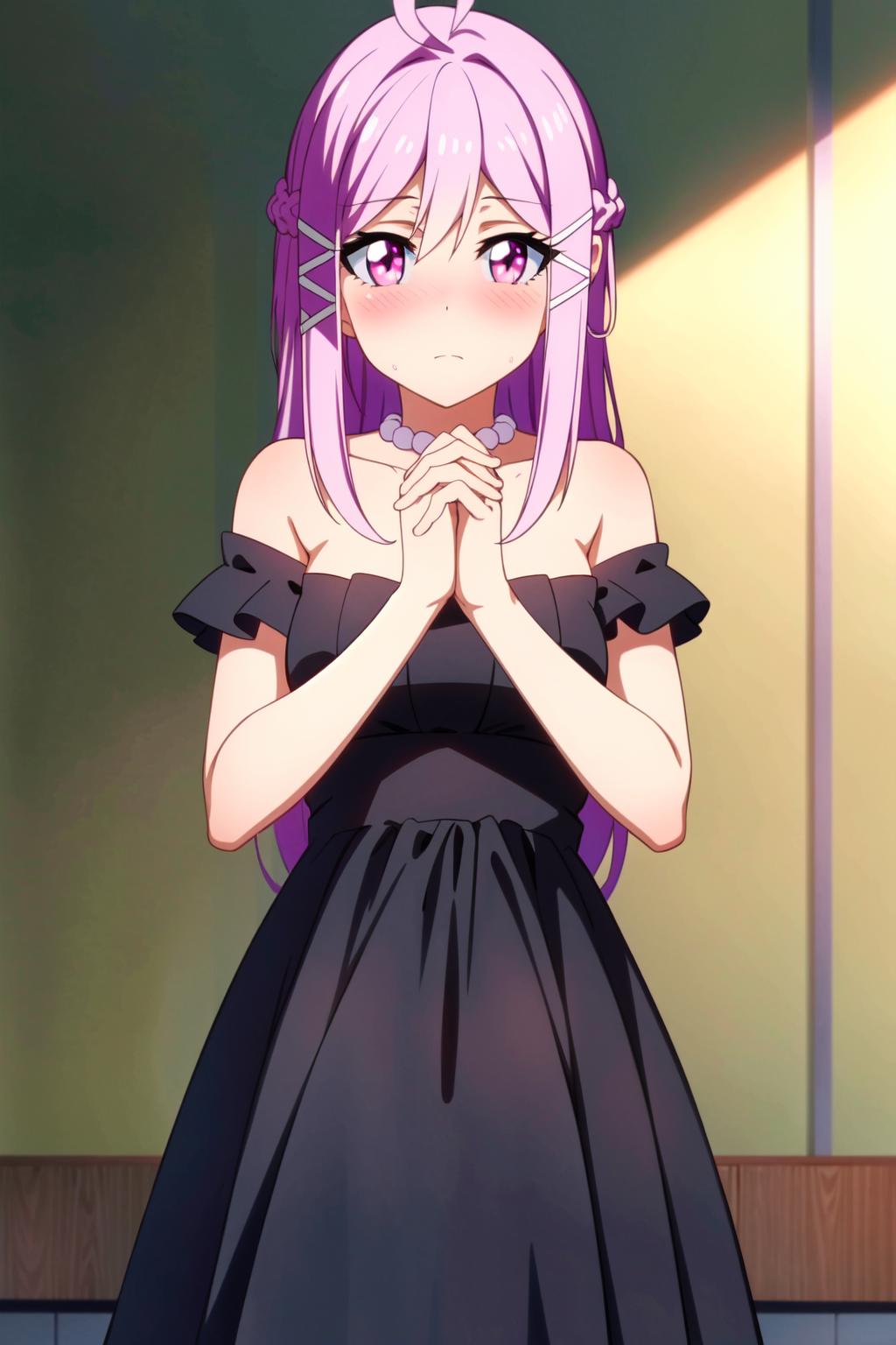 夏紫潼1girl独奏饰品长发项链张开嘴白天天空紫色眼睛粉红头发紫发辫子丝带发带云朵裸肩蓝天发饰