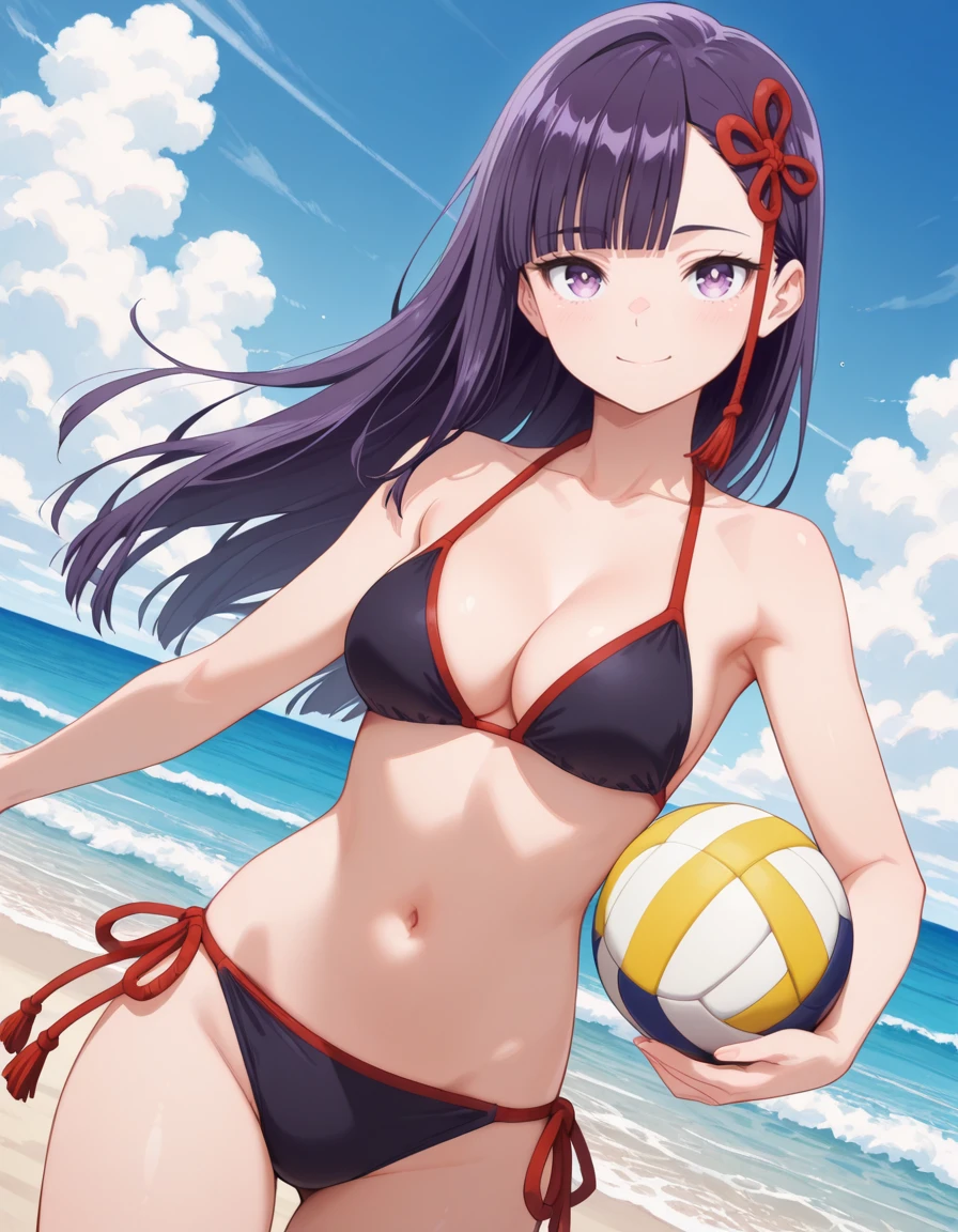 <lora:ren_yamashiro-chained_soldier_s2-ixl-anime-soralz:1>, ren yamashiro (chained soldier), long hair, purple hair, hime cut, asymmetrical bangs, purple eyes, hair ribbon, tassel