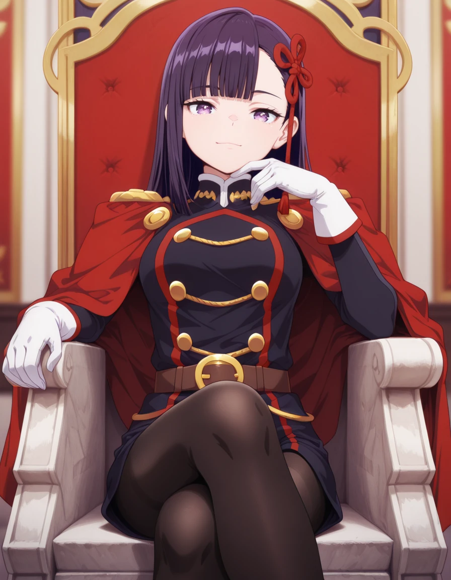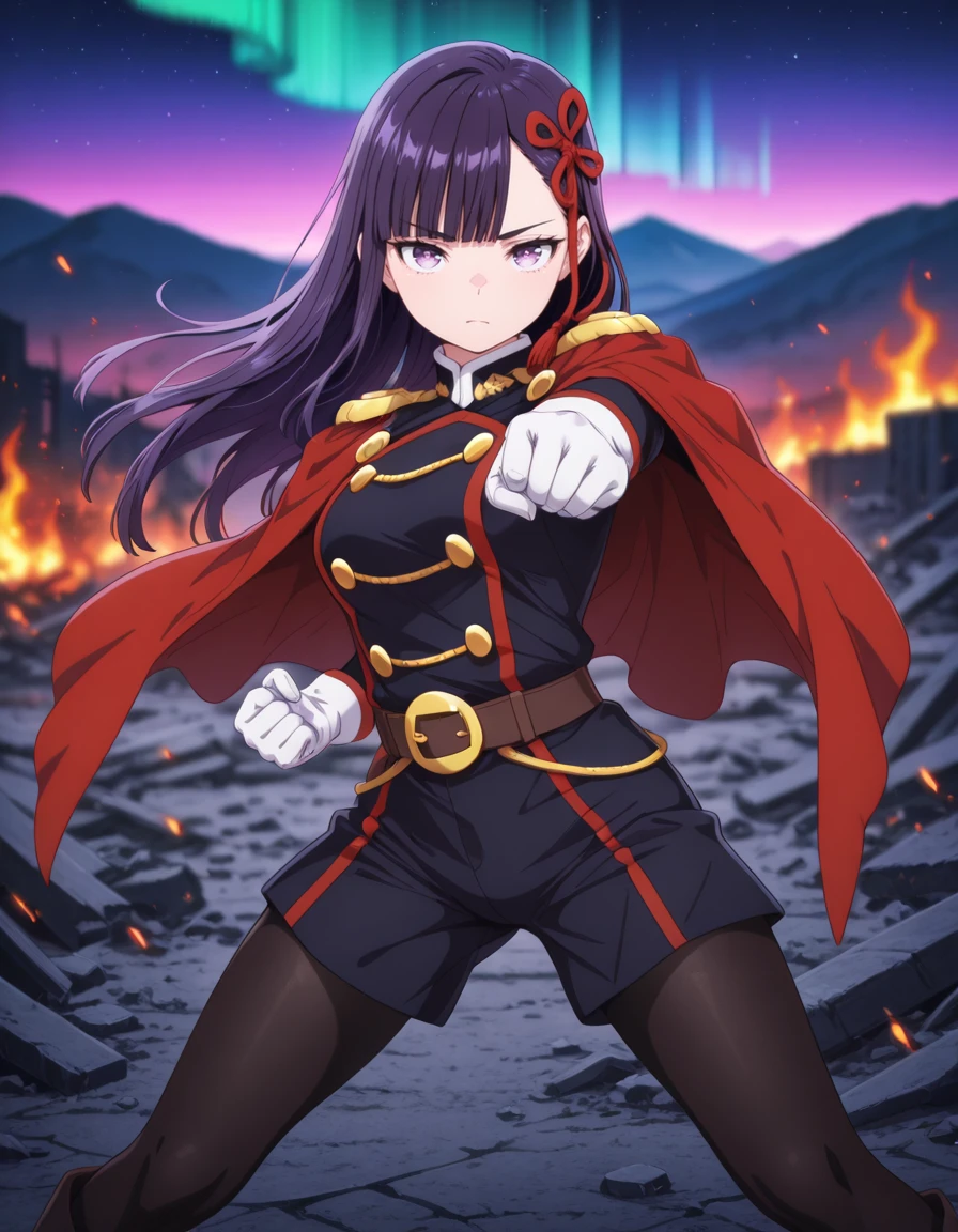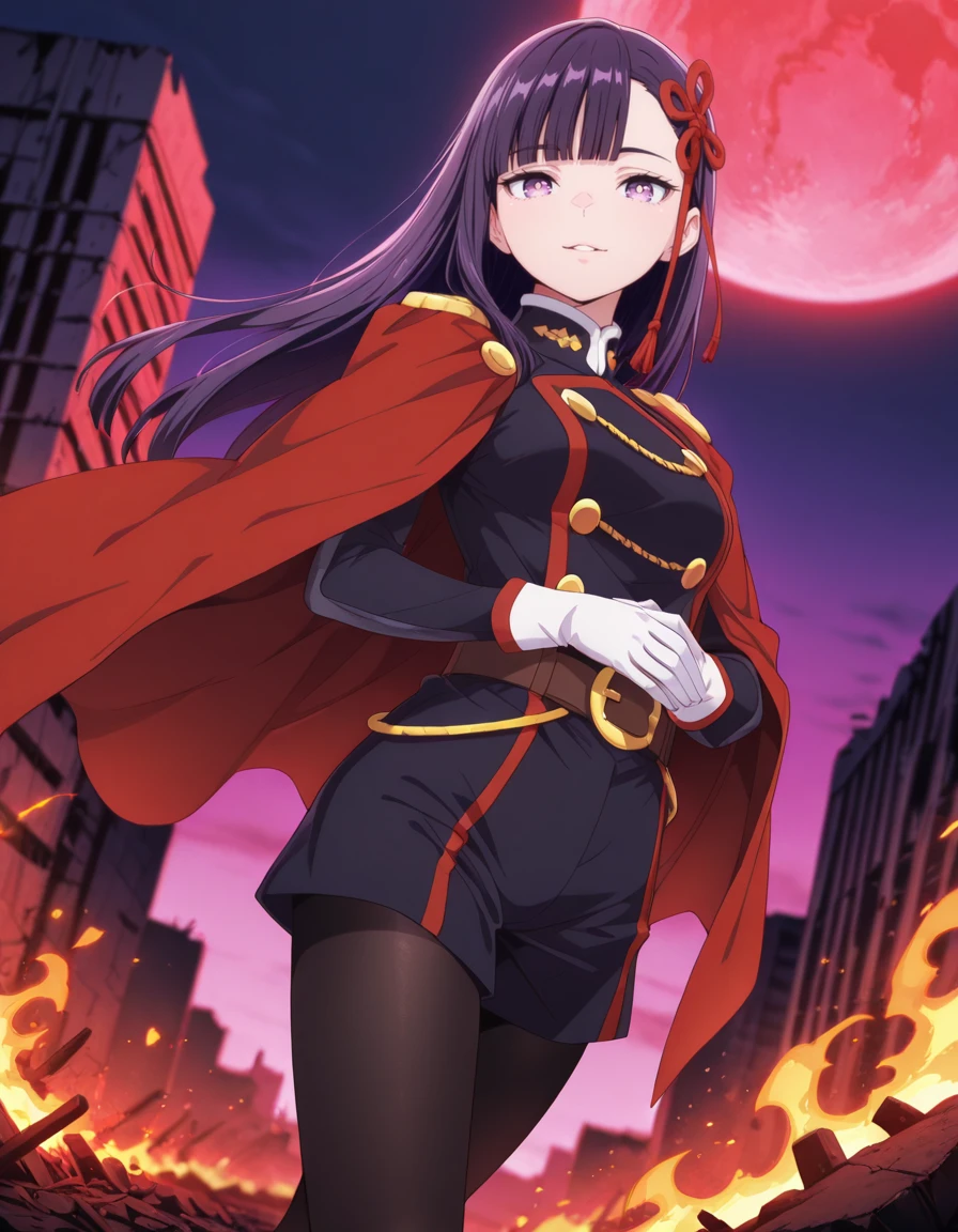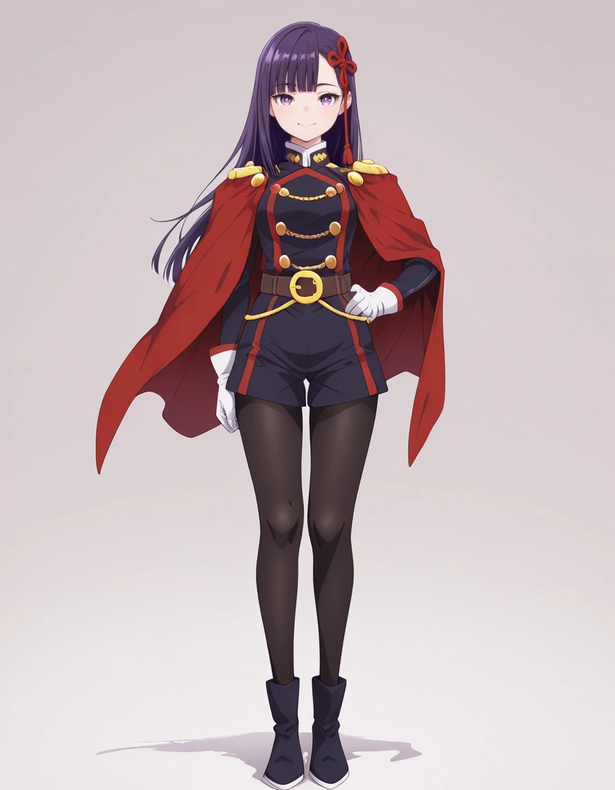 military uniform, epaulettes, red cape, yellow buttons, long sleeves, white gloves, belt, belt buckle, uniform shorts, black pantyhose, boots