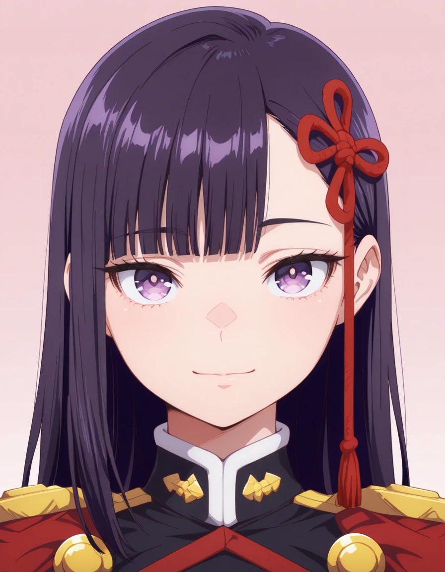 <lora:ren_yamashiro-chained_soldier_s2-ixl-anime-soralz:1>, ren yamashiro (chained soldier), long hair, purple hair, hime cut, asymmetrical bangs, purple eyes, hair ribbon, tasselOutfit - Military Uniform