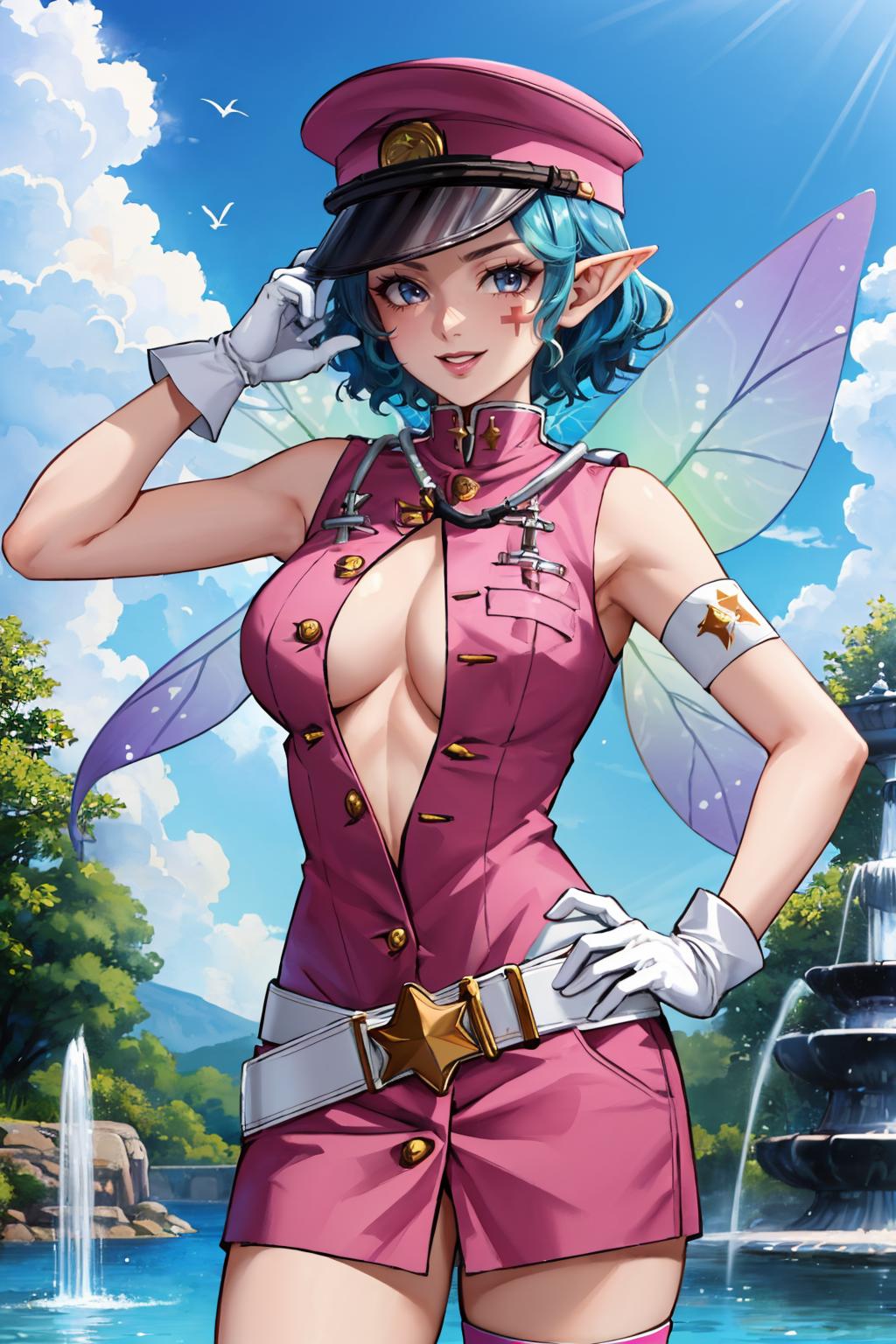 Tags: trishp2, hat, short hair, fairy wings, gloves, pointy ears, blue hair, breasts, large breasts, white gloves, center opening, facial mark, lipstick, knee boots