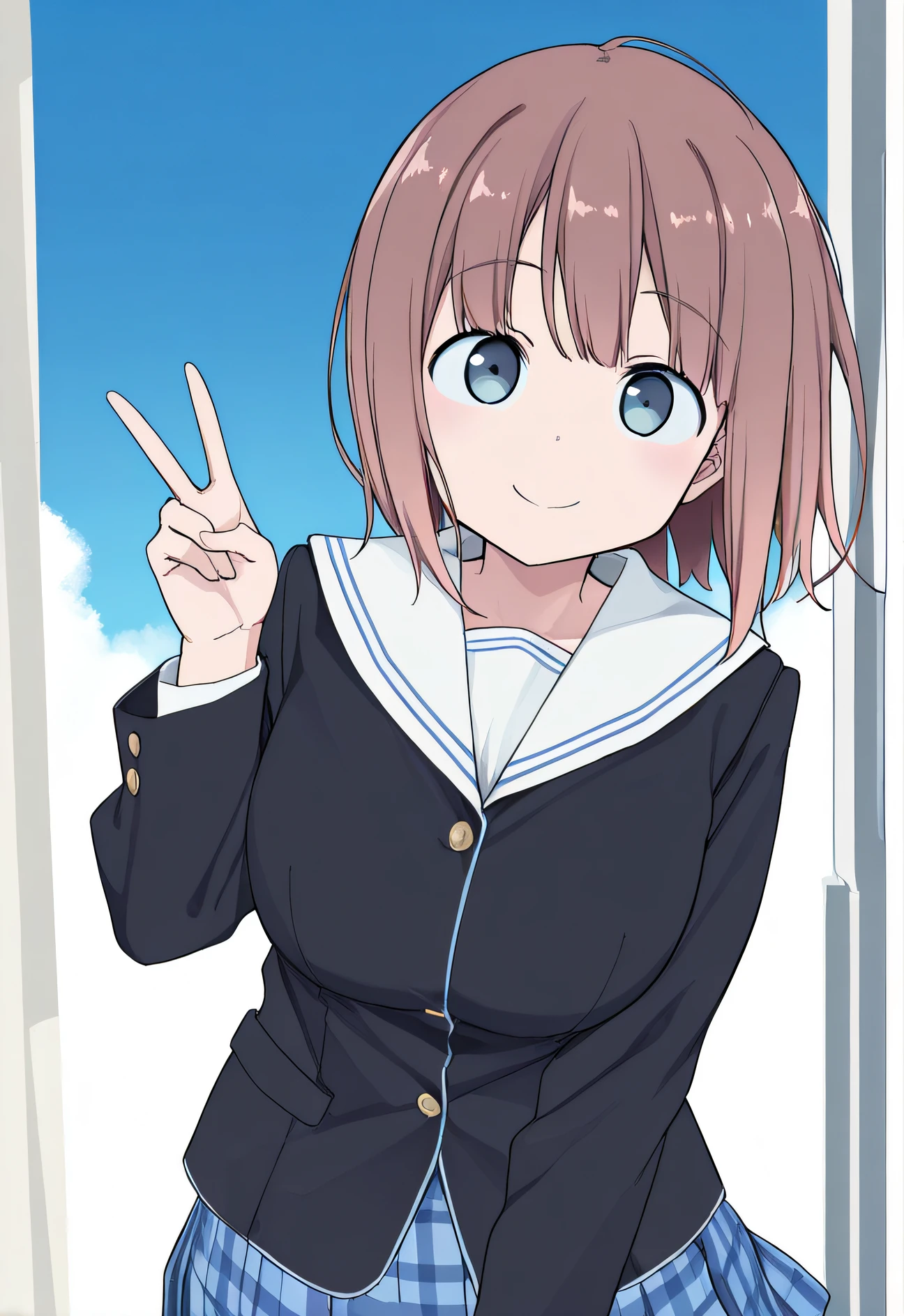 imoutochan, short hair, brown hair, blue eyes, school uniform, black blazer, sailor collar, long blue plaid skirt, black pantyhose