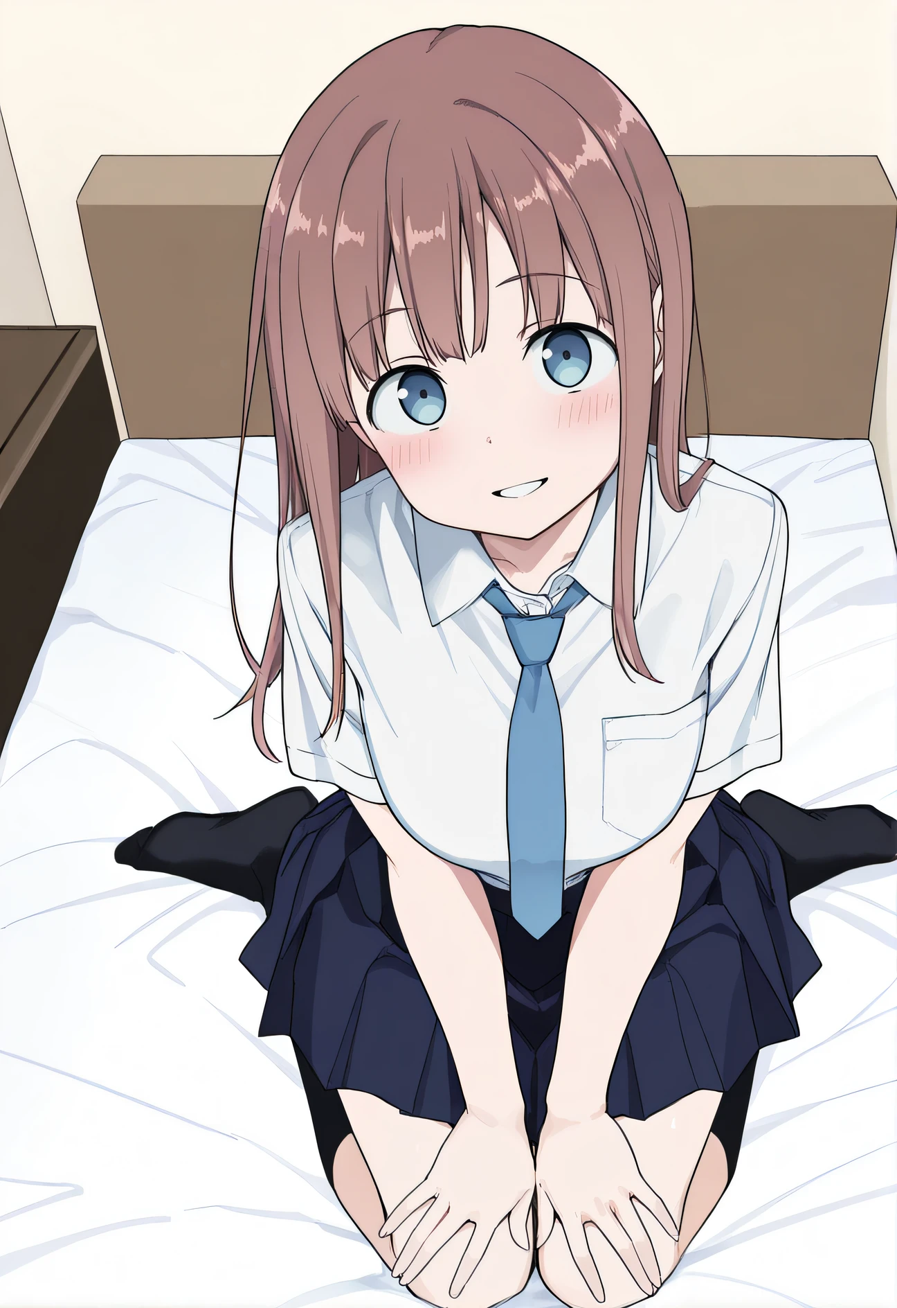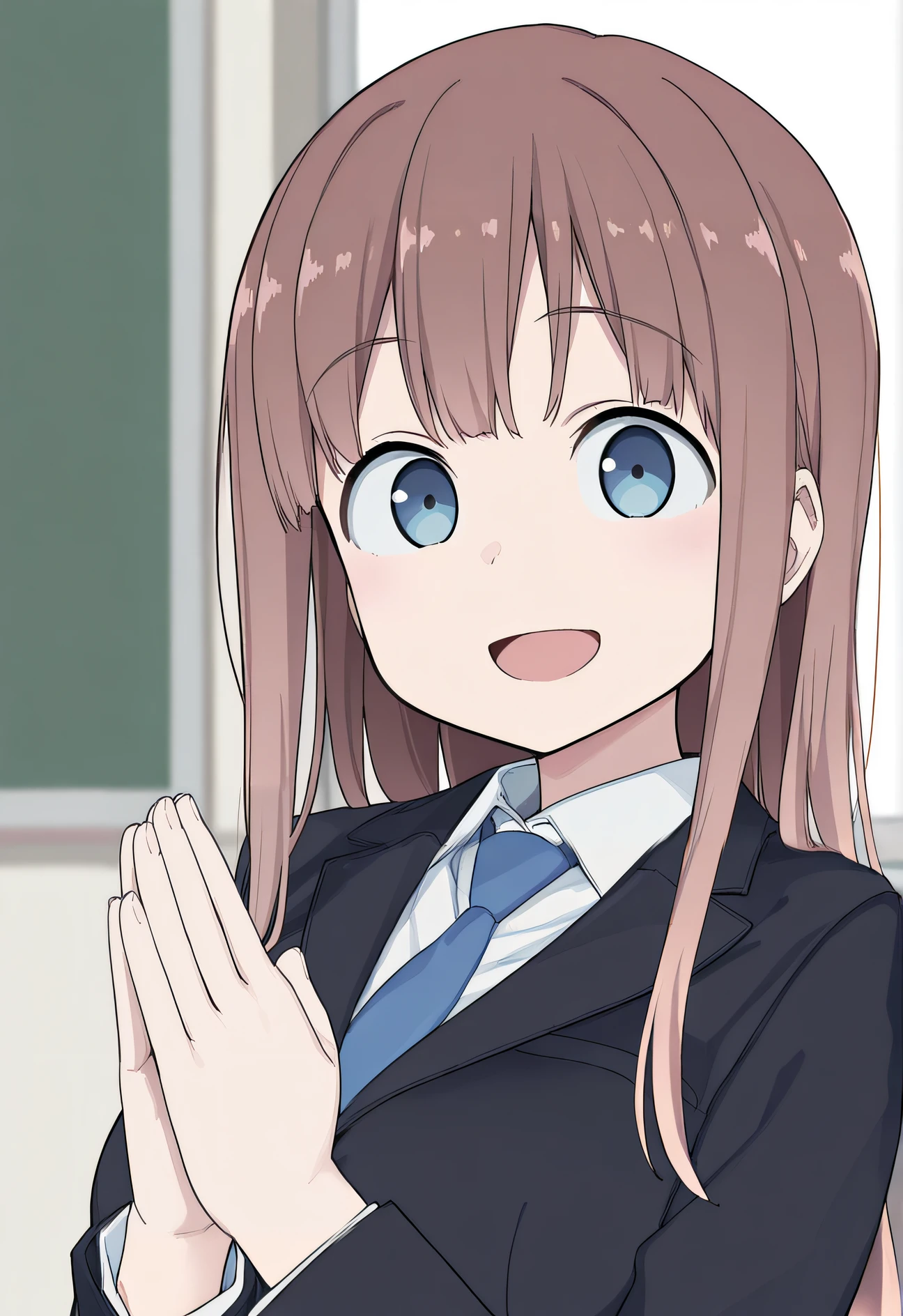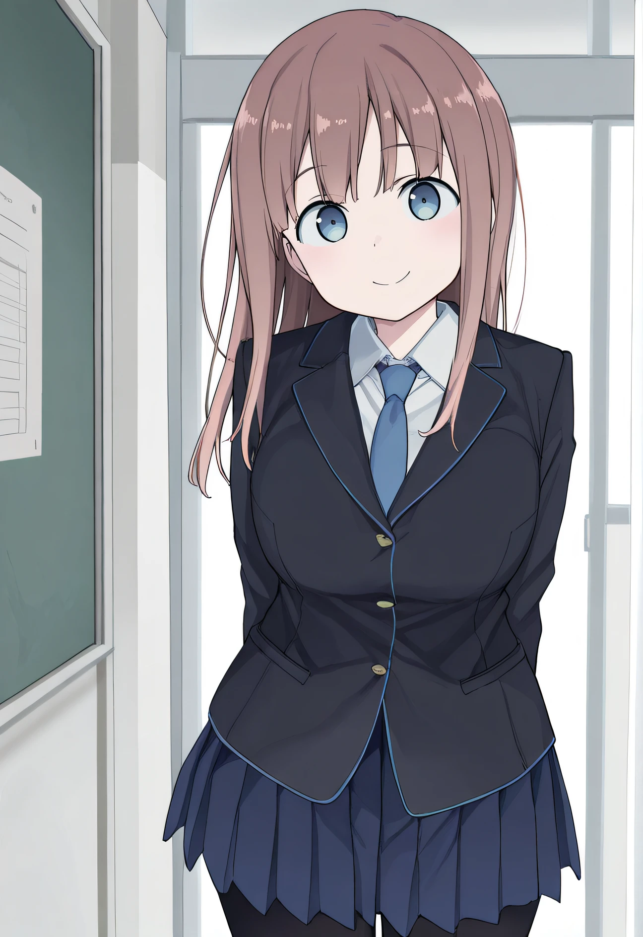 imoutochan, long hair, brown hair, blue eyes, school uniform, black blazer, blue necktie, blue pleated skirt, black pantyhose