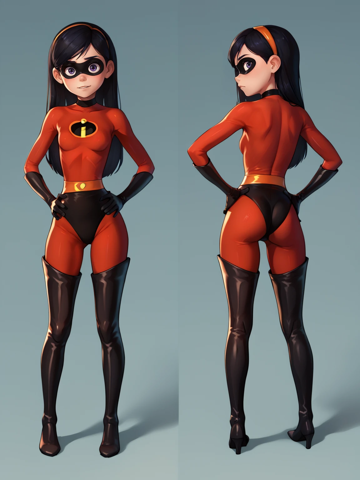 SuperHero prompts : mask, black hair, long hair, hairband, blue eyes, purple eyes, bodysuit, gloves, boot, thighhighs, thigh boots