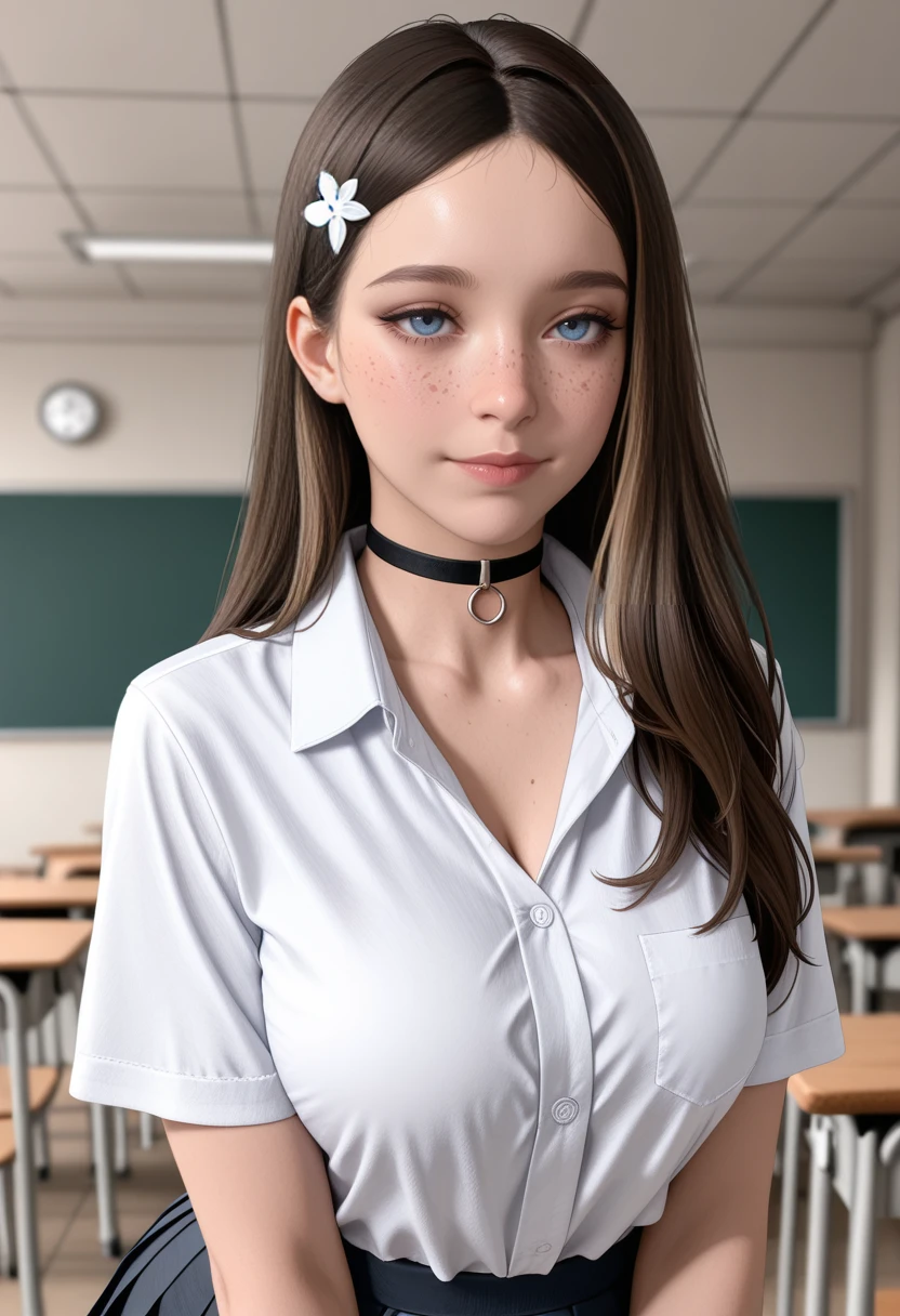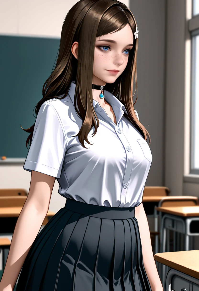long hair, brown hair, hair ornament, choker, school uniform, shirt, pleated skirt