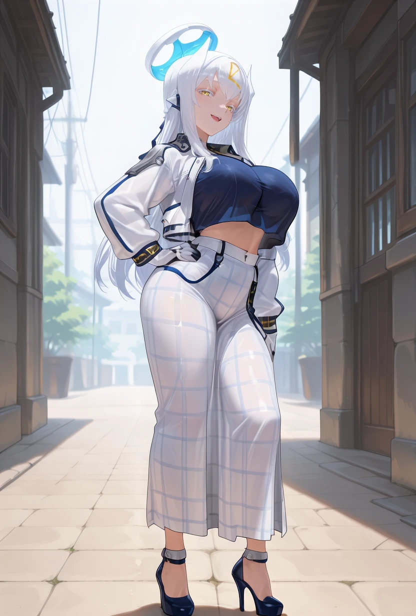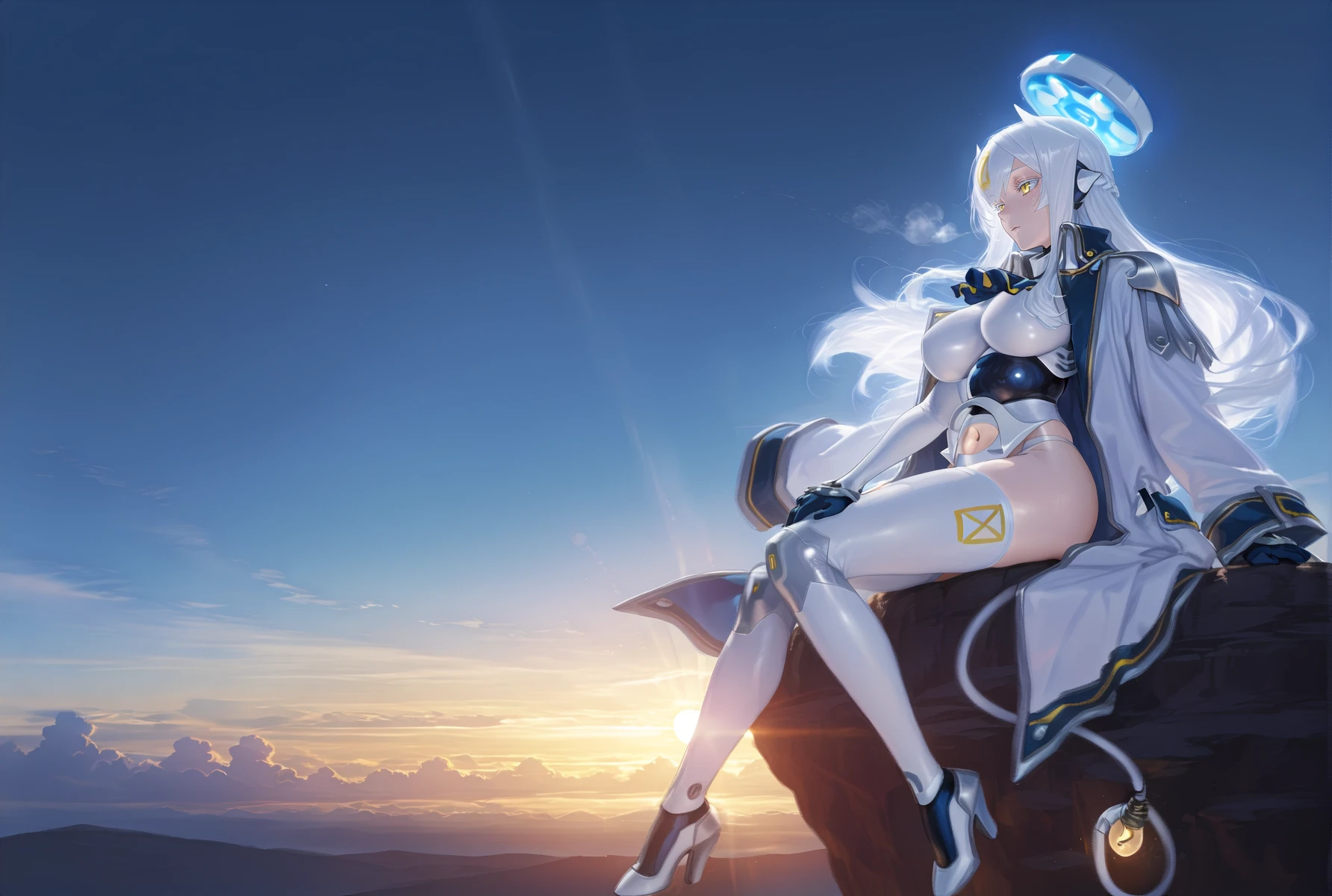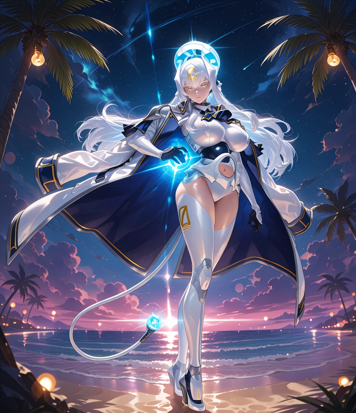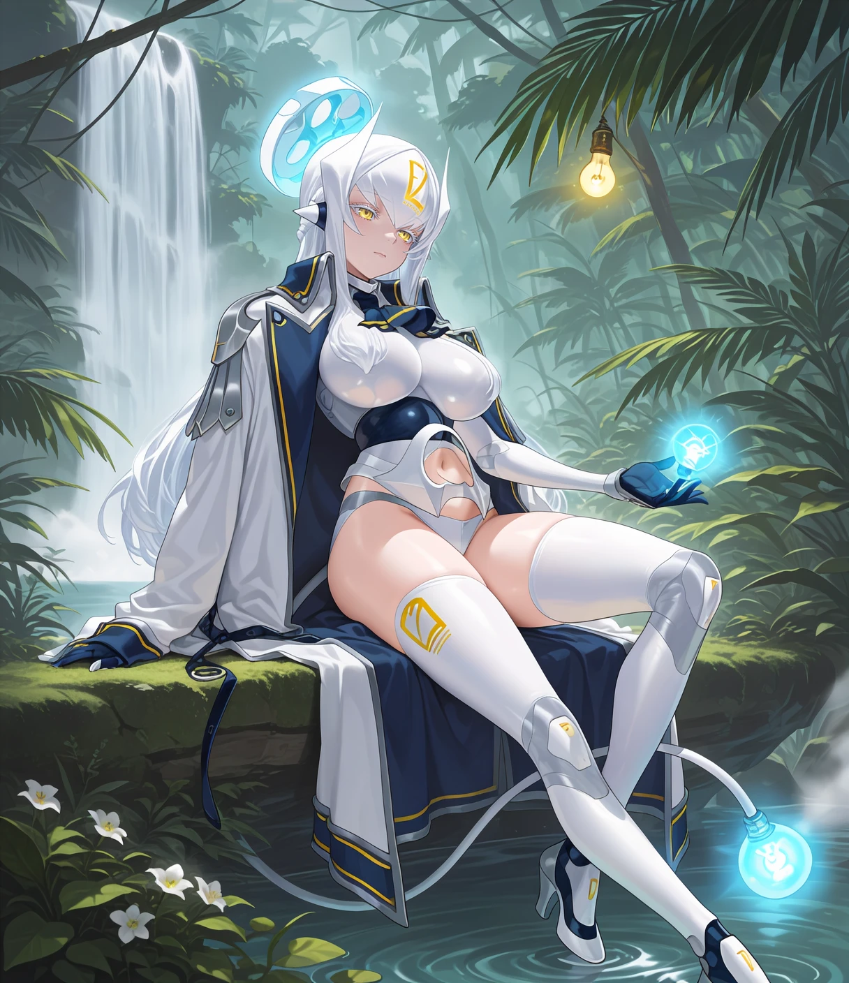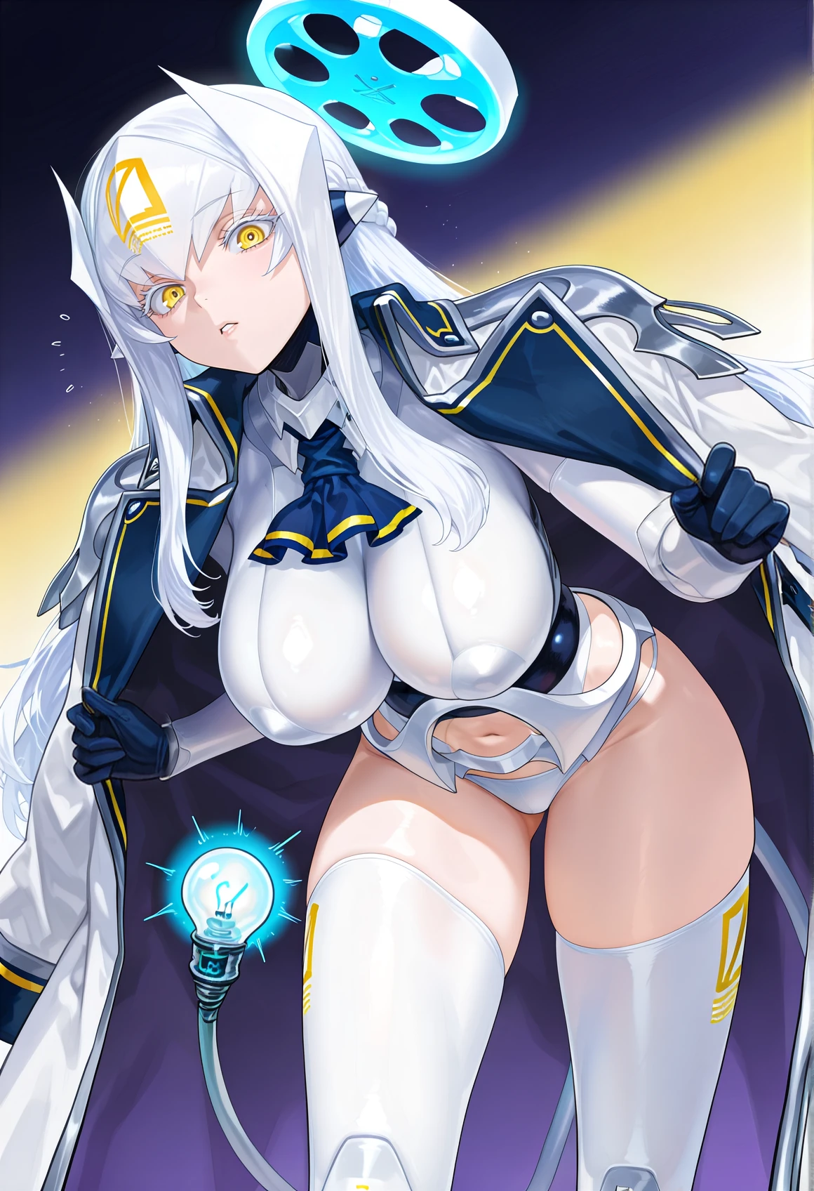 S1lv4, yellow eyes, white hair, long hair, french braid, colored eyelashes, white eyelashes, white headgear, mechanical halo, large breasts, yellow print, blue ascot, blue gloves, armored gloves, mechanical arms, white elbow gloves, white bodysuit, coat on shoulders, white coat, long coat, blue trim, yellow trim, open coat, blue belt, belt buckle, navel cutout, metal belt, white panties, mechanical legs, white thighhighs, high heels, tail, light bulb, android, blue doll joints, shoulder armor,