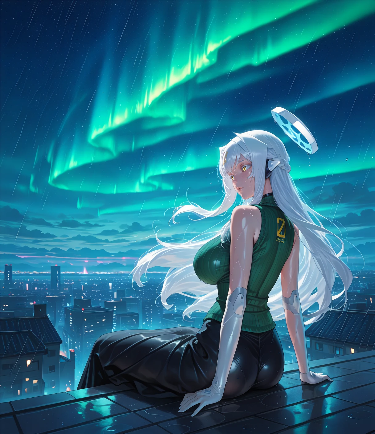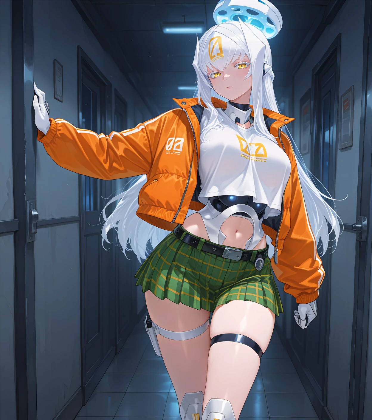 S1lv4, yellow eyes, white hair, long hair, french braid, colored eyelashes, white eyelashes, white headgear, mechanical halo, , yellow print, blue ascot, blue gloves, armored gloves, mechanical arms, white elbow gloves, white , coat on shoulders, white coat, long coat, blue trim, yellow trim, open coat, blue belt, belt buckle, navel cutout, metal belt, white panties, mechanical legs, white thighhighs, high heels, tail, light bulb, android, blue doll joints, shoulder armor,