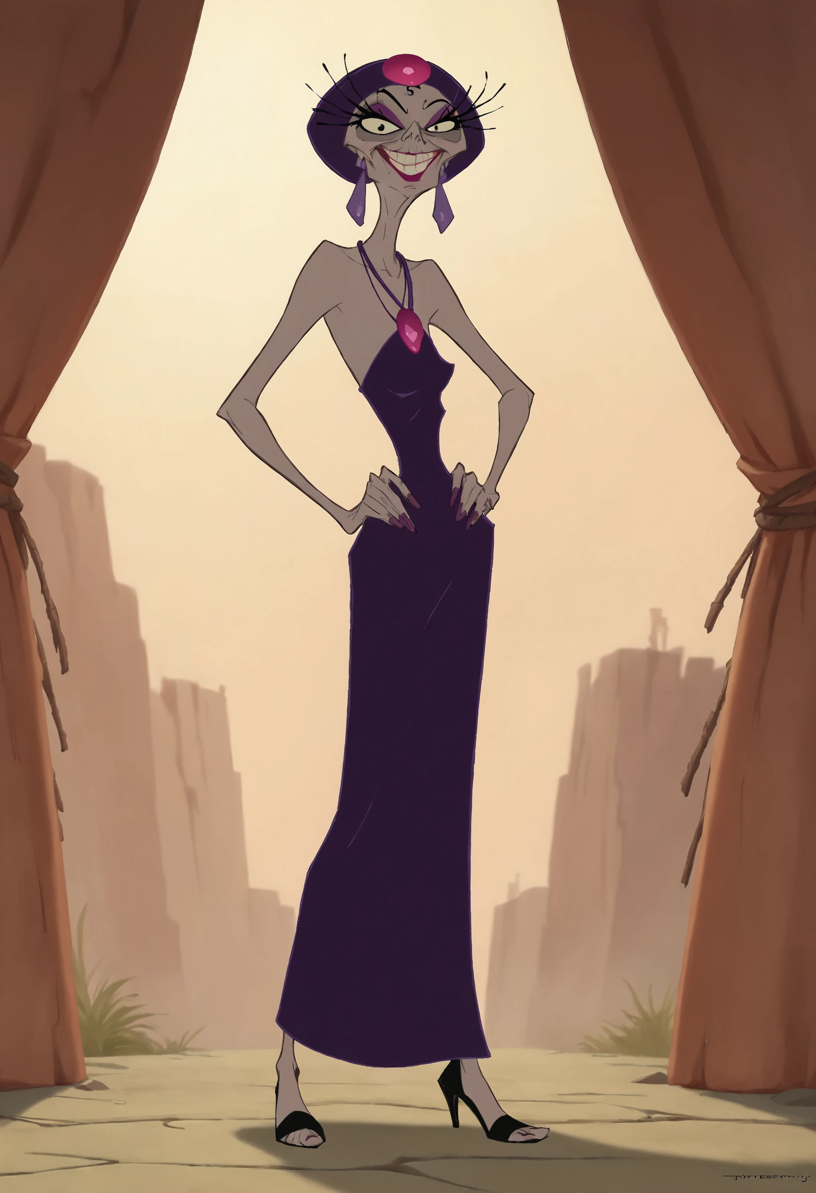 yzma, solo, 1girl, mature_female, eyelashes, black dress, earrings, jewelry, fur collar, makeup, headdress, teeth, long fingernails