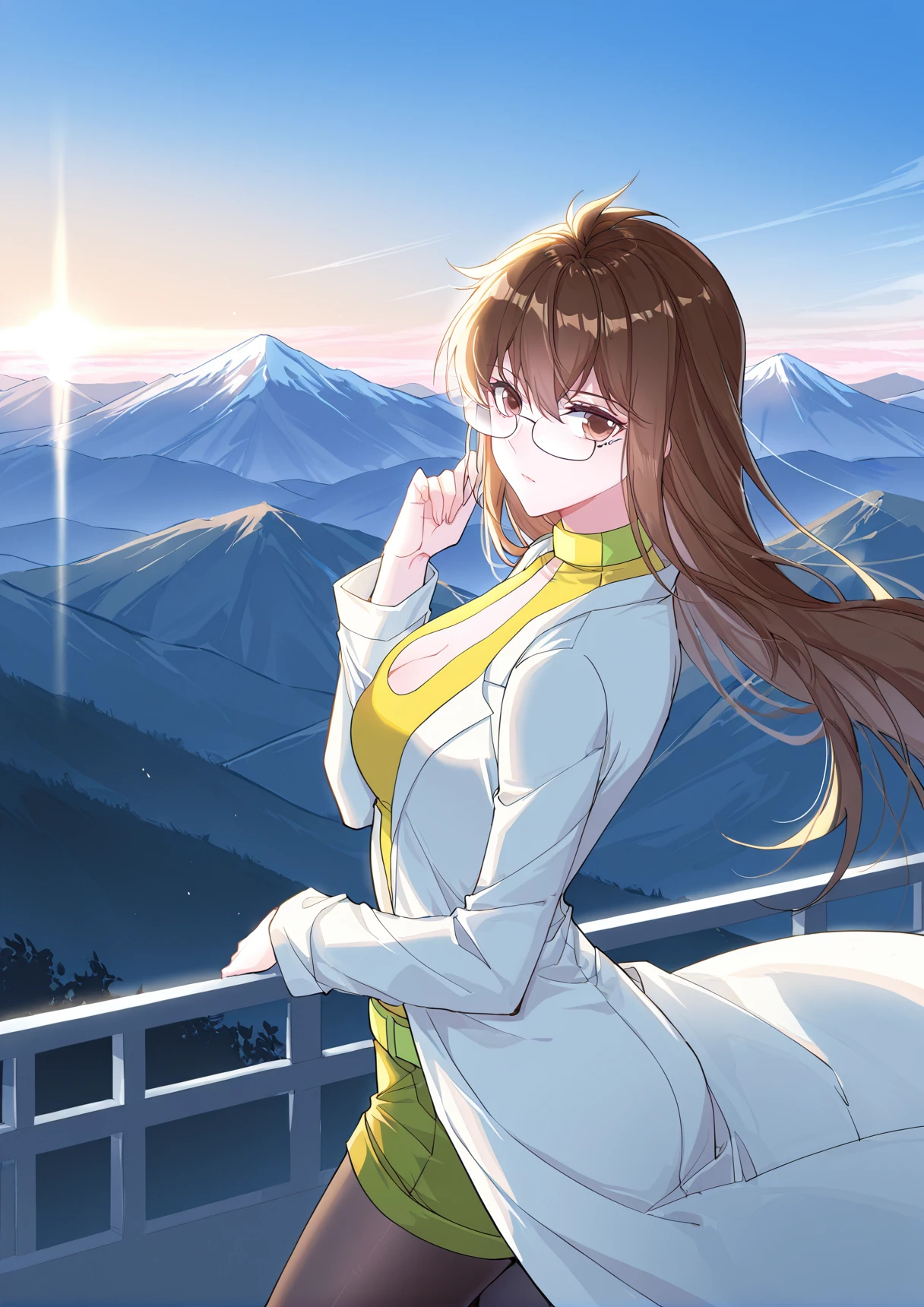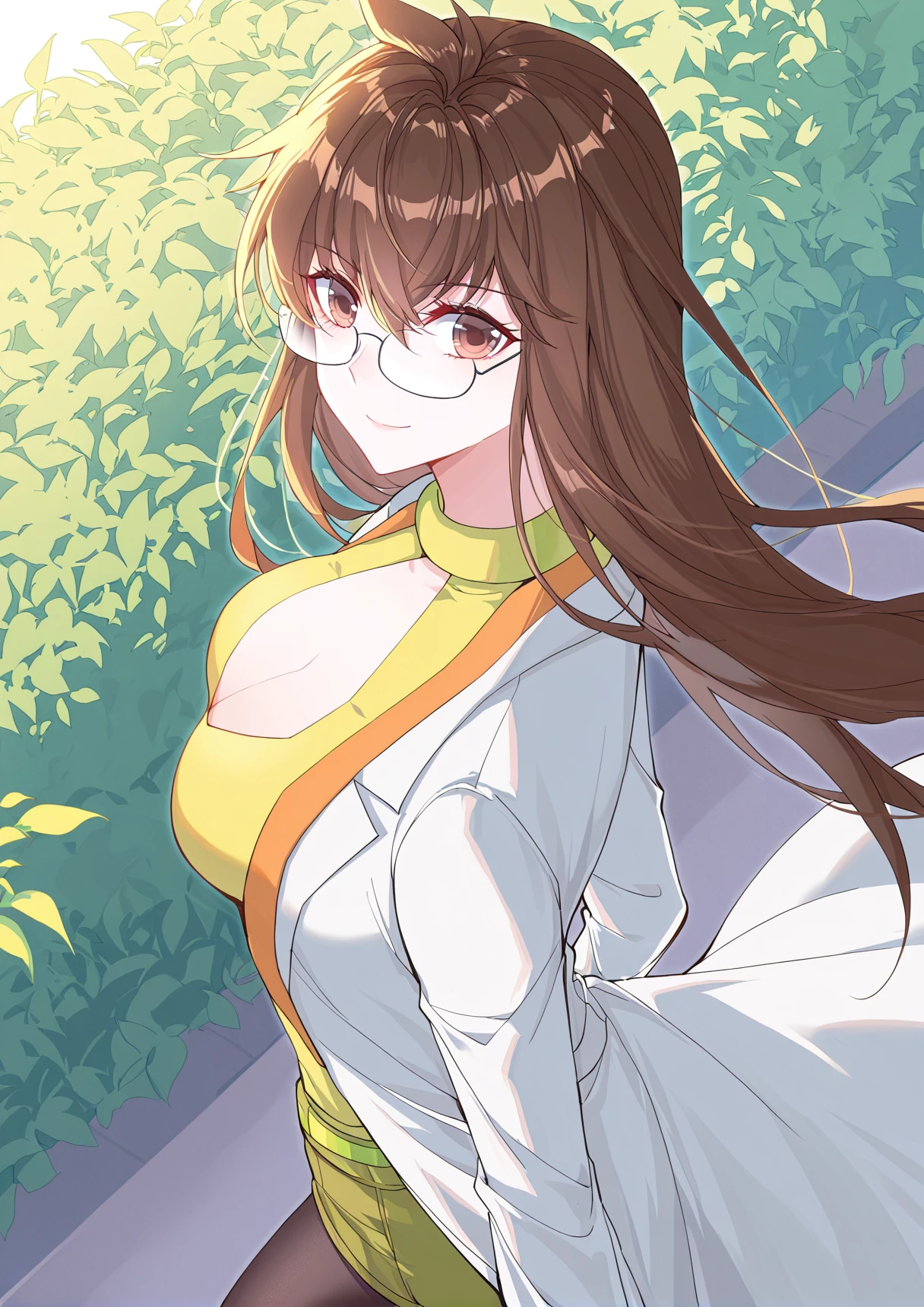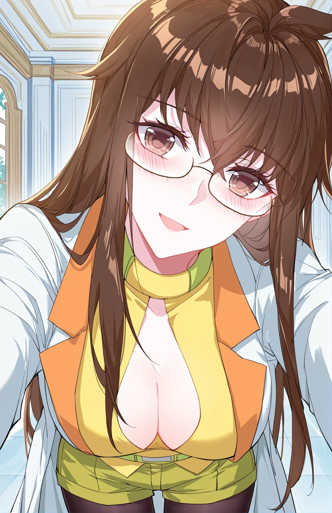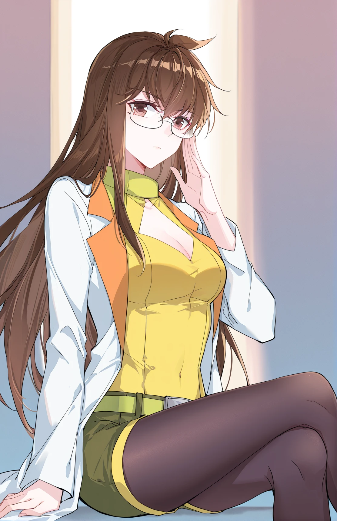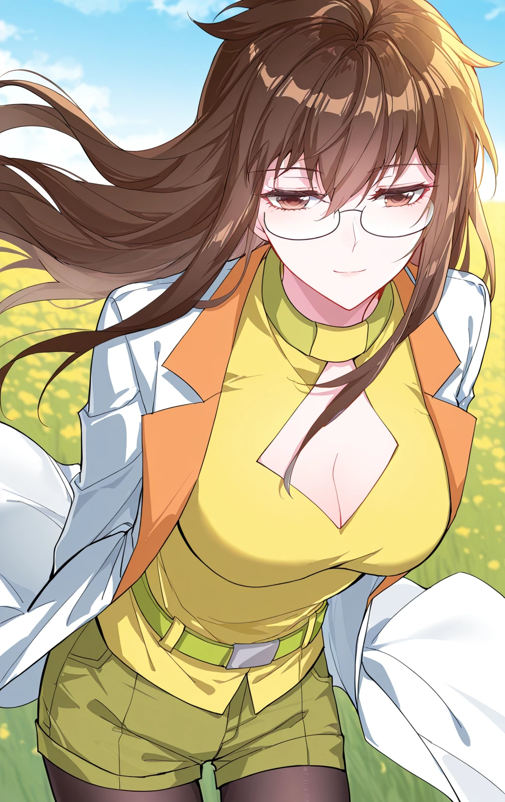 Juzi_Outfit, yellow tight top, cleavage cutout, green details, green shorts, wide green belt, long white coat, lab coat, open coat, orange lapels, black pantyhose,