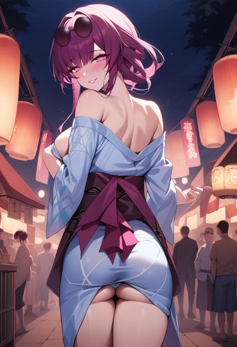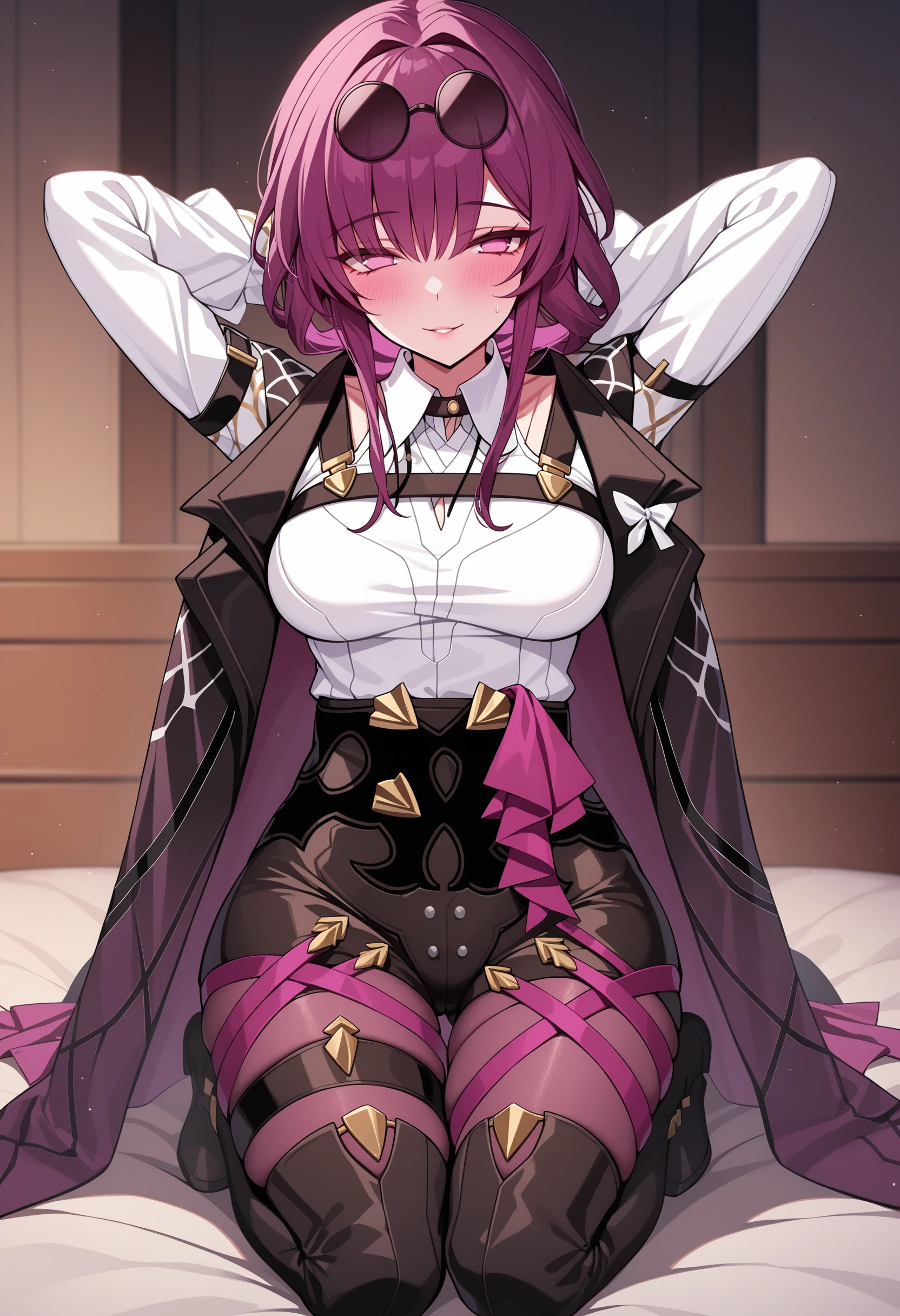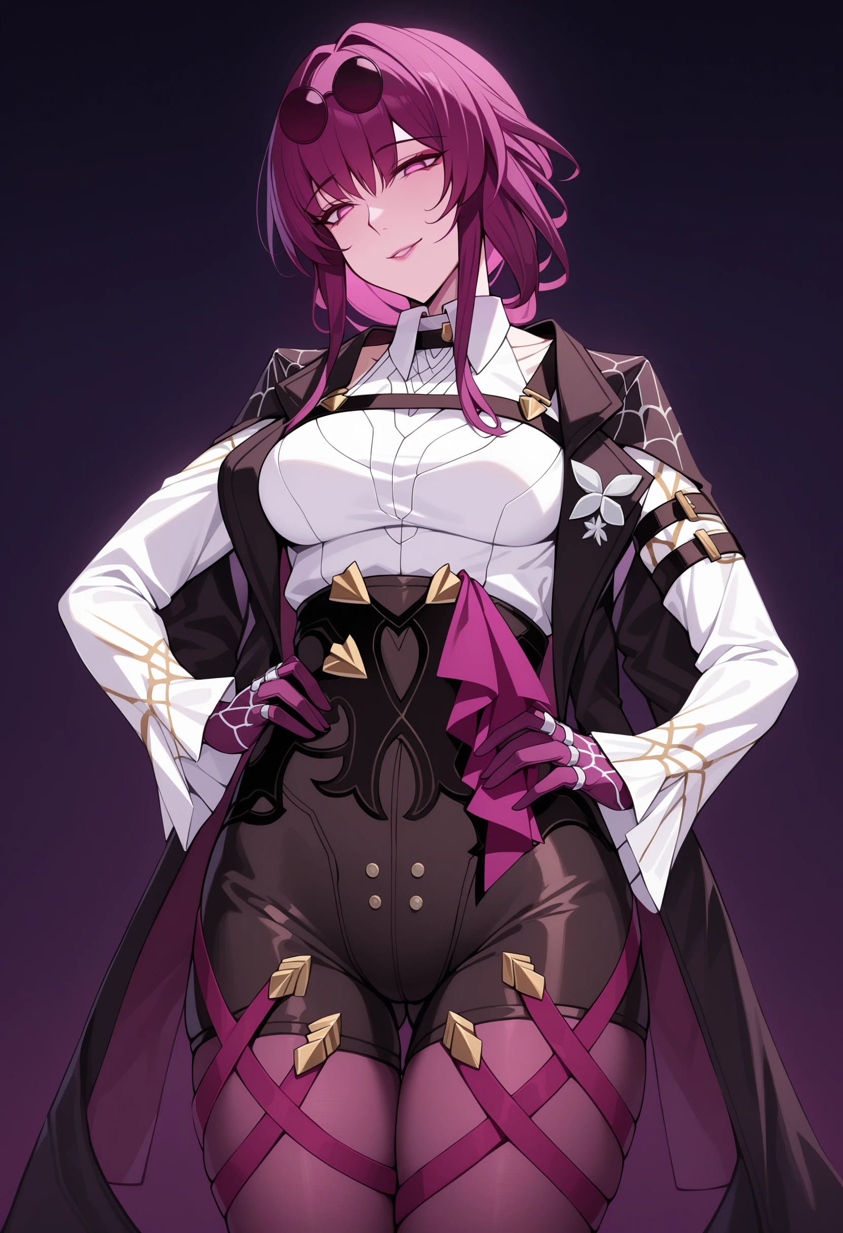 Outfit: eyewear on head, collared white shirt, long sleeves, jacket on shoulders, black jacket, black shorts, gloves, purple gloves, pantyhose under shorts, criss-cross straps, thigh strap, purple pantyhose, thigh boots, asymmetrical legwear