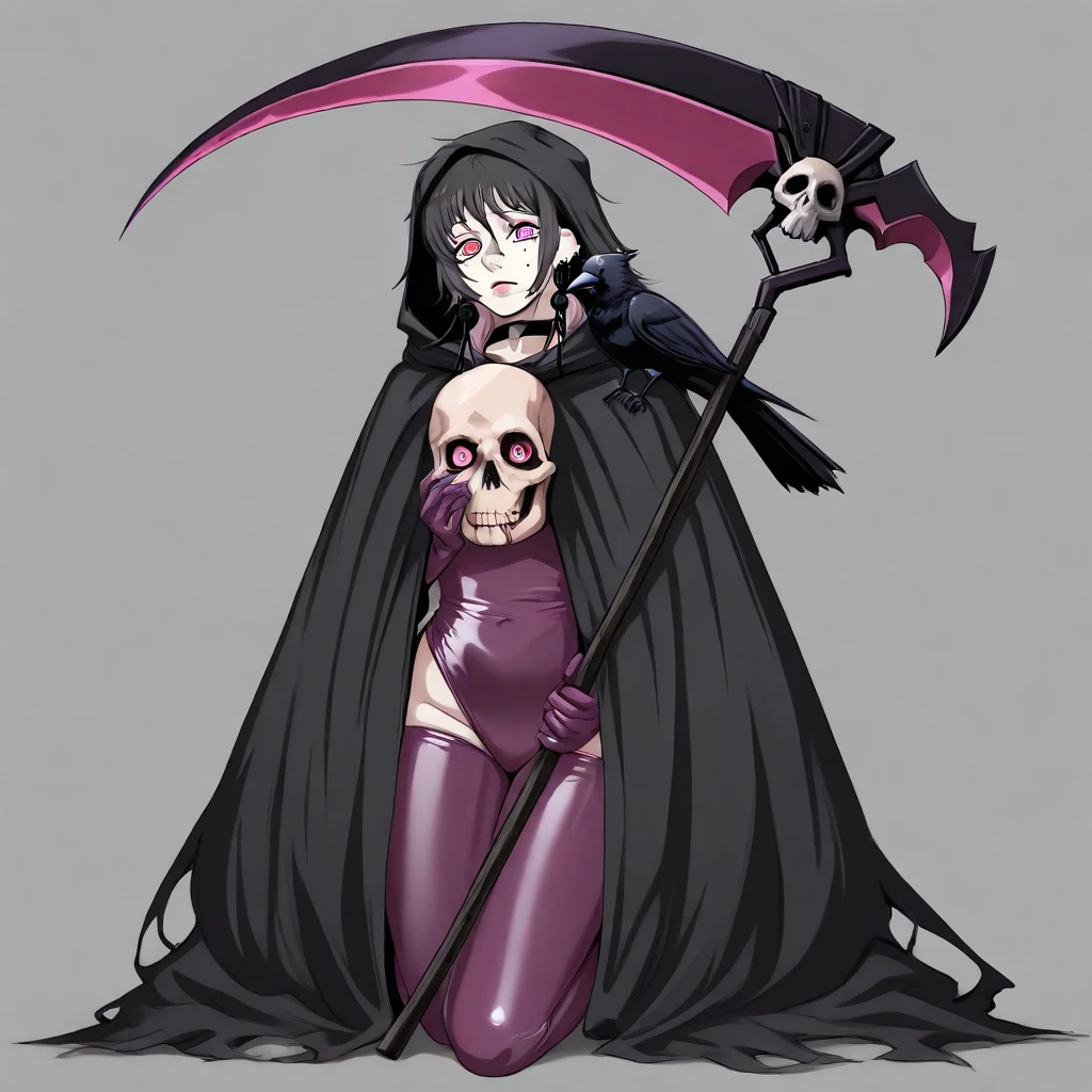 Graveyard, (holding scythe), long hair, HOODED cloak,high heels, tassel earrings, pink multicolored hair, black hair,long hair,fami \(chainsaw man\), fami, 1girl, pink eyes, triangle_earrings, moles_under_eye, medical latex gloves, long hair, garter thigh highs, tattered HOODED cloak, pink eyes, hood up, reaper cloak,, sclera, eye, black hair, long hair ringed pupils,ringed pupils,lipstick,SKULL,PALE PINK AND BLACK HAIR,PINK eyes,hair between eyes, medium hair,RINGED PUPILS,gaveyard background,cloak over body,choker,multicolored hair,crow on shoulder, holding scythe,purple latex gloves,female haveing cowgirl style sex with a skeleton,1 girl, masterpiece, very aesthetic