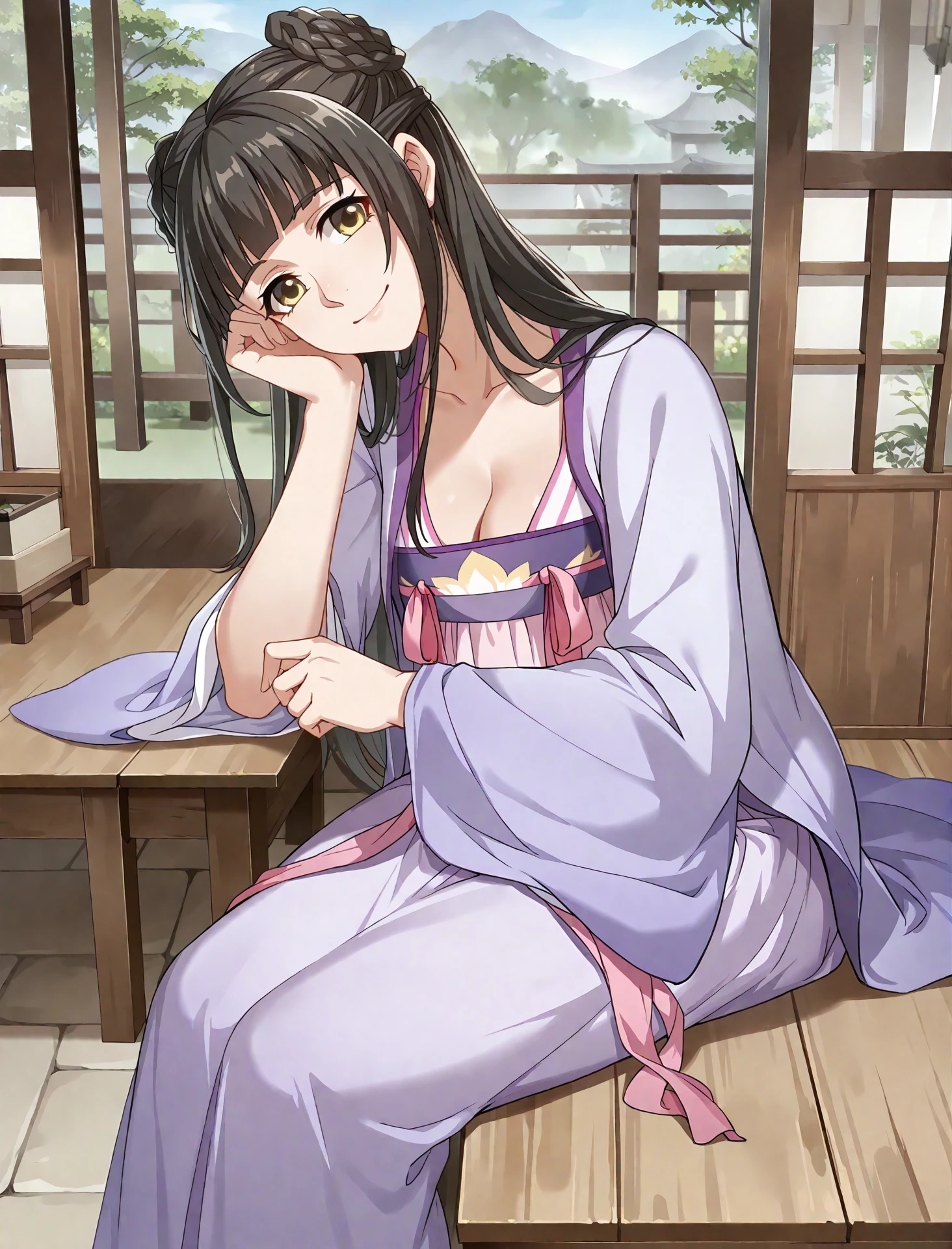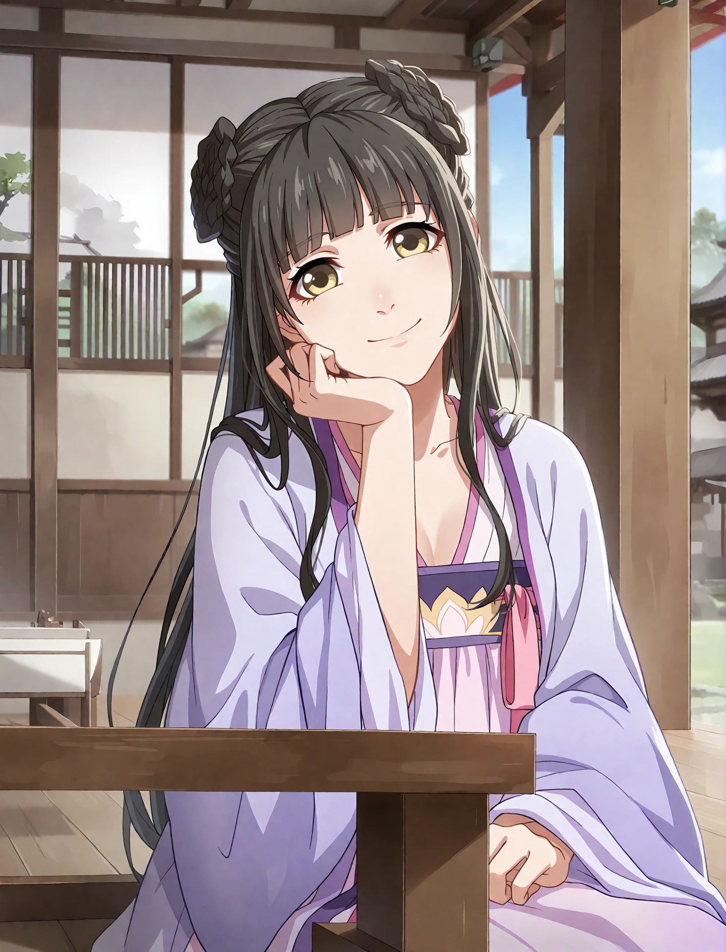jiangyanli,braid,hair bun,hanfu,long hair,yellow eyes,blunt bangs