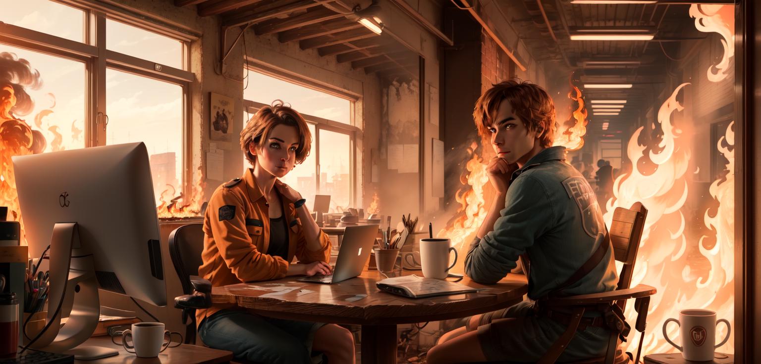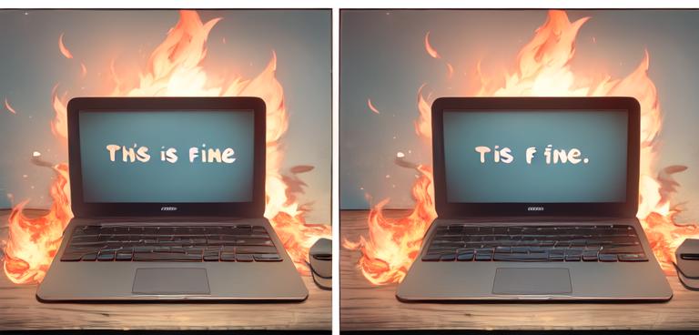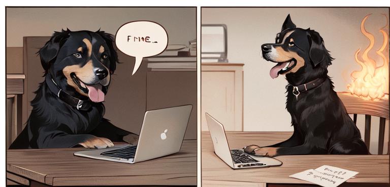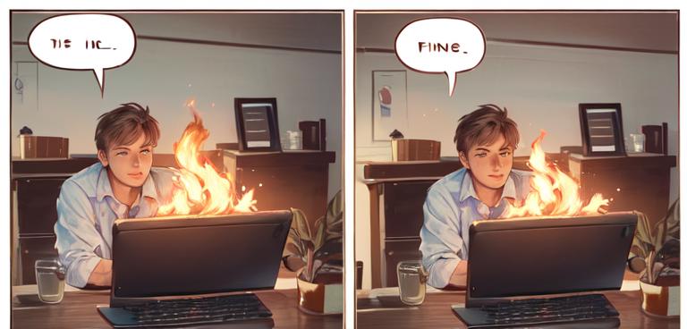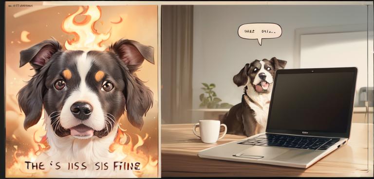 Recommended tags: 2 panel comic strip, white borders, this is fine, English text, speech bubble, fire, destruction, office, laptop, dog, sitting