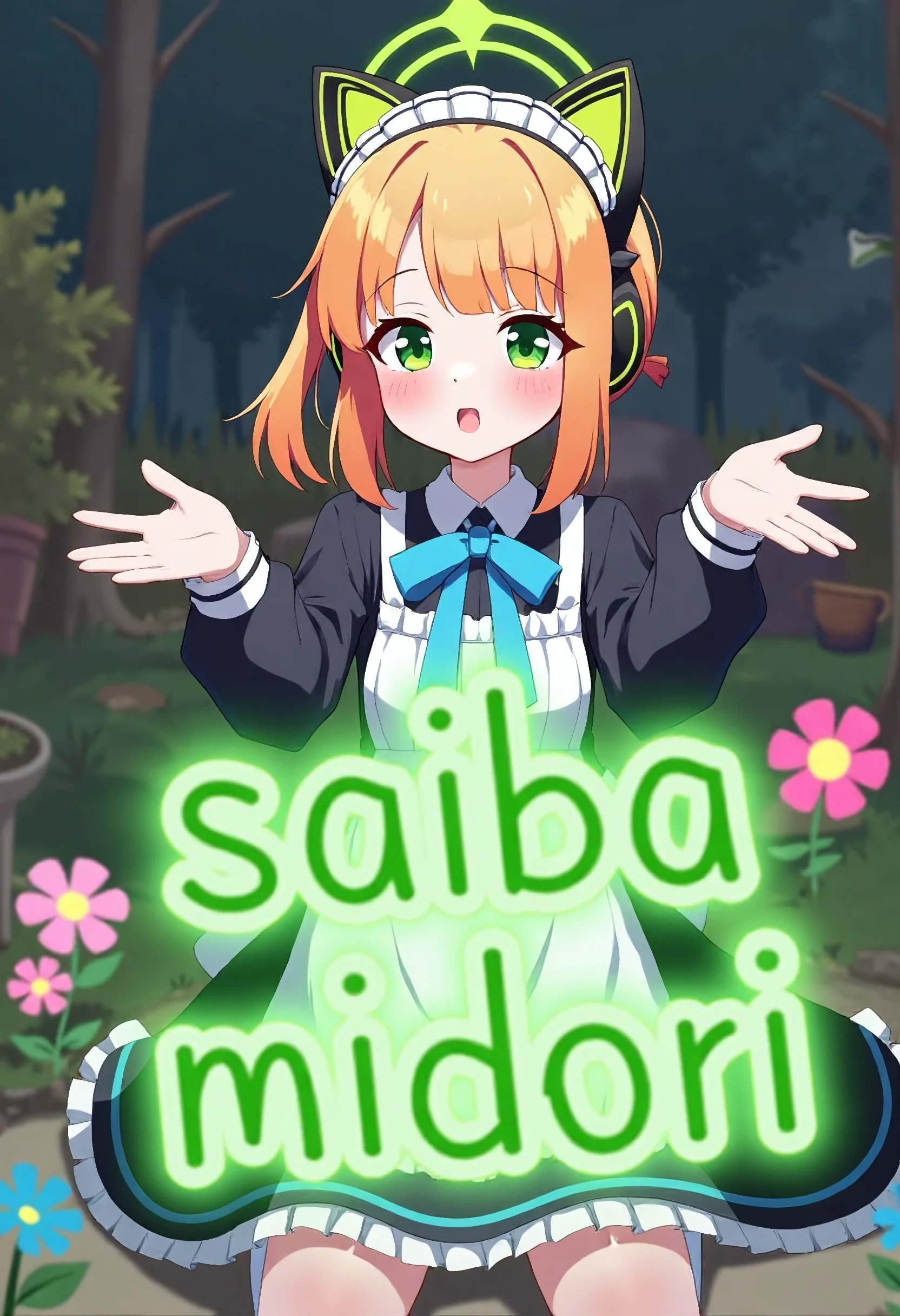 prompt example提示词示例:This is an illustration of an anime-style girl. In the foreground, there is glowing green handwriting that reads "saiba midori" in a cursive font, appearing almost like it's floating in front of the image.
