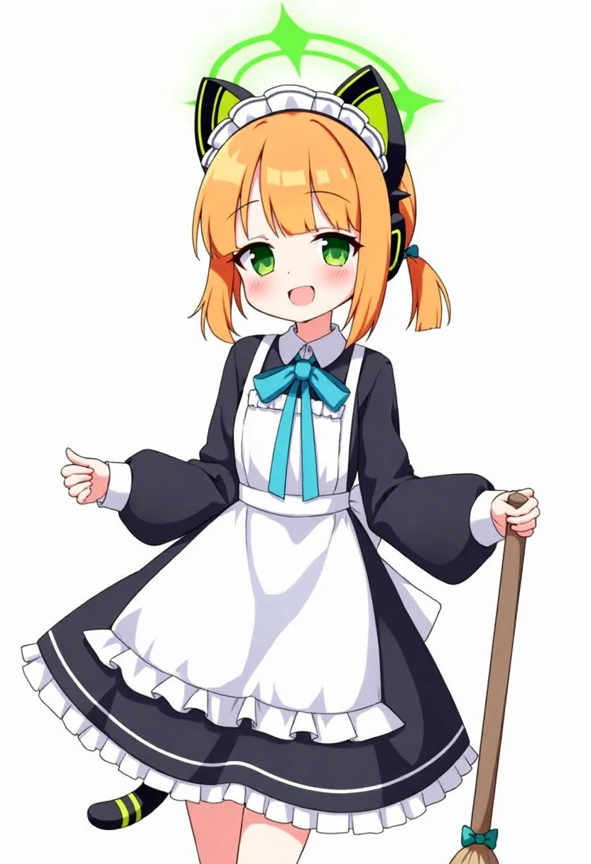 The girl herself has short, vibrant orange hair styled in two small ponytails and bright green eyes. She is dressed in a classic black and white maid uniform, complete with a frilly white apron, a white headband, and a light blue ribbon at her collar. A glowing green halo floats above her head. She is also wearing headphones designed like cat ears. In her hands, she holds a long wooden stick, which appears to be a broom.