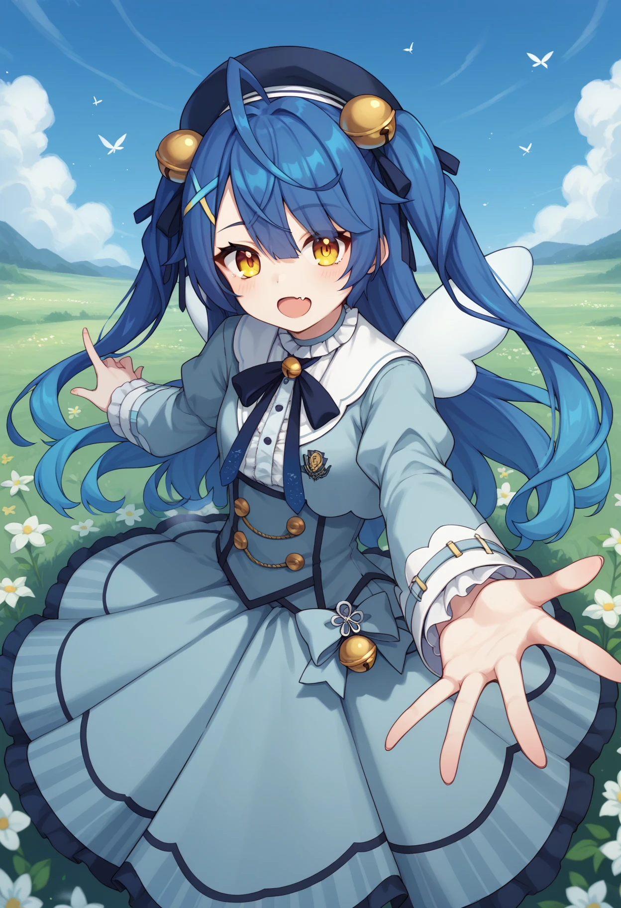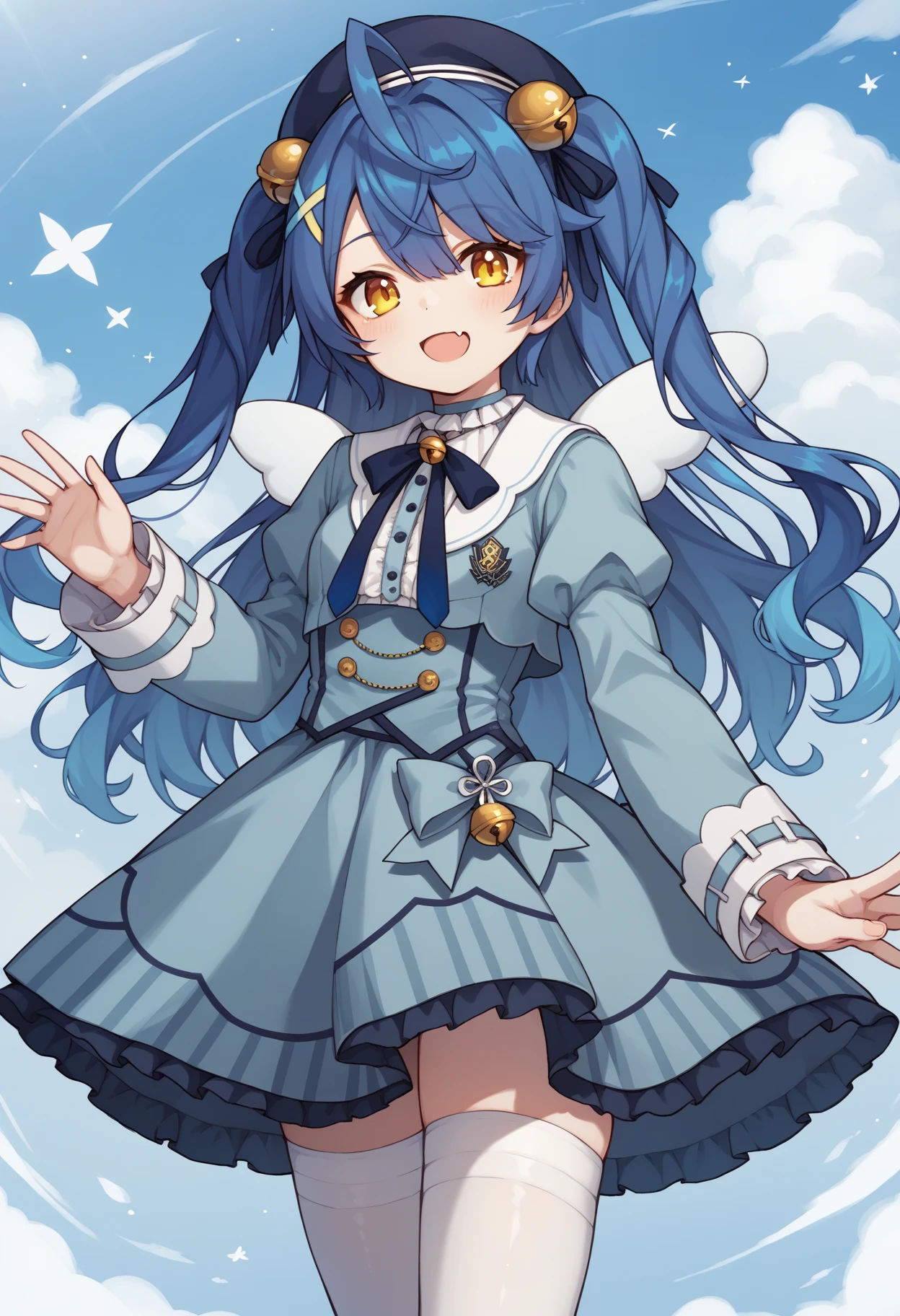 beret, dress, blue dress, long sleeves, jingle bell, wings, thighhighs, white thighhighs, black footwear