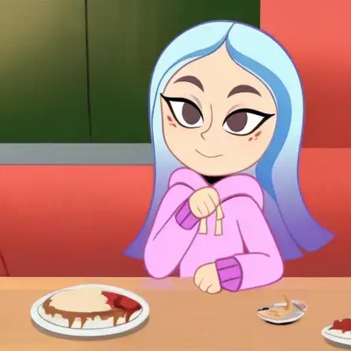 andrea davenport, blue hair, freckles, pink sweater, gray pleated skirt, purple stockings, white ankle boots,