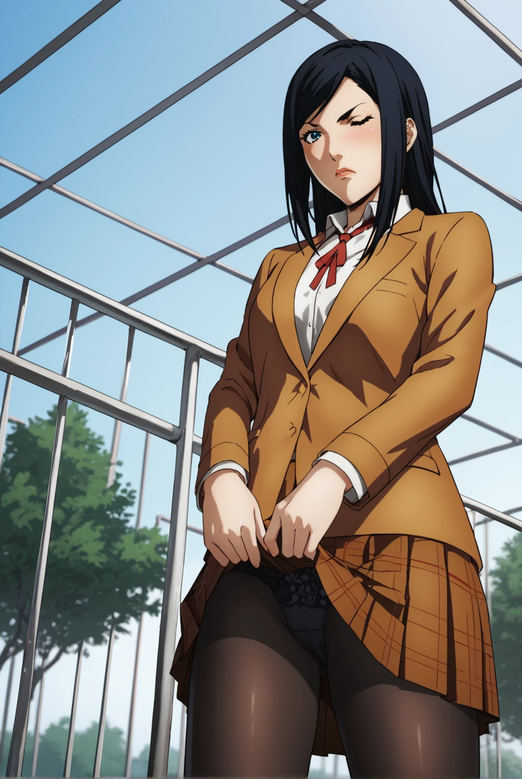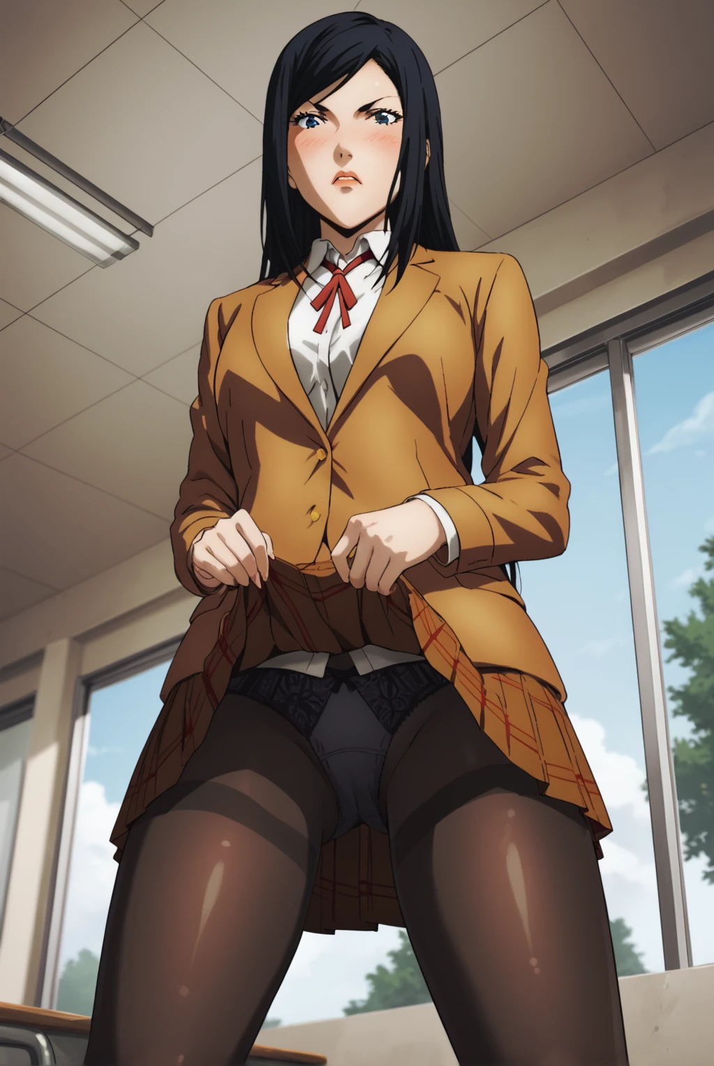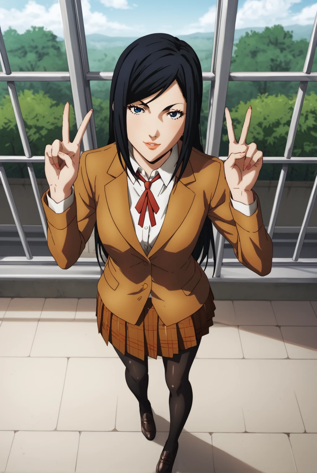 school uniform, white shirt, pleated skirt, black pantyhose, swept bangs, brown jacket, brown skirt, shoes