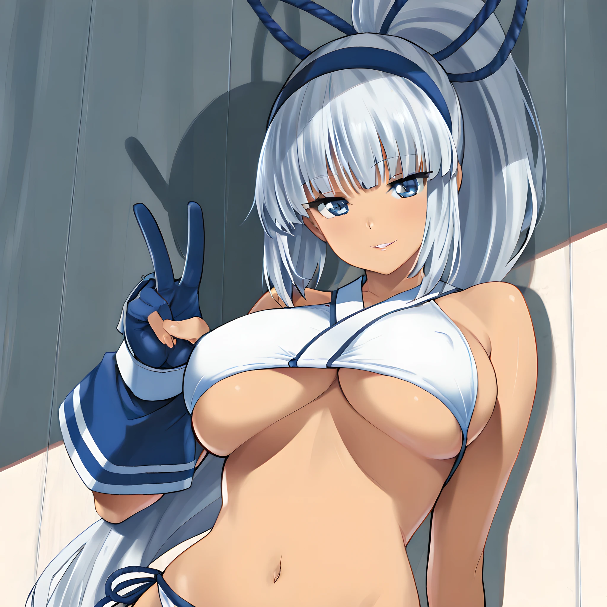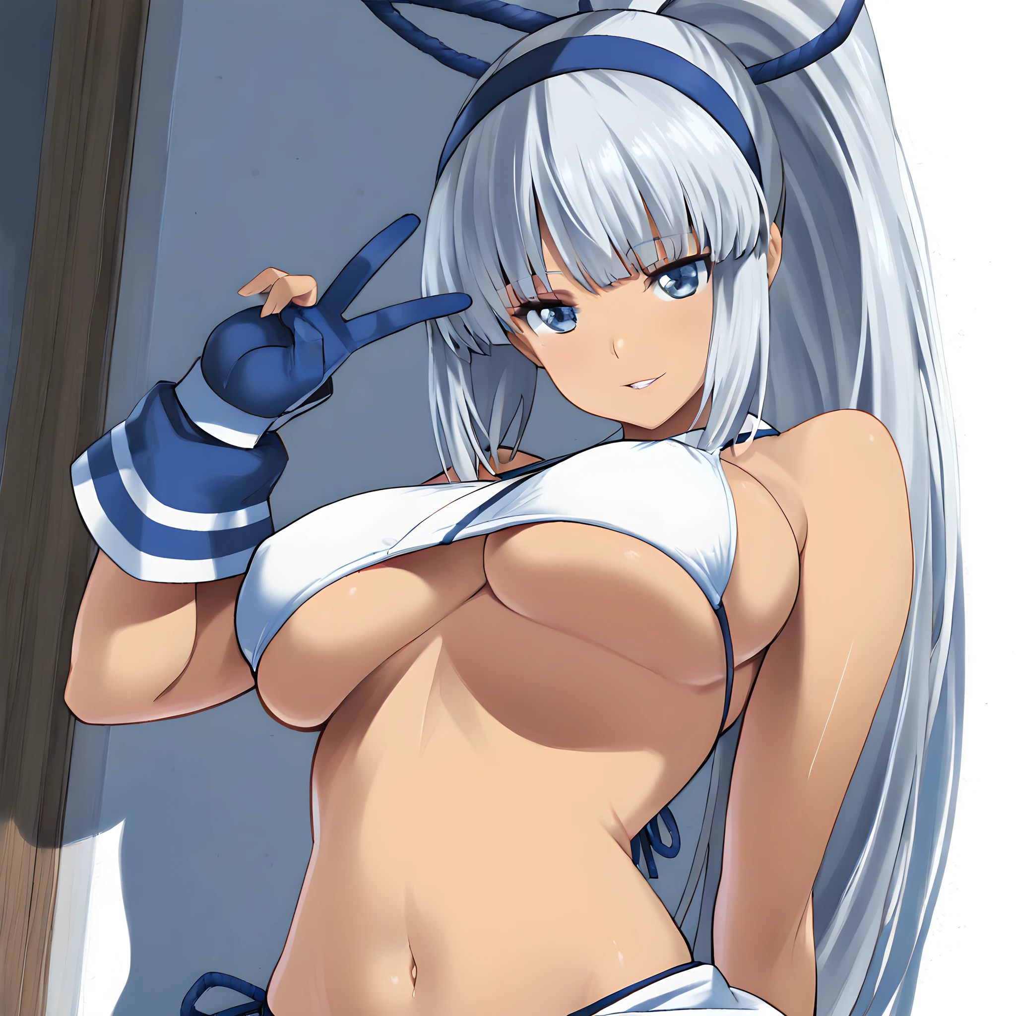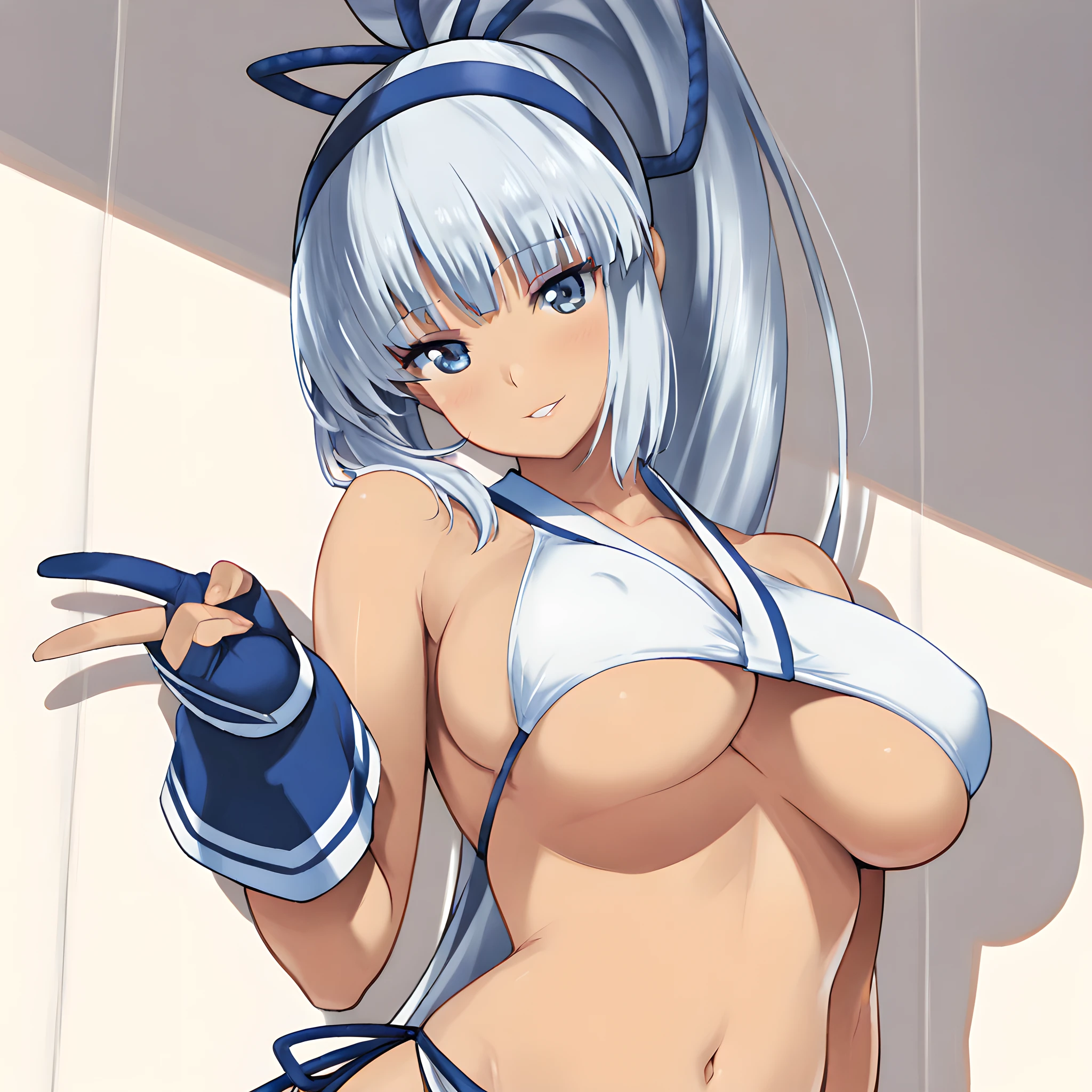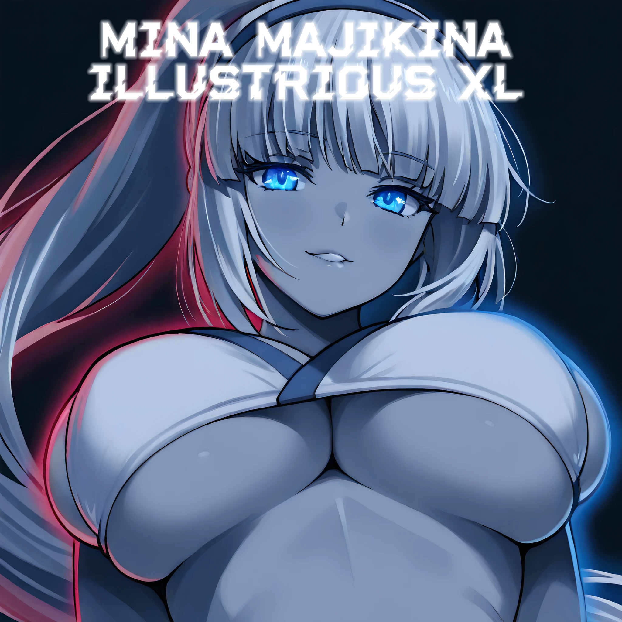 Activate using "mina majikina" tag, followed by "silver hair, blue eyes, ponytail, large breasts,"