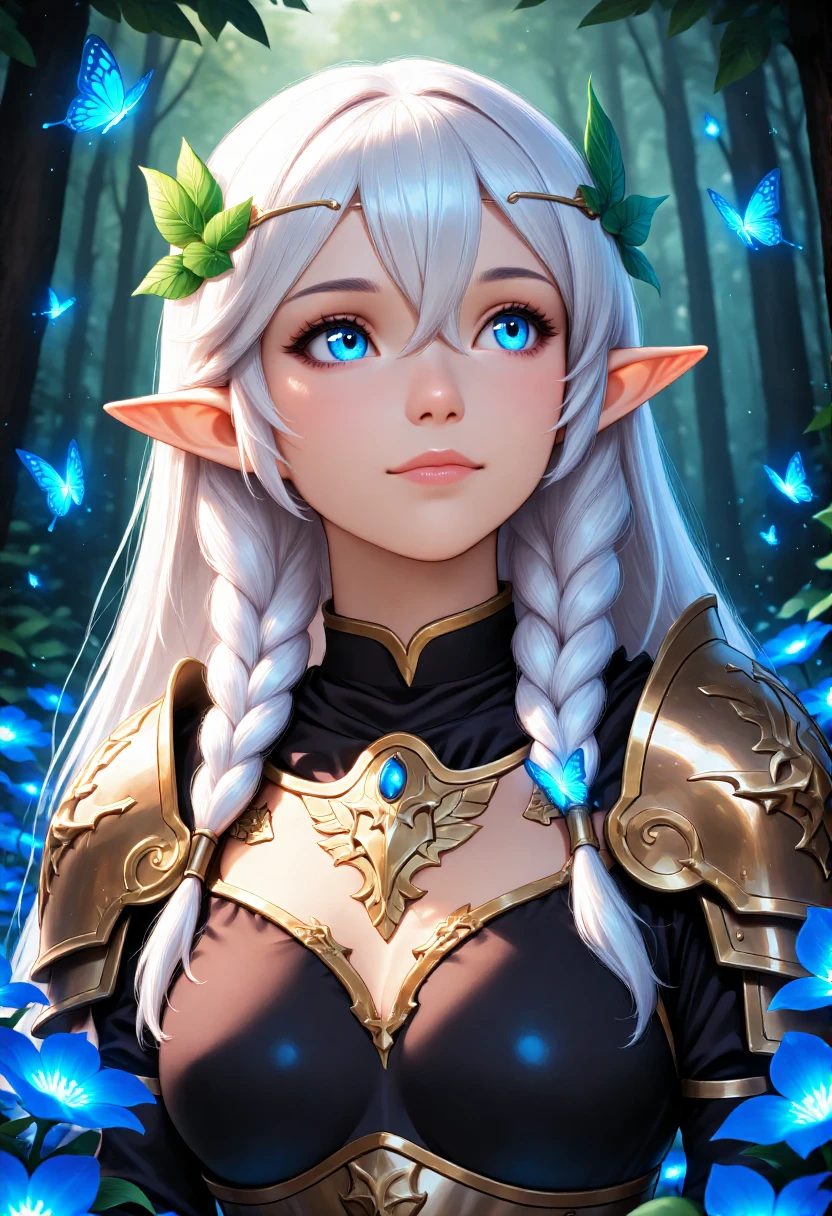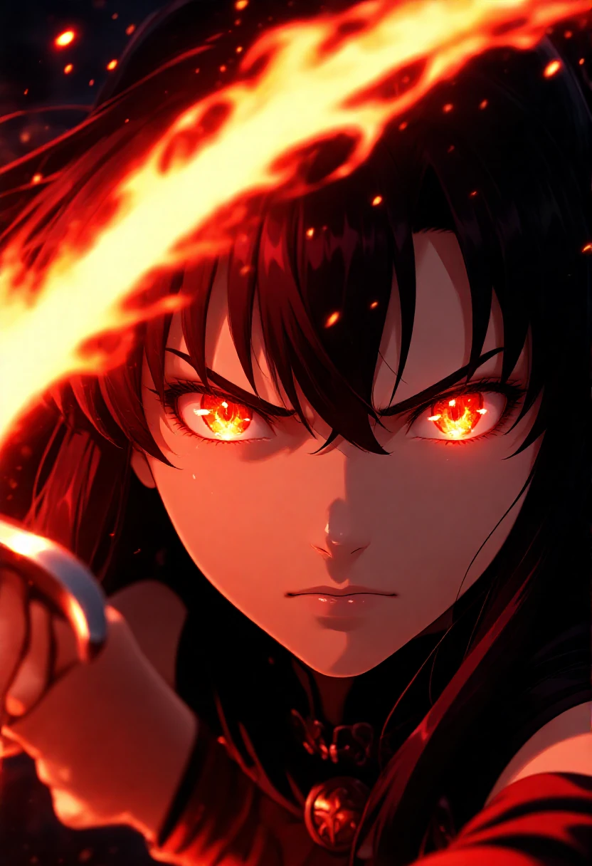 anime close-up portrait, dynamic lighting, elven swordswoman mid-battle, face glowing from flaming sword reflection, sharp cel shading like Fate/Stay Night or Demon Slayer, intense determination in her eyes, strands of black hair ???????? across her face, glowing red-orange highlights from fire, cinematic anime realism, shallow depth of field, bokeh sparks behind, ultra-detailed 8K anime face, heroic expression, modern fantasy action style. Rendered in ultra high definition 8K resolution.Use Case: Ideal for character portraits and vertical compositions