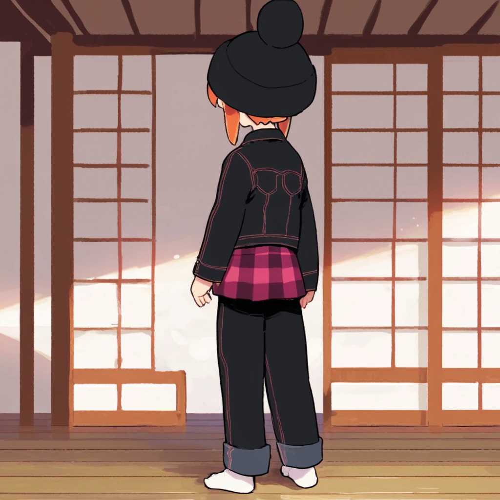 Prompt: 1girl, usagi_kurokawa, beanie, black headwear, hat ornament, orange hair, bangs, short hair, sidelocks, denim jacket, black jacket, collared jacket, breast pocket, long sleeves, skirt, plaid skirt, pants under skirt, black pants, jeans, sneakers, black footwear