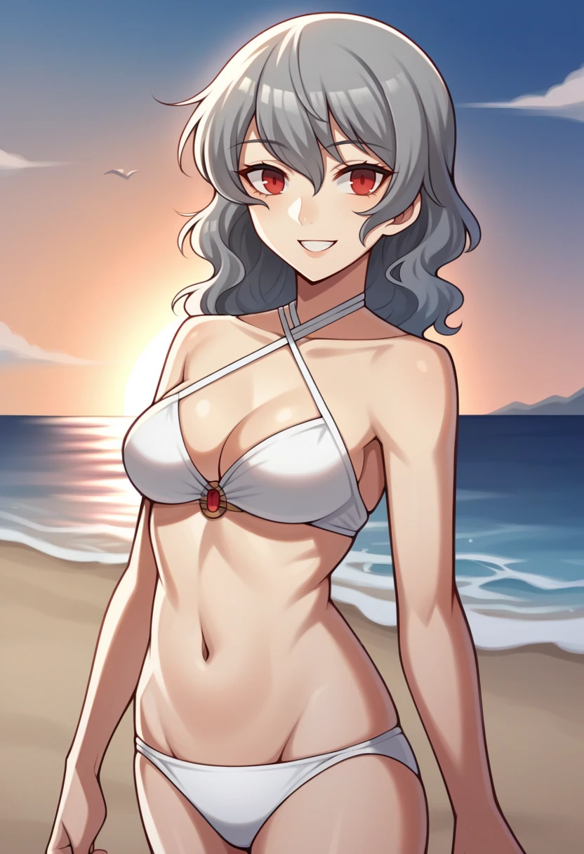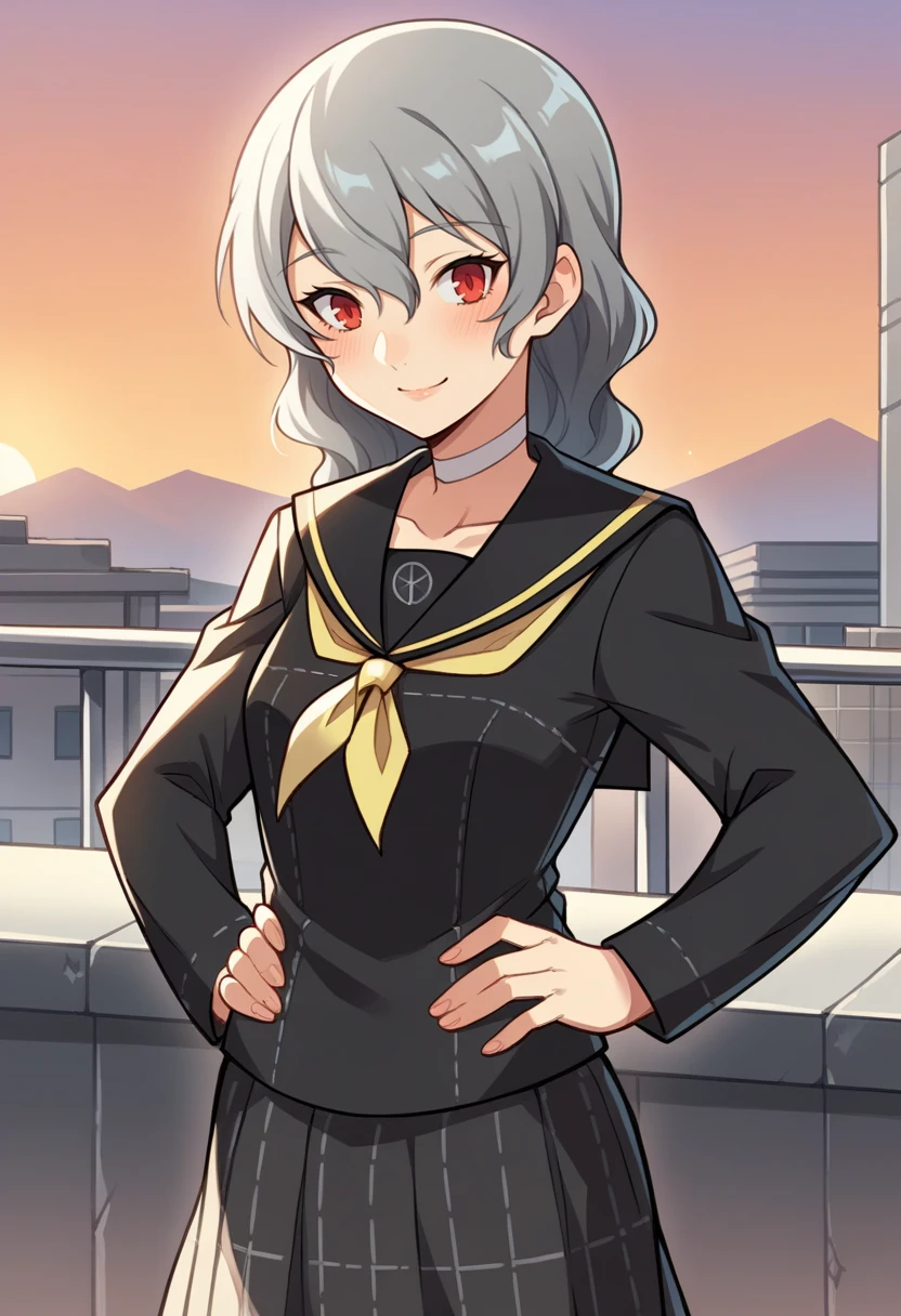 School uniform: izanamischool, grey hair, long hair, red eyes, white choker, black serafuku, yasogami school uniform, grey skirt,