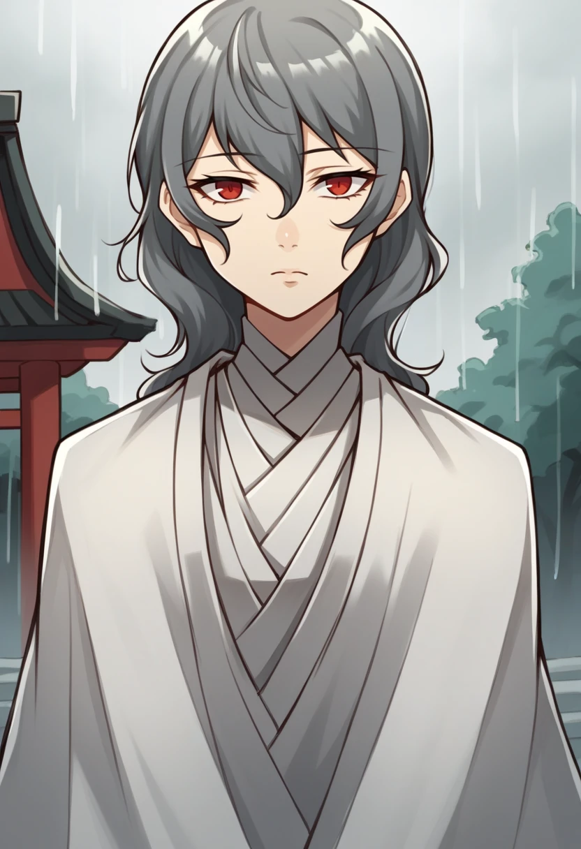izanamidef, grey hair, long hair, red eyes, white robe,