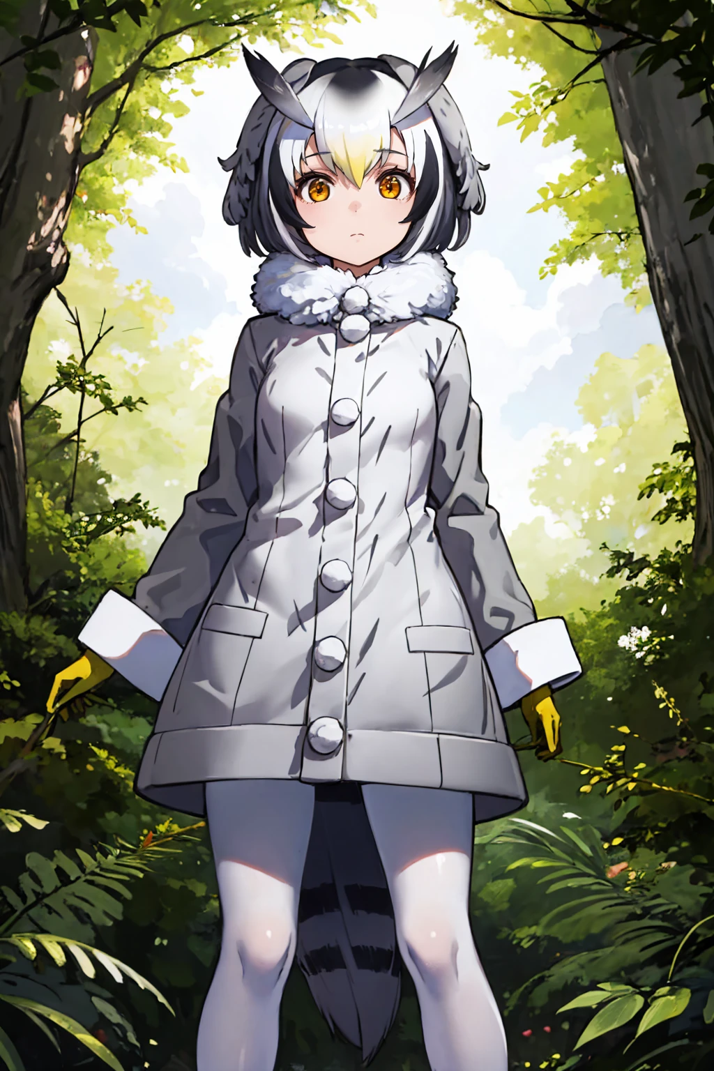 grey coat, fur collar, long sleeves, yellow gloves, white pantyhose