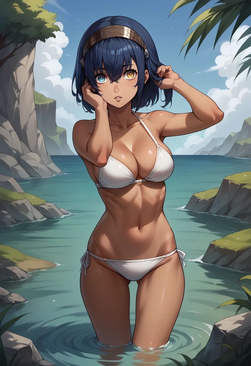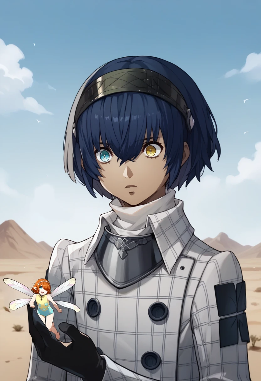 protagonistMR, short hair, hair between eyes, hairband, heterochromia, yellow eyes, blue eyes, dark skin, plaid coat, collared jacket, black pants, black gloves