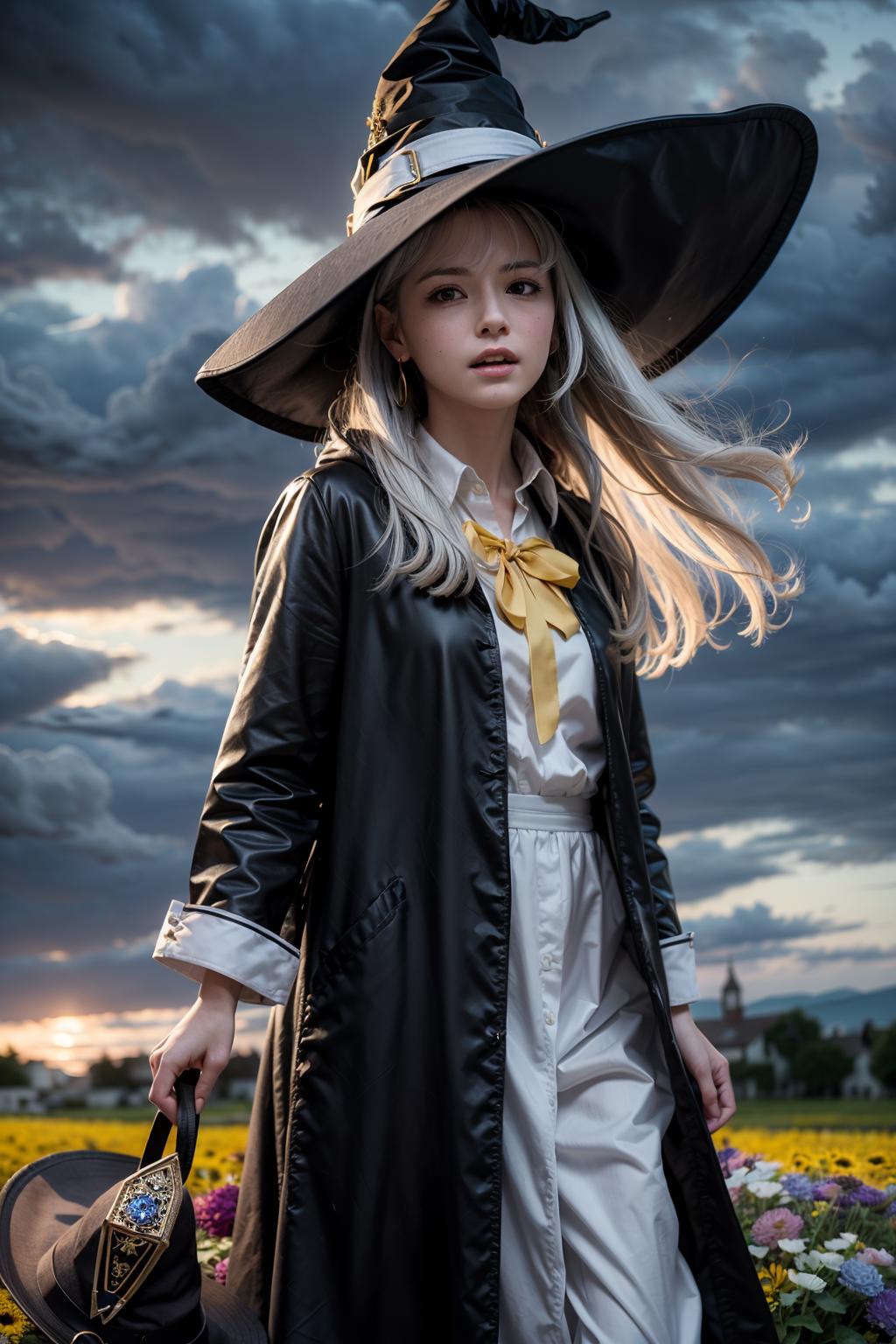 Majo: phelaina, Eouftit3, elaina (majo no tabitabi),1girl, solo, witch hat, long hair, black headwear, blue eyes, collared shirt, hair between eyes, white shirt, yellow ribbon, bangs, neck ribbon, witch, open clothes, blush, anime coloring, hood, yellow bow, jewelry, floating hair, yellow bowtie, shiny hair, black robe, open robe, dress shirt