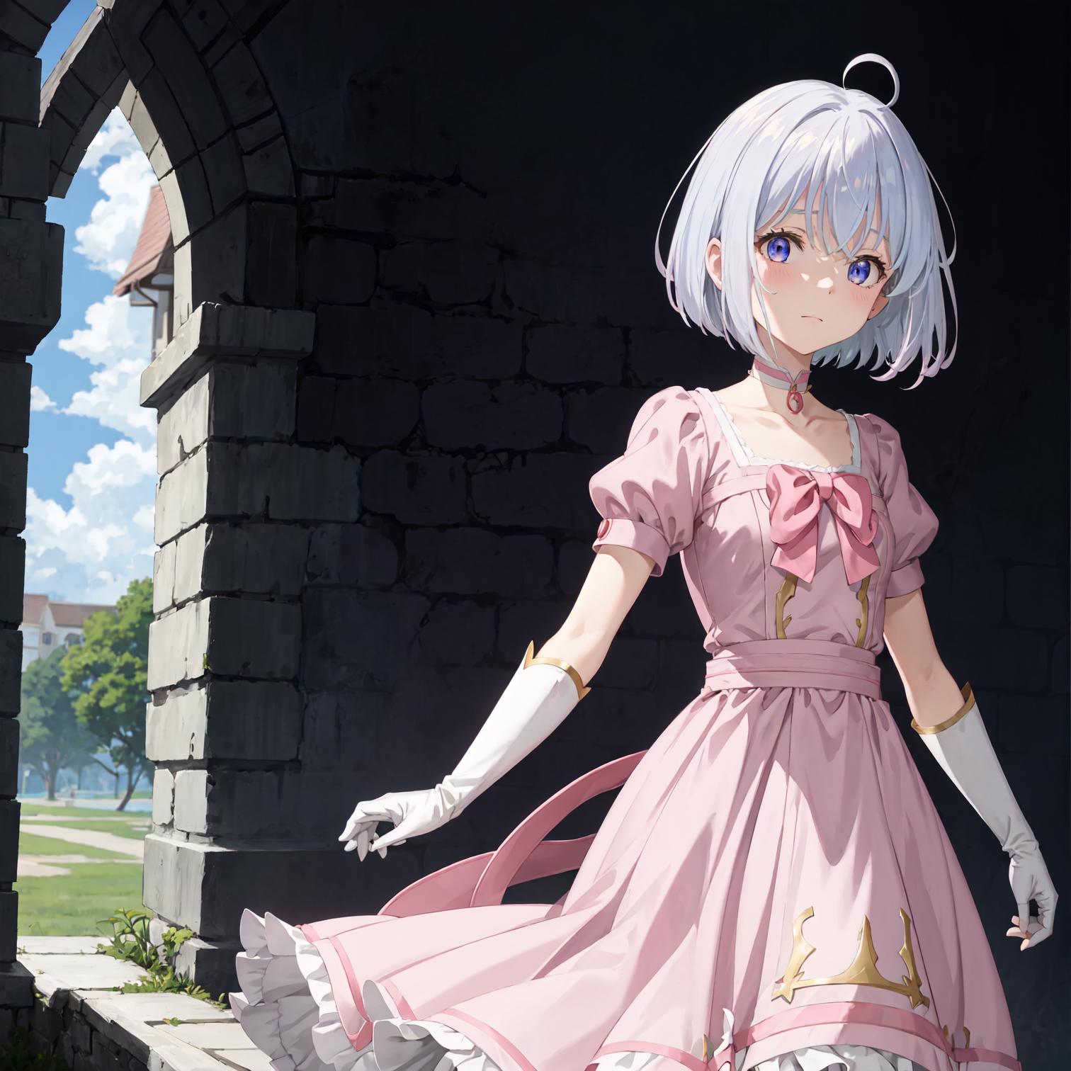 拍卖会: ph elaina, Eoutfit5, elaina (majo no tabitabi), dress, choker, short hair, pink dress, 1girl, short sleeves, puffy short sleeves, white hair, pink gloves, pink choker, hair between eyes, bow, collarbone, blue eyes, elbow gloves, bangs, solo, pink bow, red bow, jewelry
