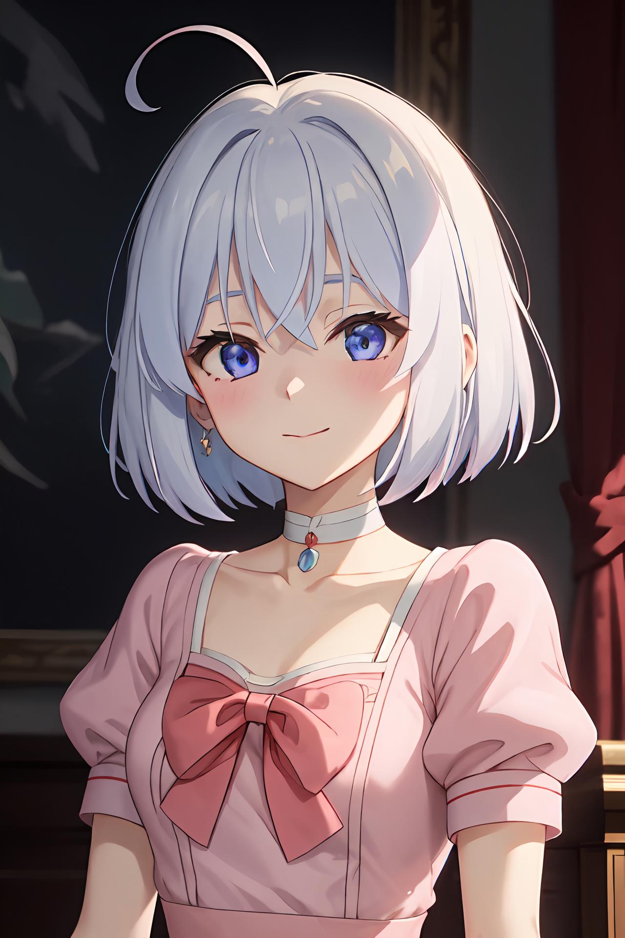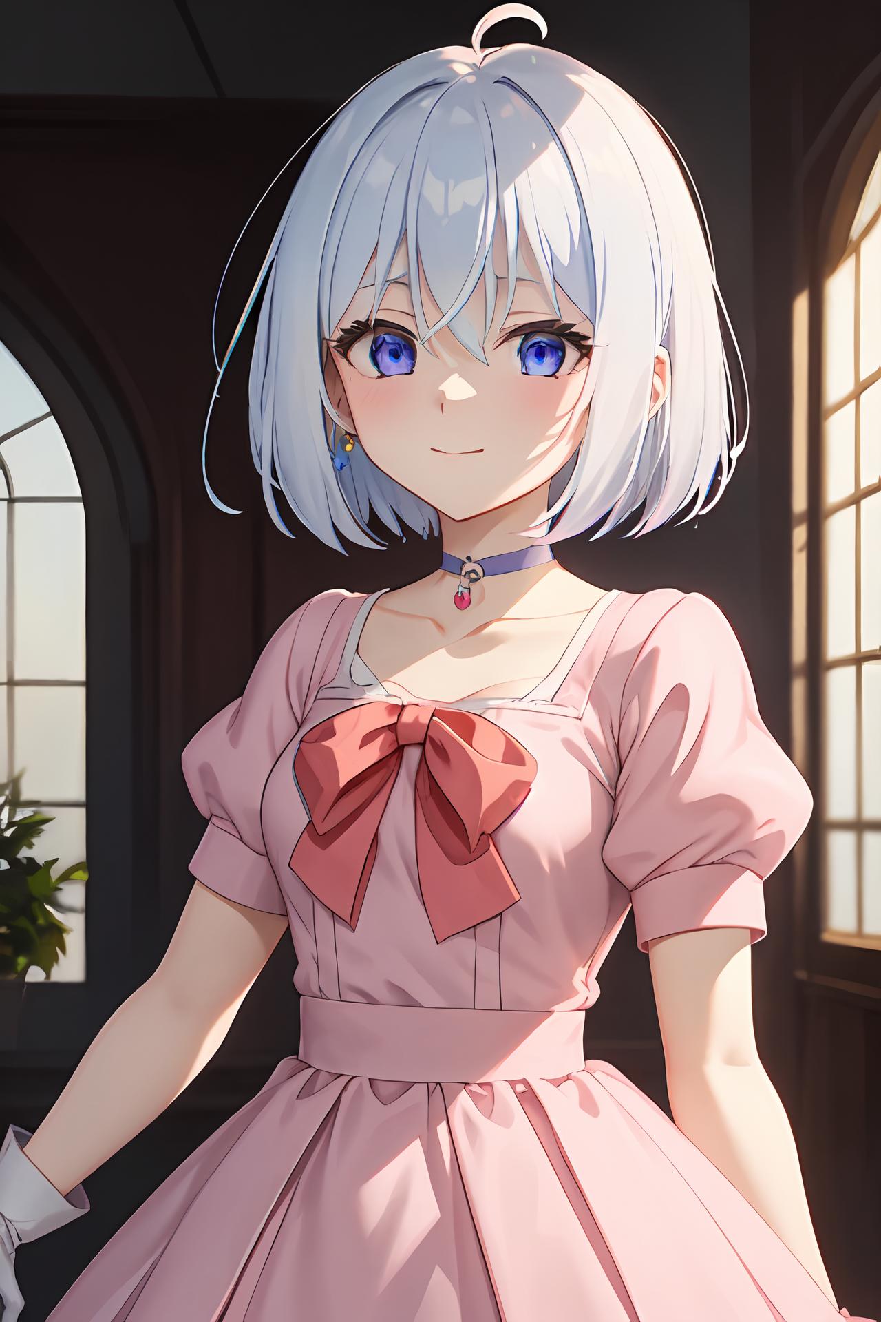 Party: ph elaina, Eoutfit5, elaina (majo no tabitabi), dress, choker, short hair, pink dress, 1girl, short sleeves, puffy short sleeves, white hair, pink gloves, pink choker, hair between eyes, bow, collarbone, blue eyes, elbow gloves, bangs, solo, pink bow, red bow, jewelry