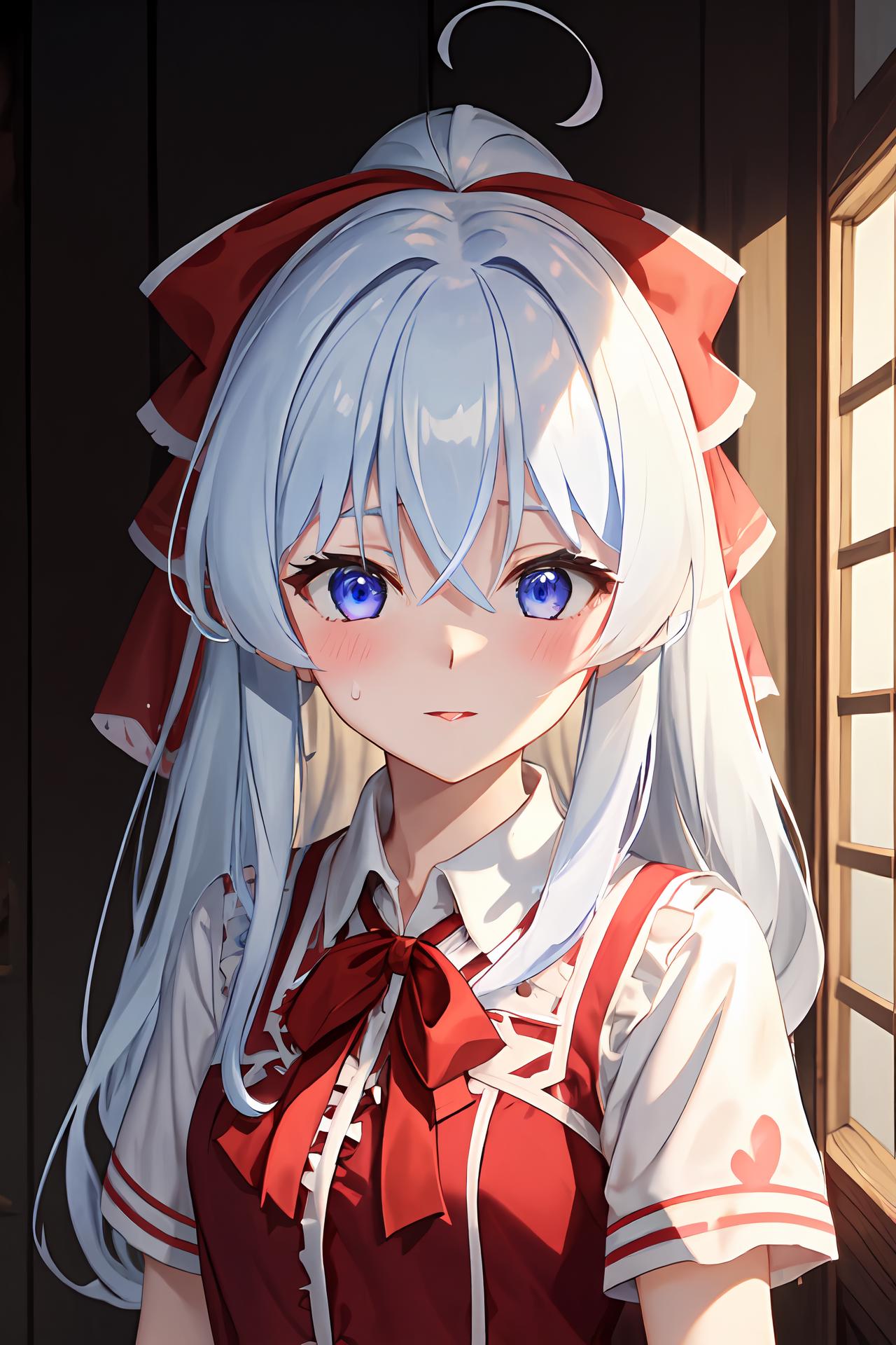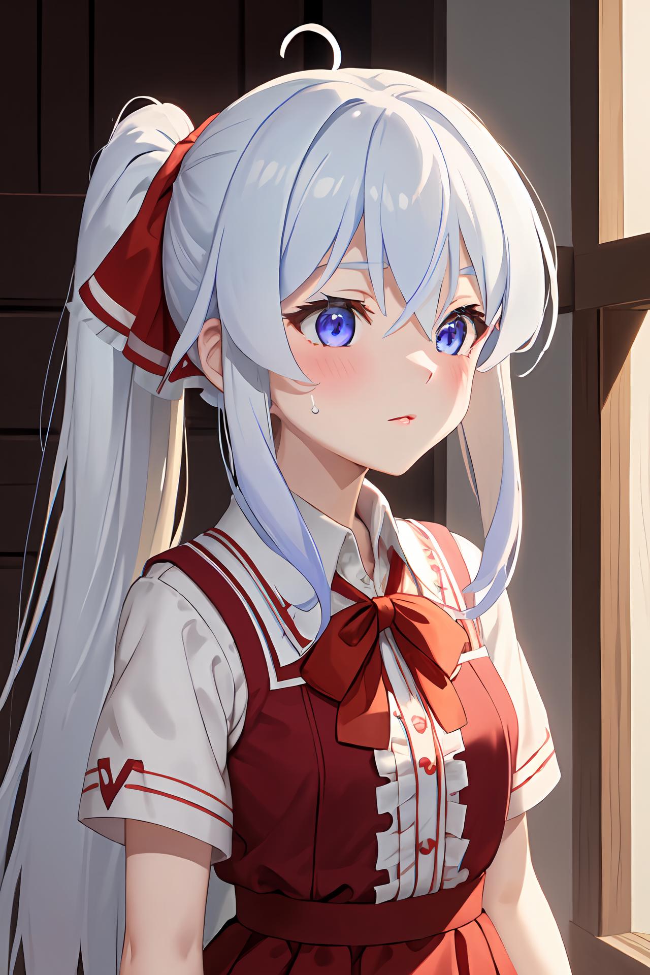 踩葡萄少女: ph elaina, Eoutfit1, elaina (majo no tabitabi), long hair, bangs, shiny, hair between eyes, sweatdrop, blue eyes, ribbon, ponytail, red ribbon, collared shirt, hair ribbon, red shirt, short sleeves, parted lips, red dress, frills, white hair, hair bow, red bow, wing collar, white shirt, blush, sweat, alternate hairstyle, crossed bangs