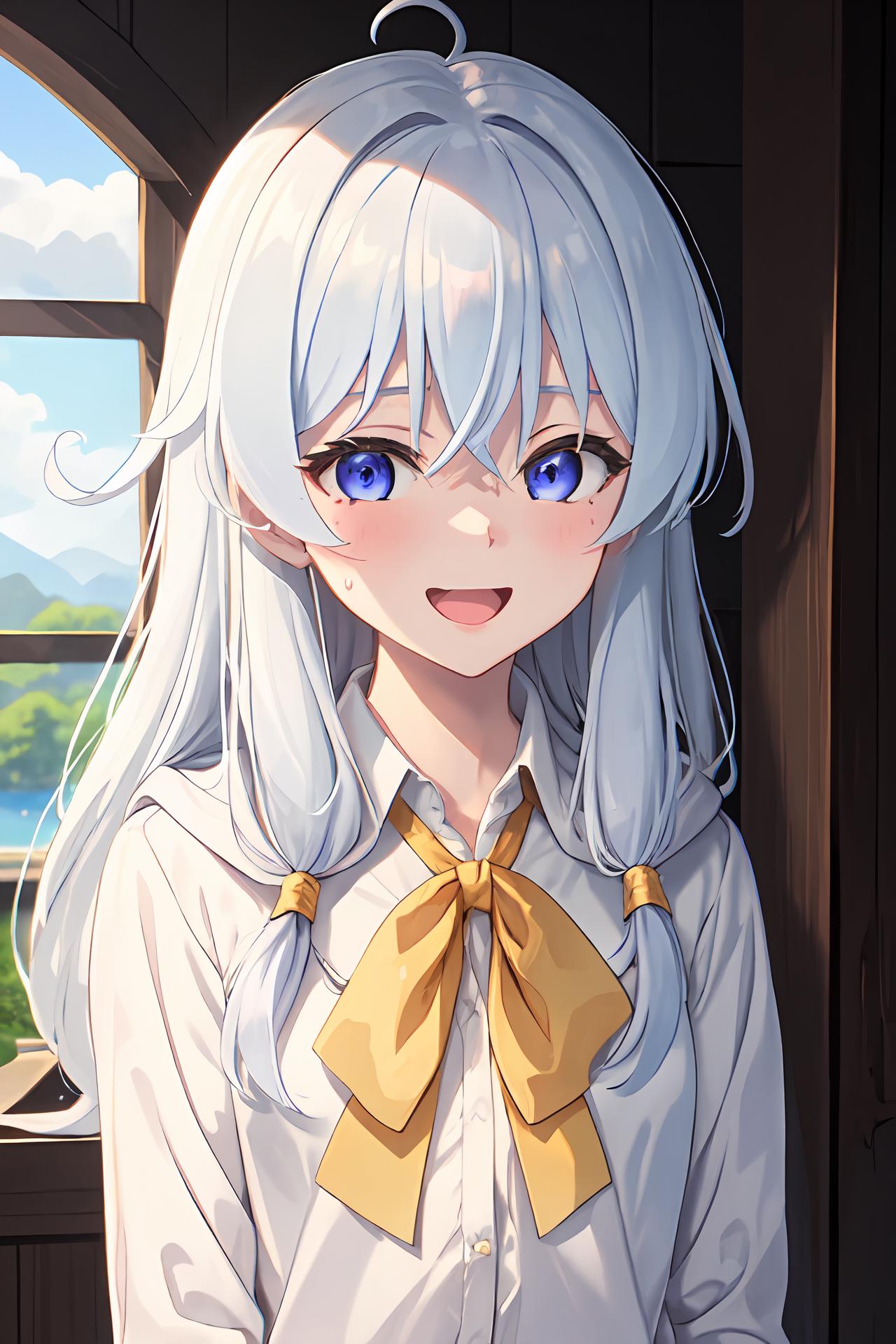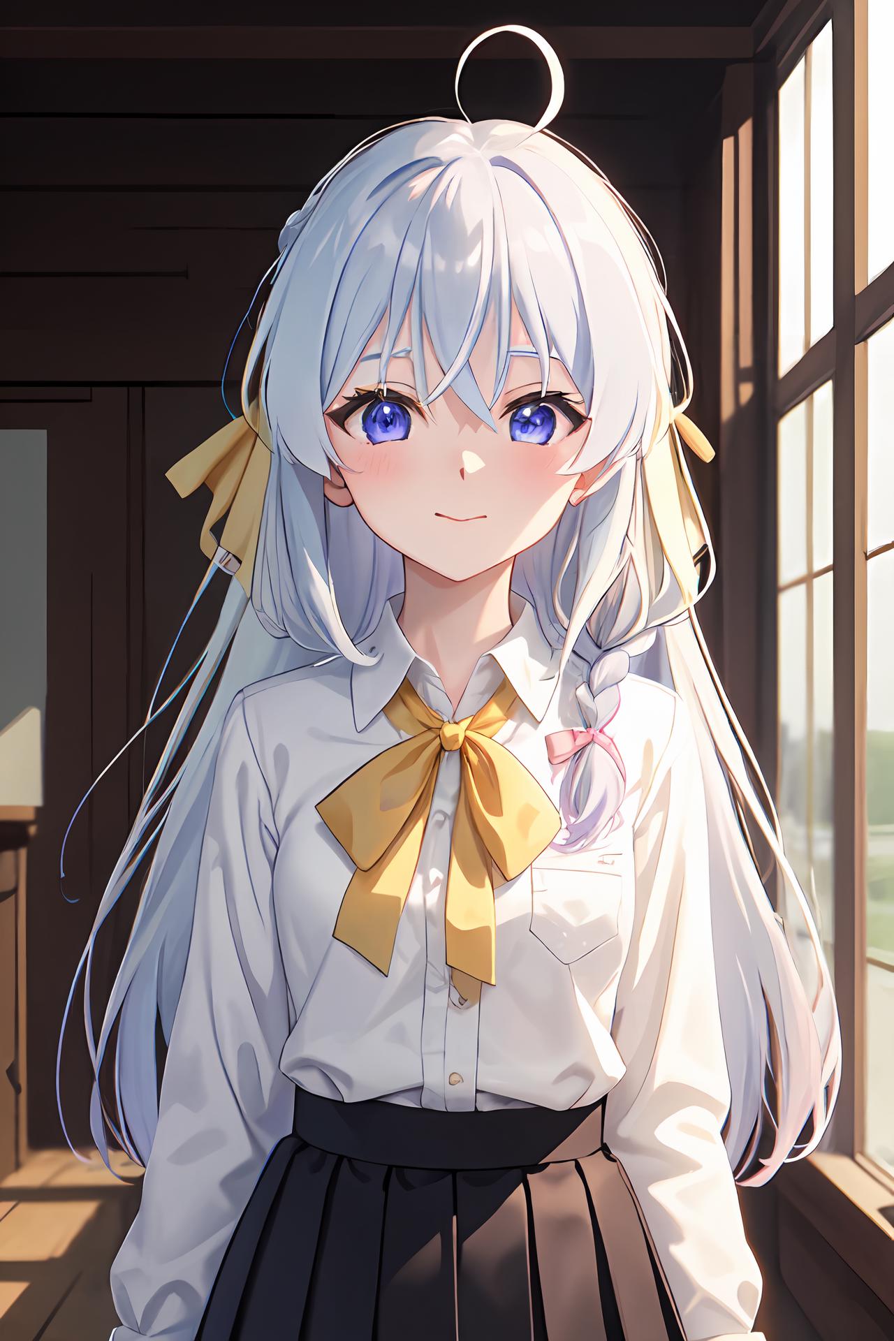 Normal: ph elaina, Eoutfit4, elaina (majo no tabitabi), solo, long hair, bow, white shirt, blush, skirt, bangs, hair between eyes, blue eyes, bowtie, hair bow, collared shirt, long sleeves, shiny hair, neck ribbon, dress shirt, sidelocks, pleated skirt, pocket, hair tubes, white hair, single braid, wing collar, pink ribbon, school uniform, shiny, hair ribbon, anime color,