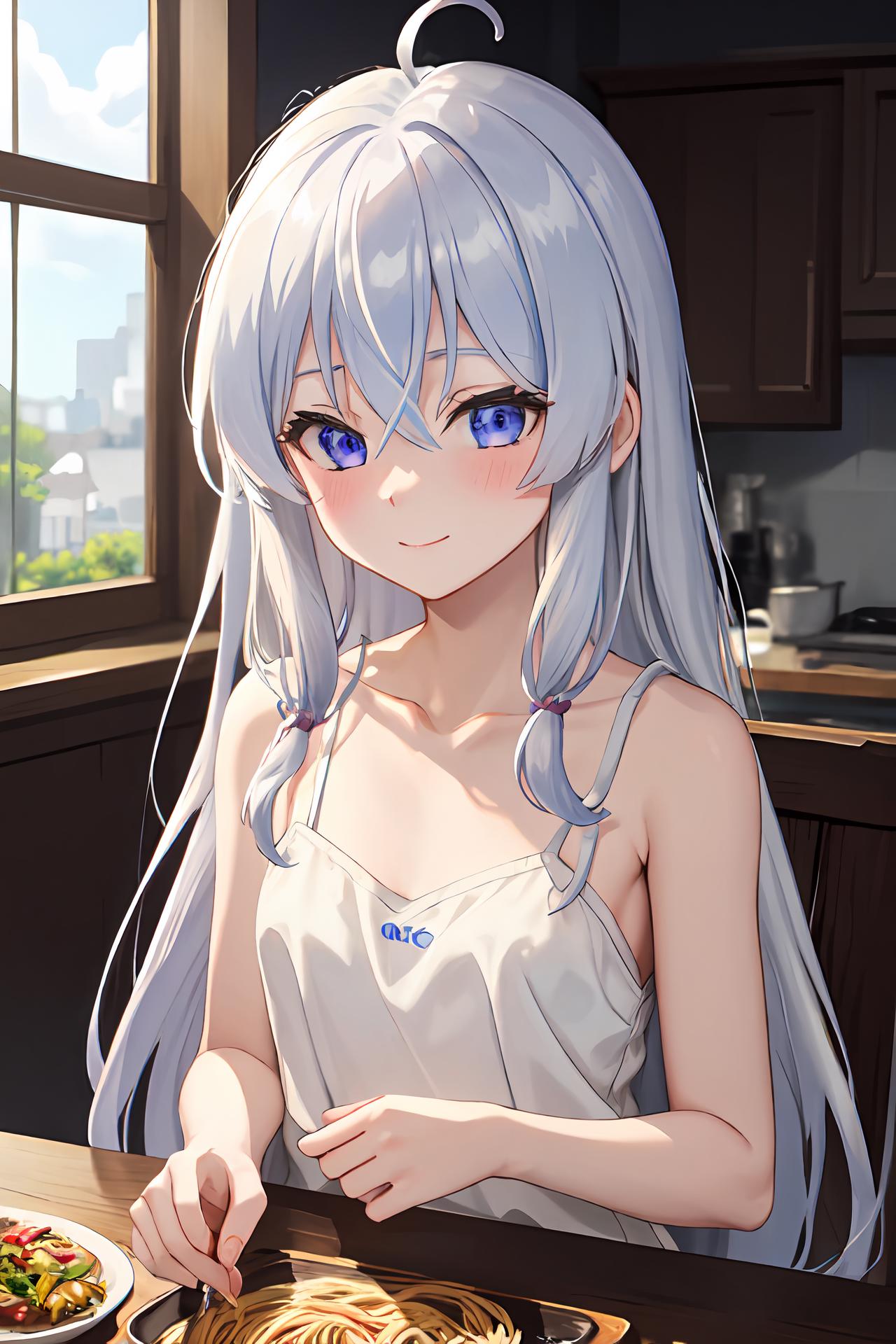 睡衣(长发): ph elaina, Eoutfit6, elaina (majo no tabitabi), solo, long hair, ahoge, hair between eyes, collarbone, blue eyes, bangs, white hair, sleeveless, bare shoulders, shiny hair, camisole, spaghetti strap, white shirt, sleeveless shirt, blush, very long hair, sidelocks, sleeveless dress