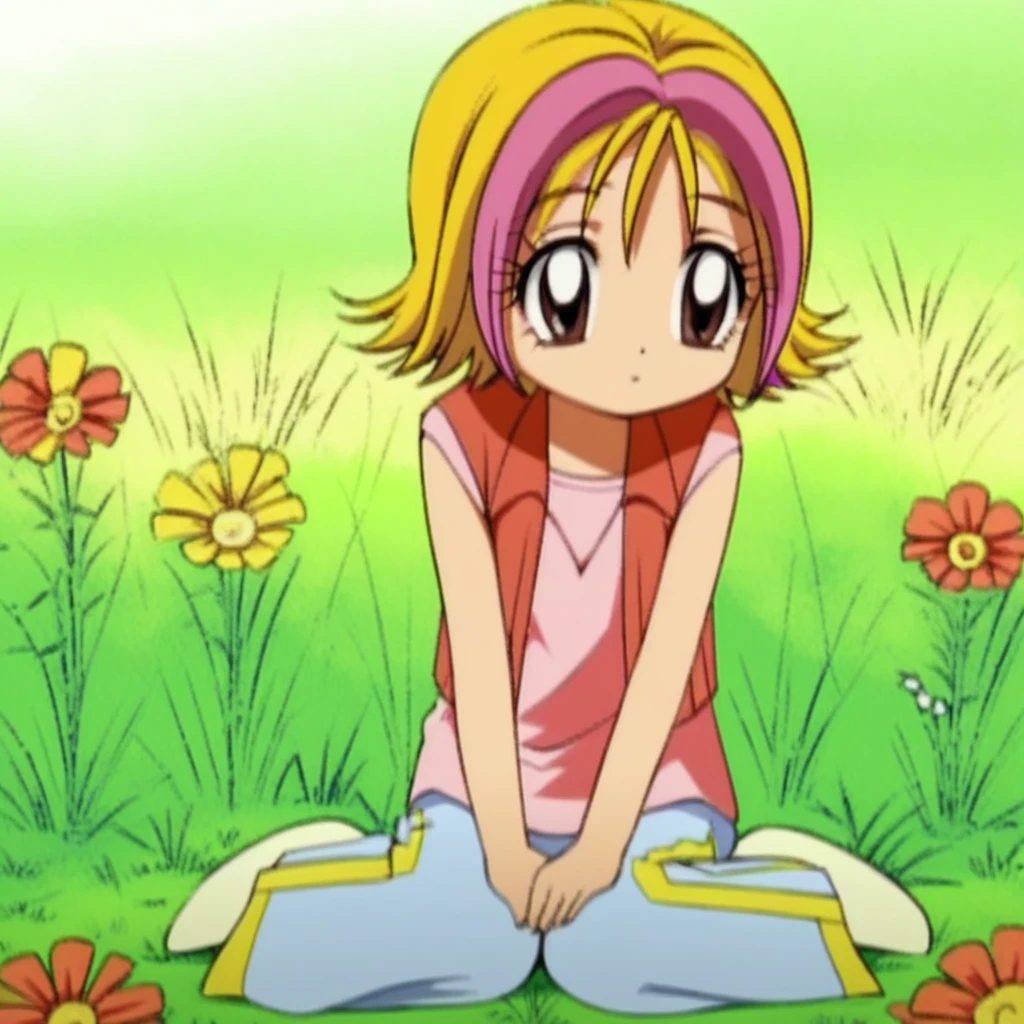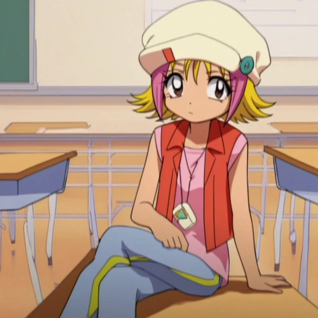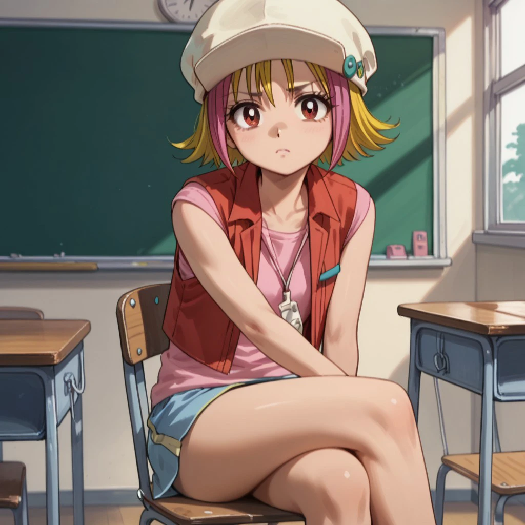 sayo_k, blonde_hair, short hair, multicolored hair, brown eyes, red vest, pink shirt