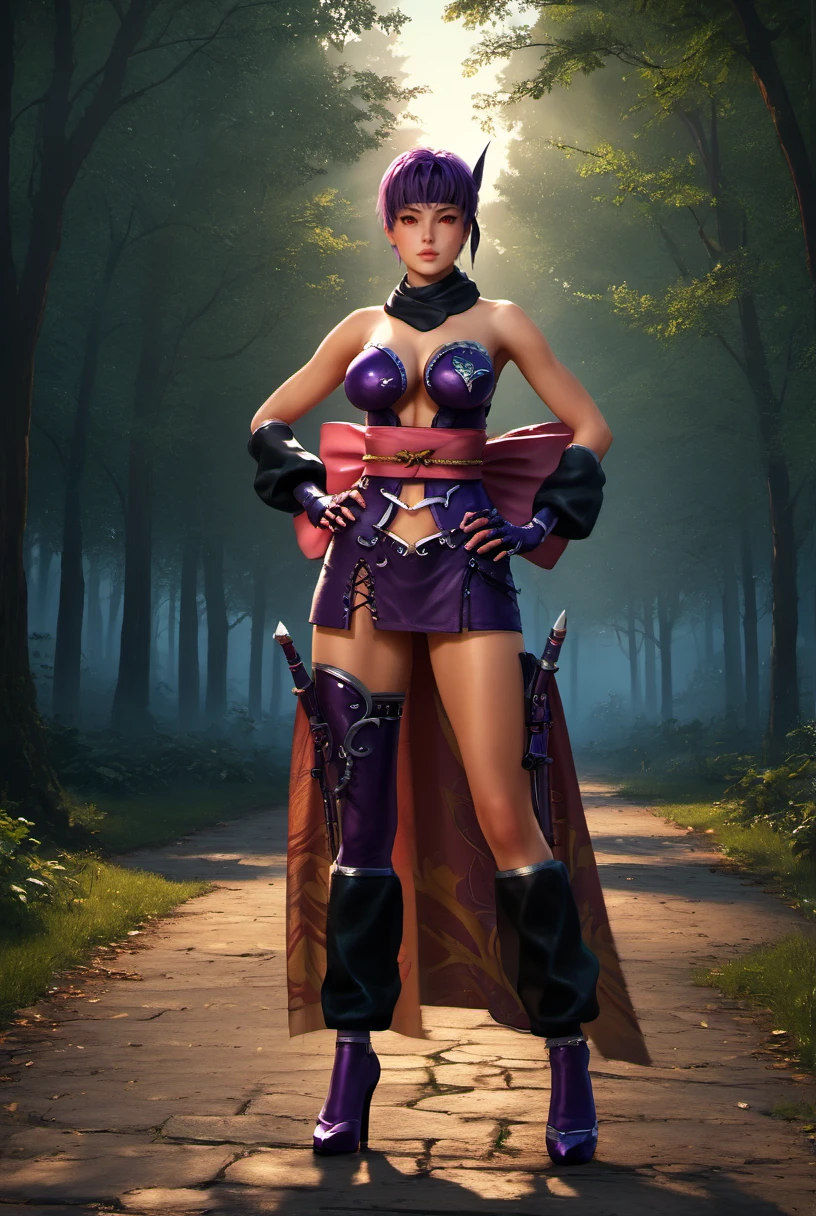 headband, black scarf, bare shoulders, purple top, clothing ornament, cleavage, navel, pink sash, fingerless gloves, detached sleeves, arm warmers, purple miniskirt, asymmetrical legwear, thigh strap, single thighhigh, leg warmers, high heels,