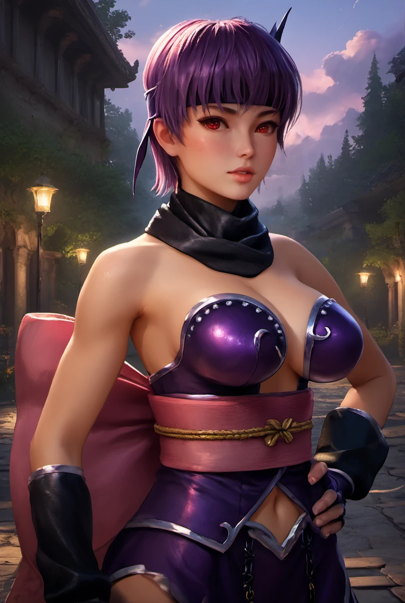 Use; NGB2_Aya, short hair, red eyes, purple hair, large breasts, for her key features;