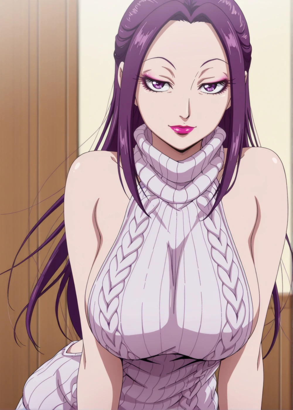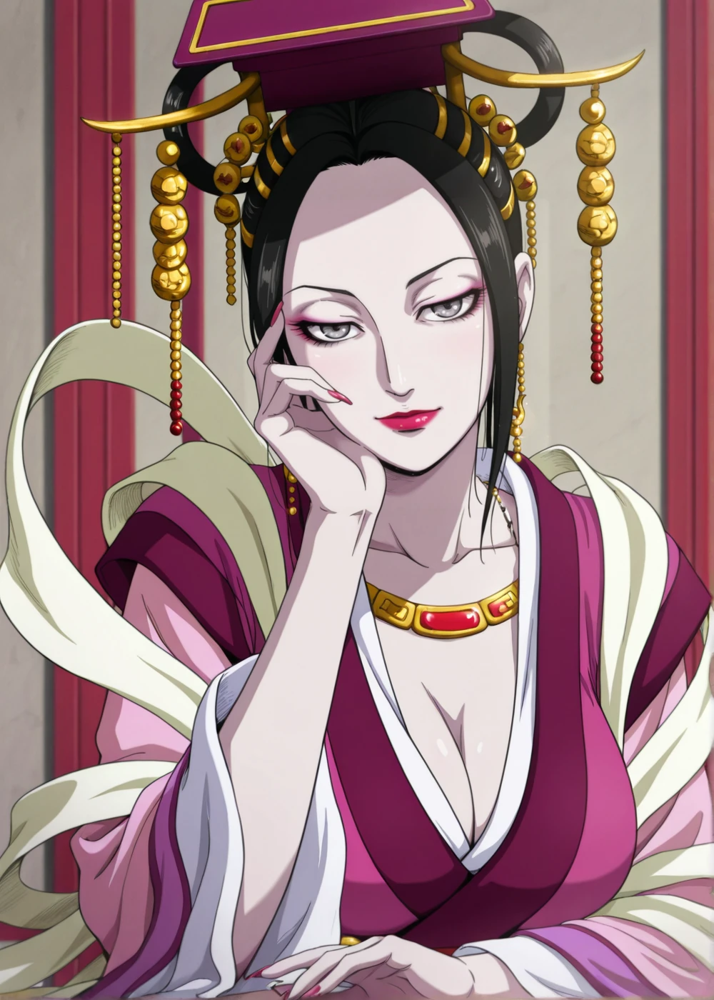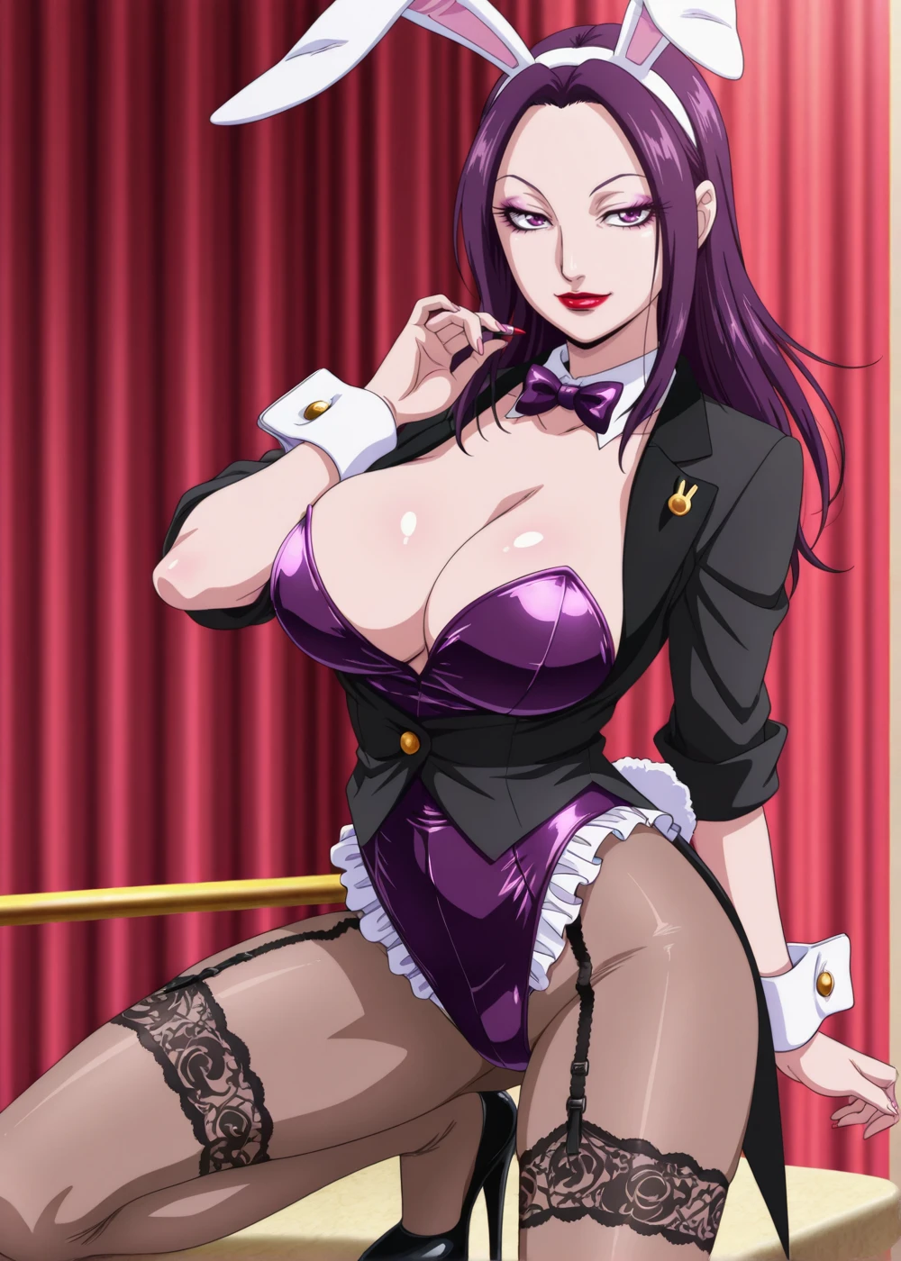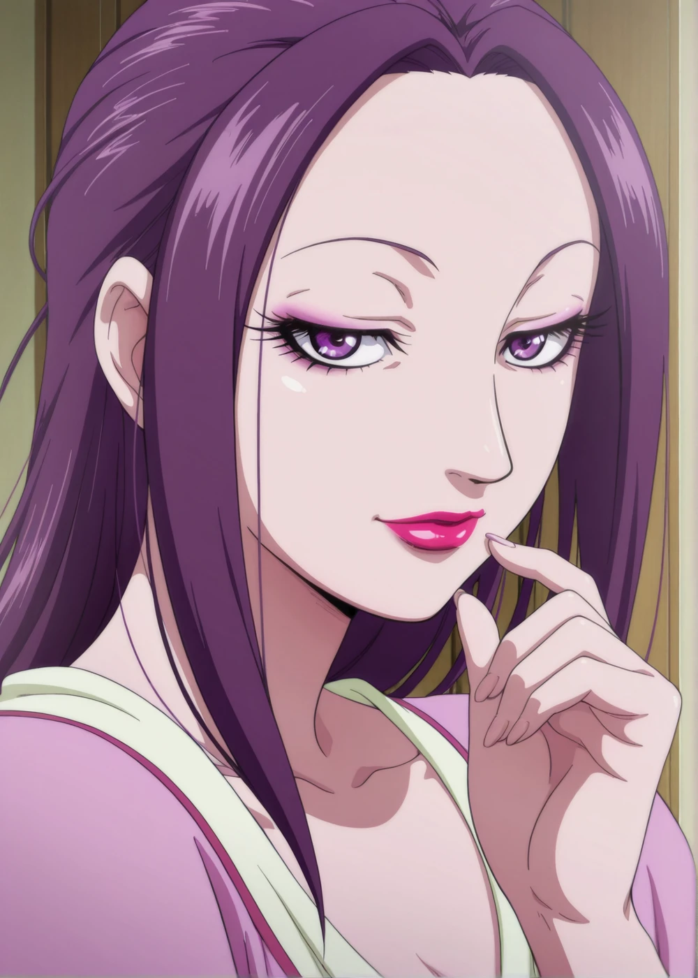 BiKi (Queen Mother), 1girl, solo, long hair, purple eyes, purple hair, makeup, lipstick, eyelashes