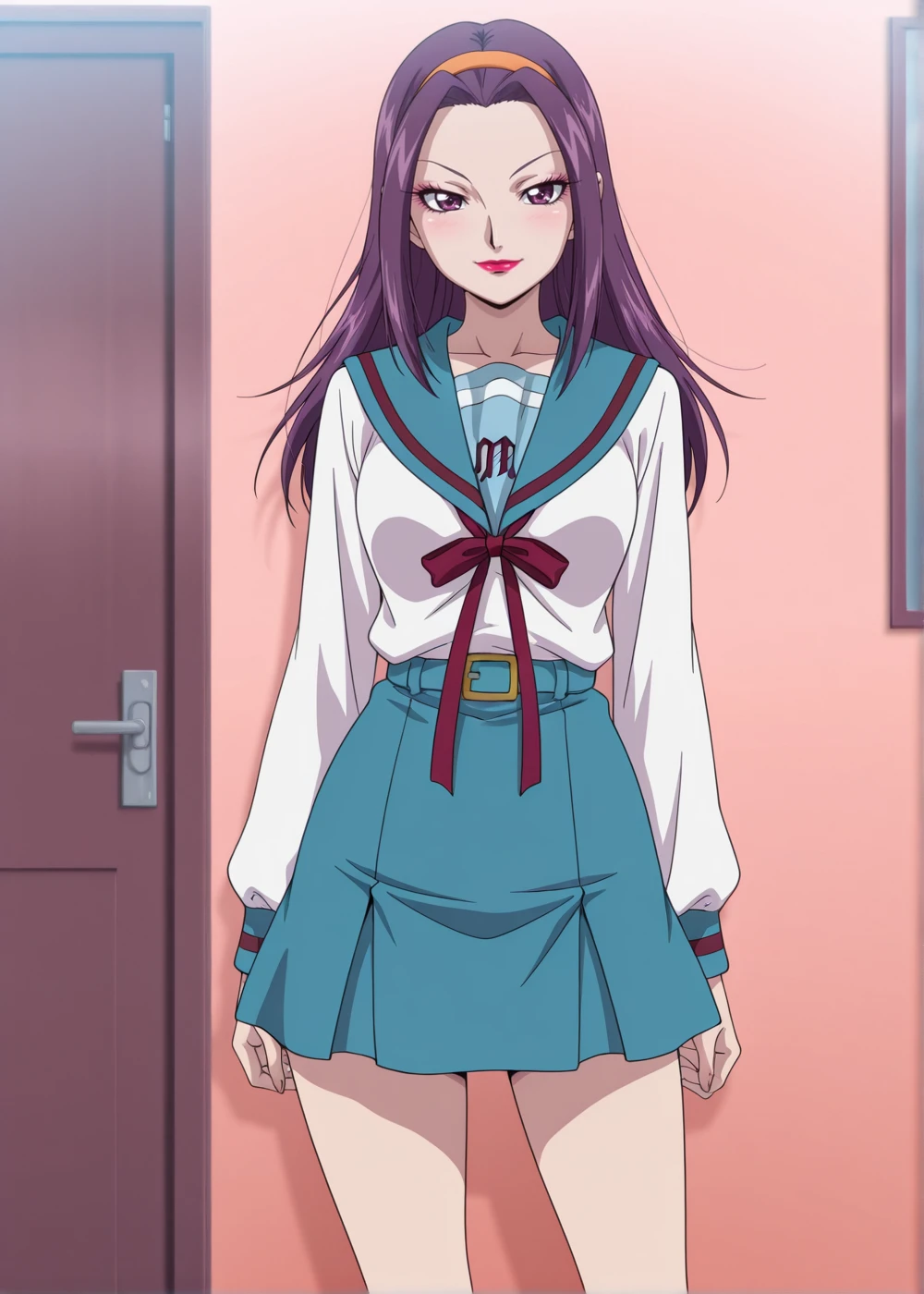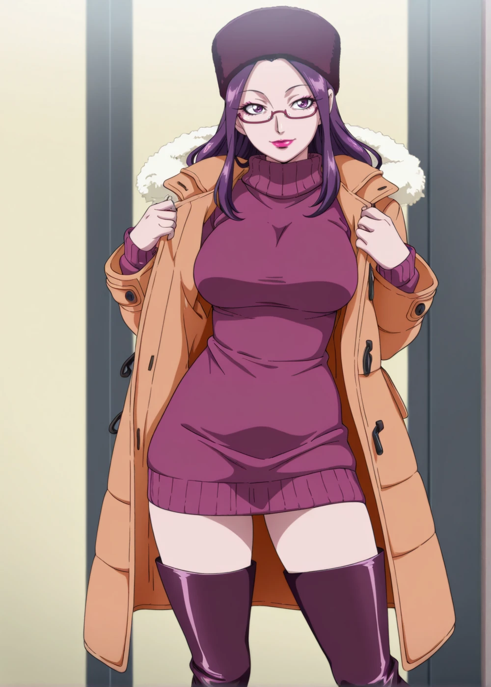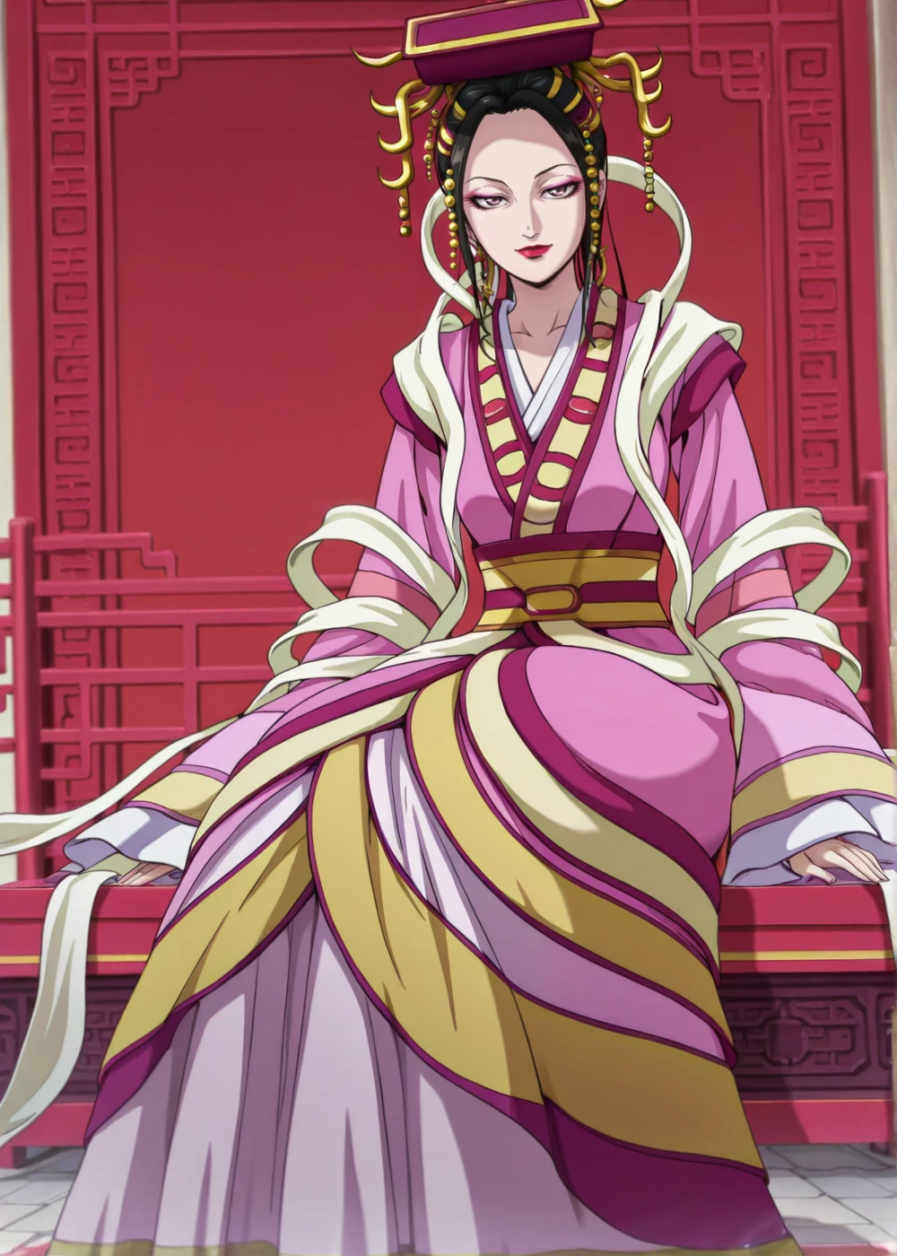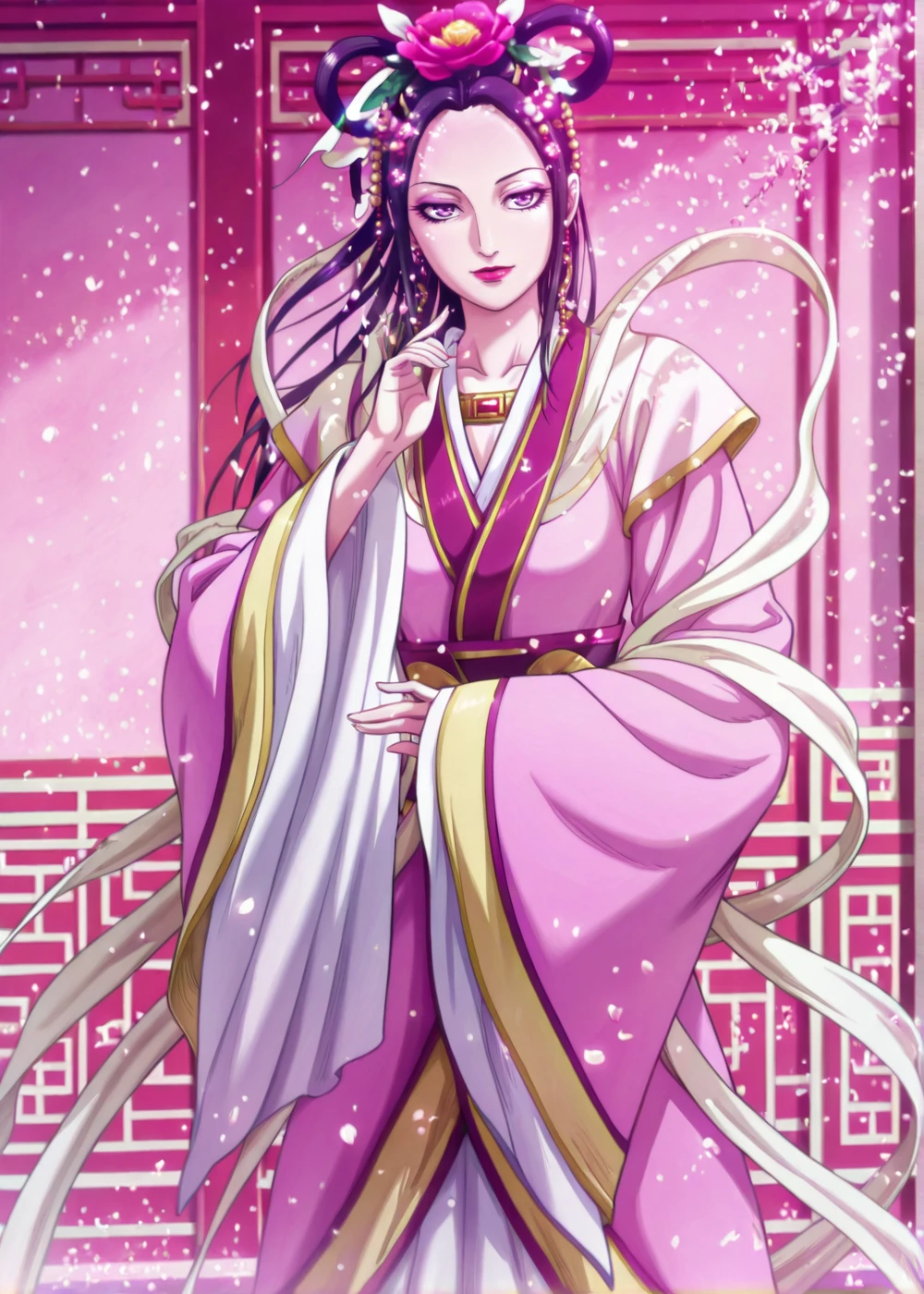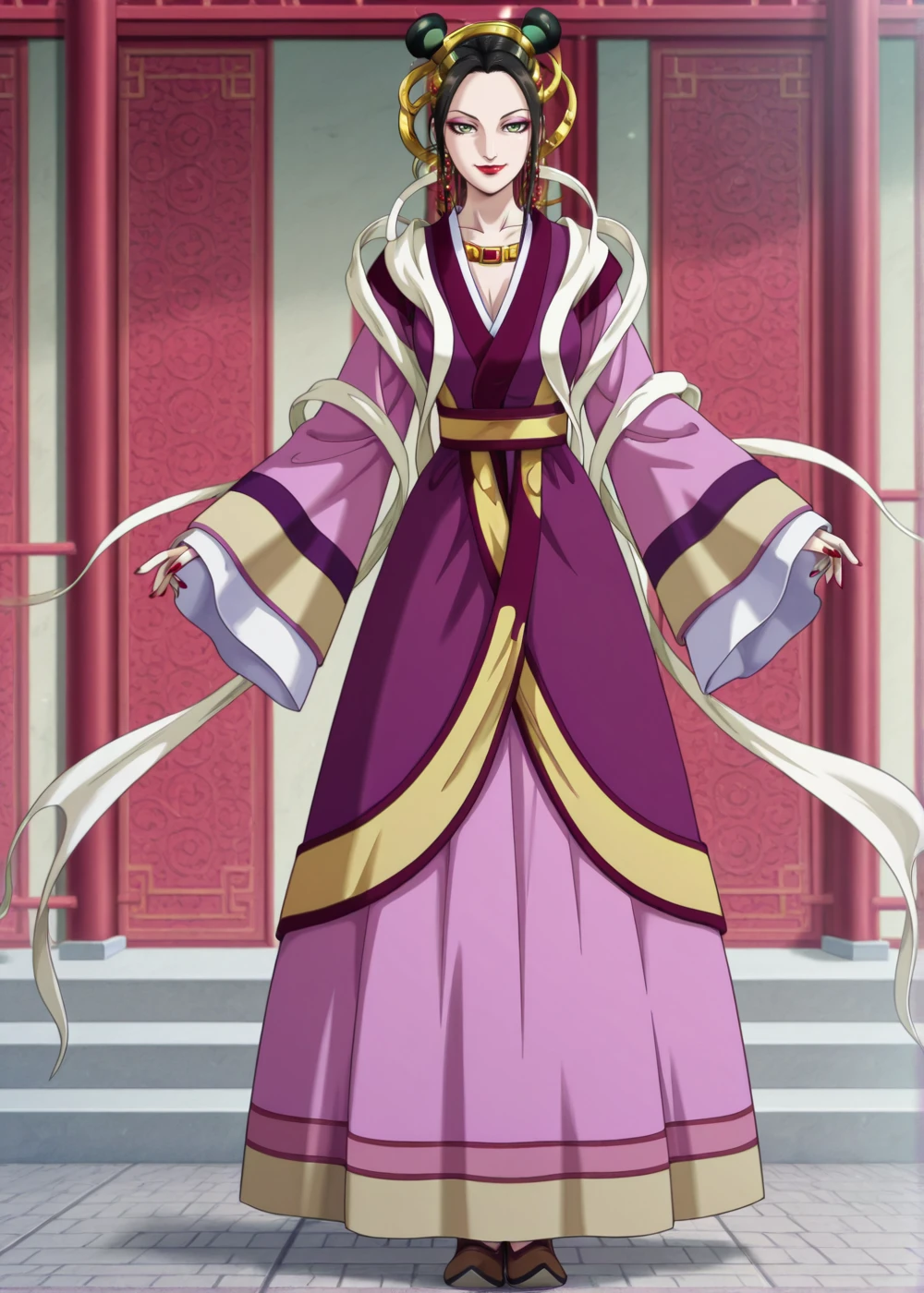 BiKi (Queen Mother), 1girl, solo, long hair, purple eyes, purple hair, makeup, lipstick, eyelashes