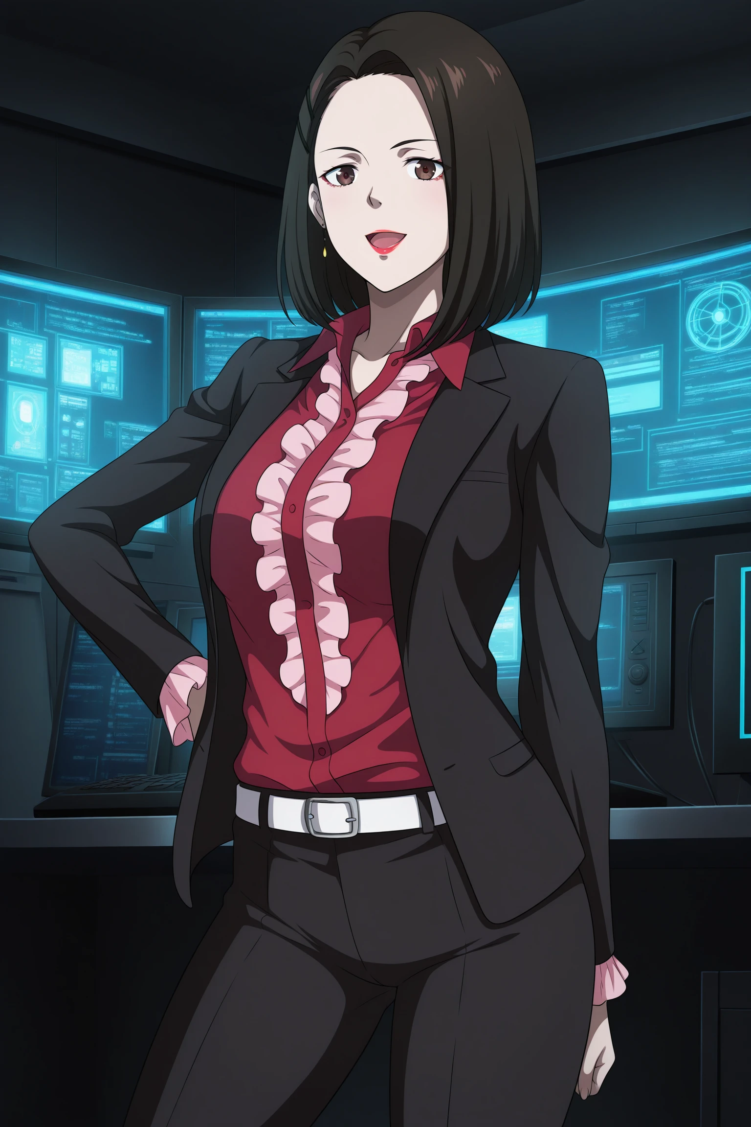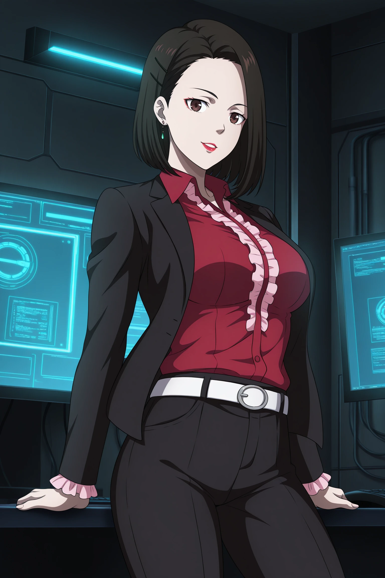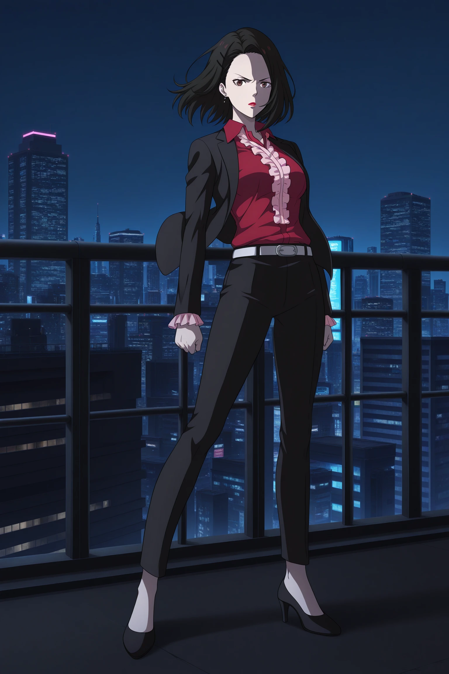 kugatachi nadeshiko, medium hair, black hair, parted bangs, hairpin, brown eyes, red lips, earrings, long sleeves, black jacket, open jacket, red shirt, collared shirt, frilled shirt, frilled sleeves, belt, black pants, black footwear, high heelsDescription