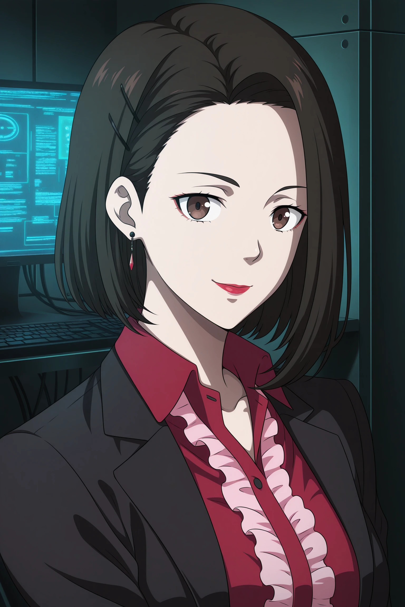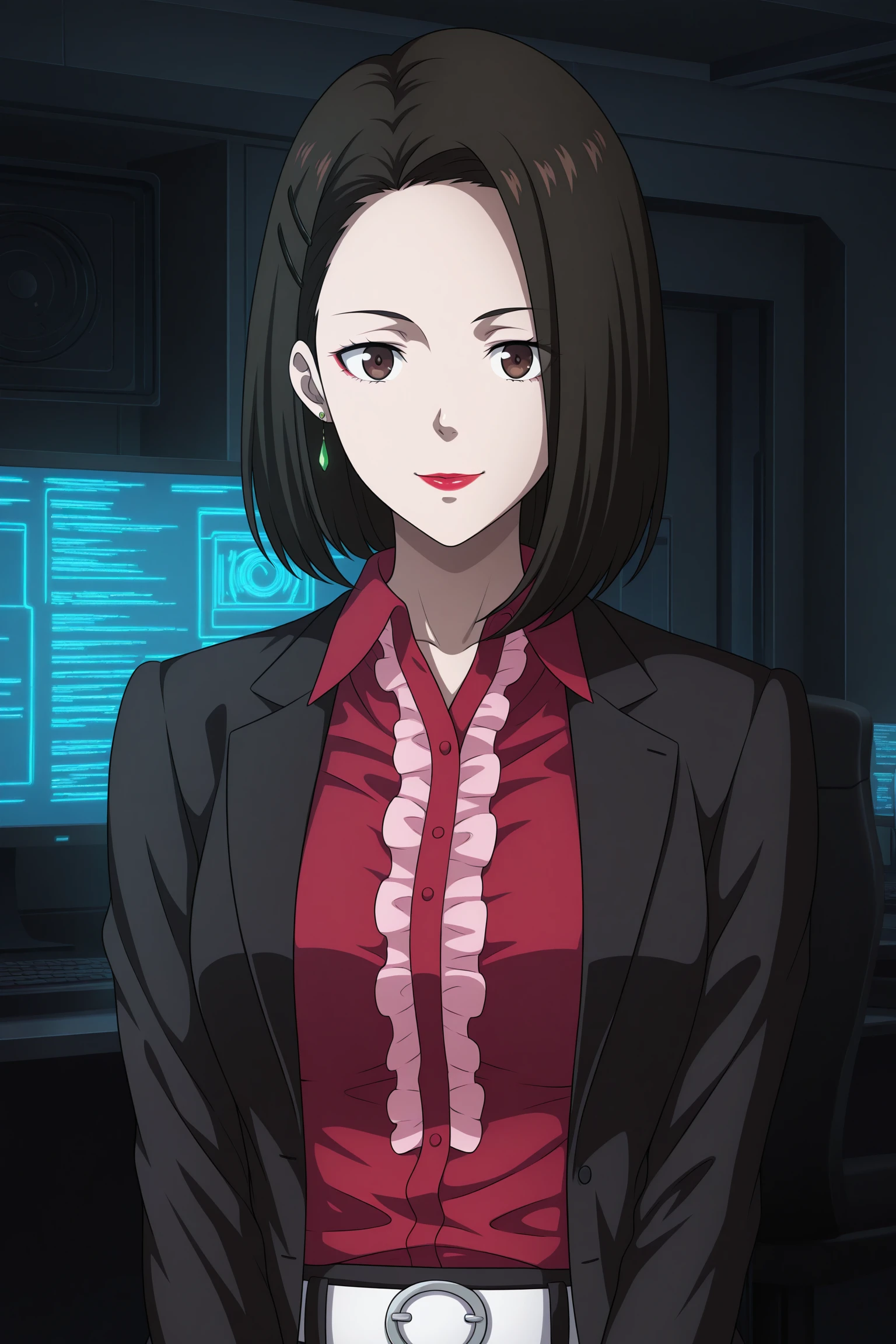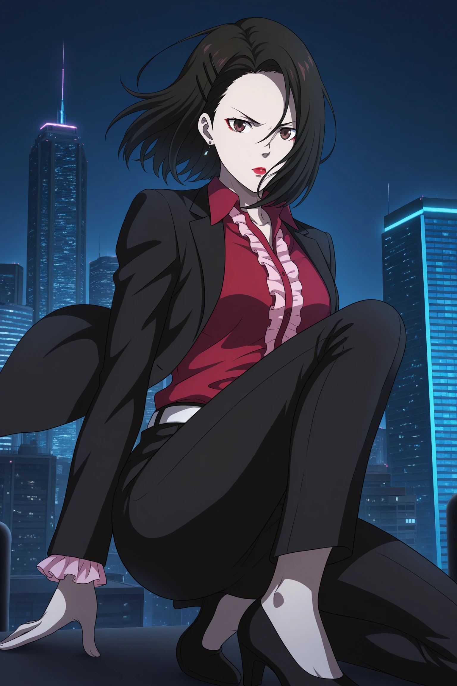 kugatachi nadeshiko, medium hair, black hair, parted bangs, hairpin, brown eyes, red lips, earrings, long sleeves, black jacket, open jacket, red shirt, collared shirt, frilled shirt, frilled sleeves, belt, black pants, black footwear, high heelsDescription