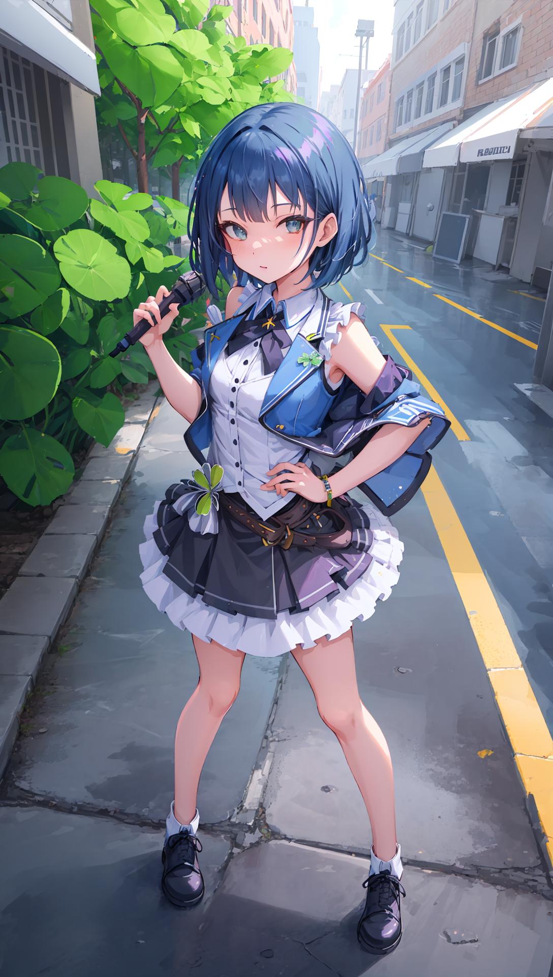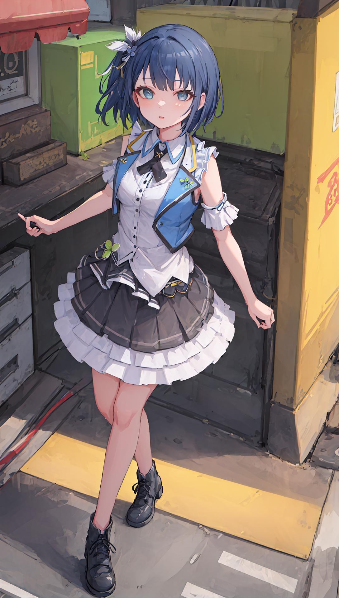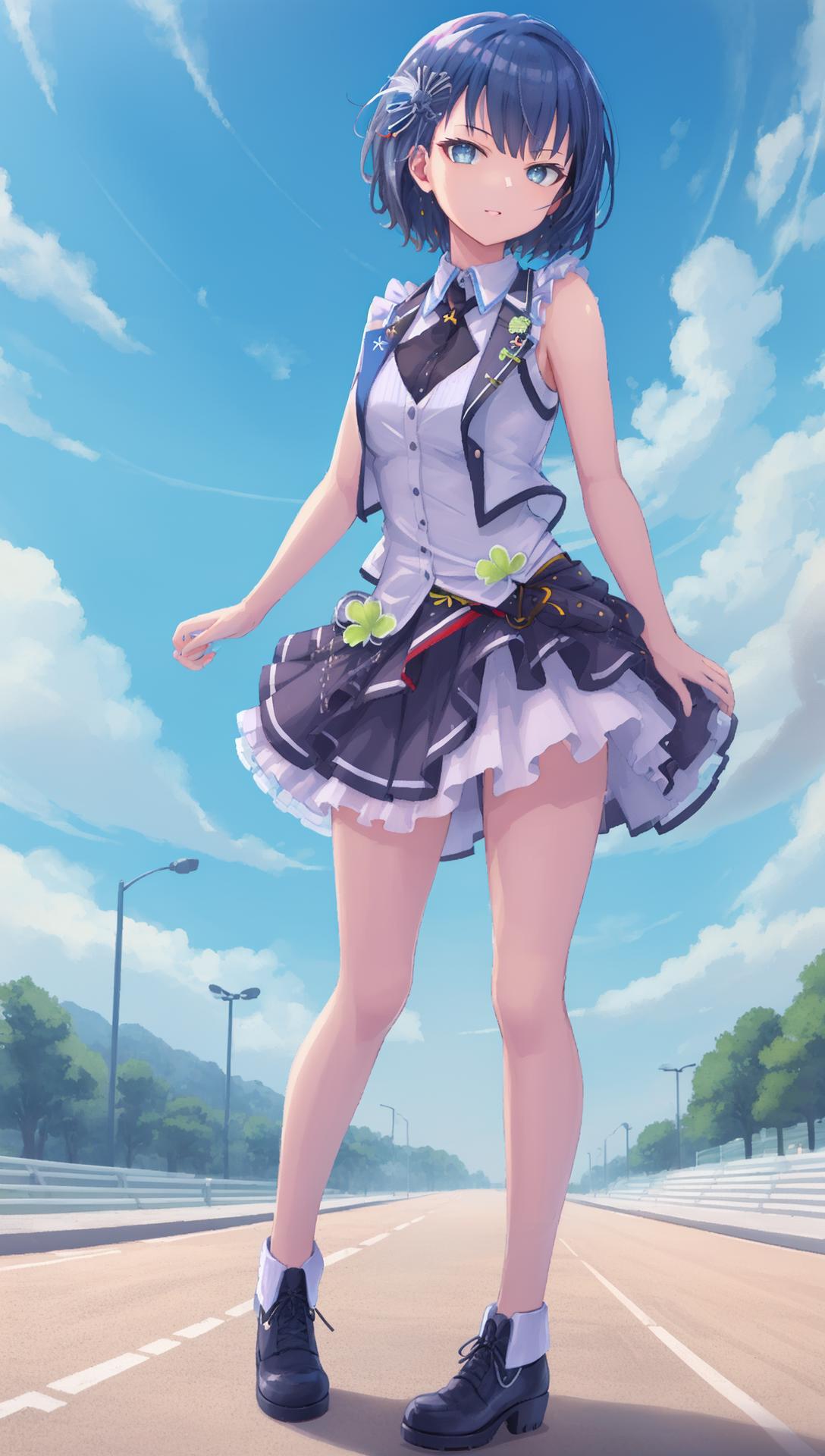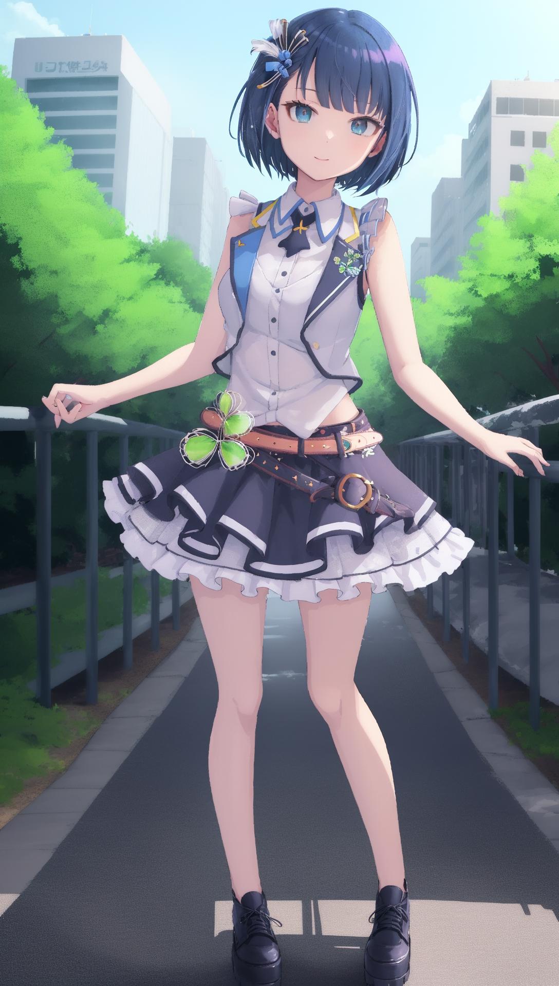 idol clothes,这个是打歌服,其实这套衣服的图比较多,但是质量参差不齐,如果图跑出来离原本的差的比较远,建议手动添加tag:skirt, bow,sleeveless, frilled skirt, idol, shirt, hair bow, white footwear, frills,white shoes, vest, layered skirt, hair ornament,clover